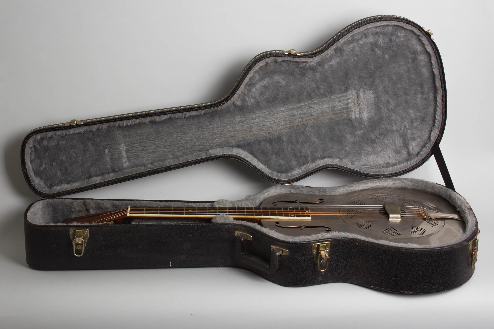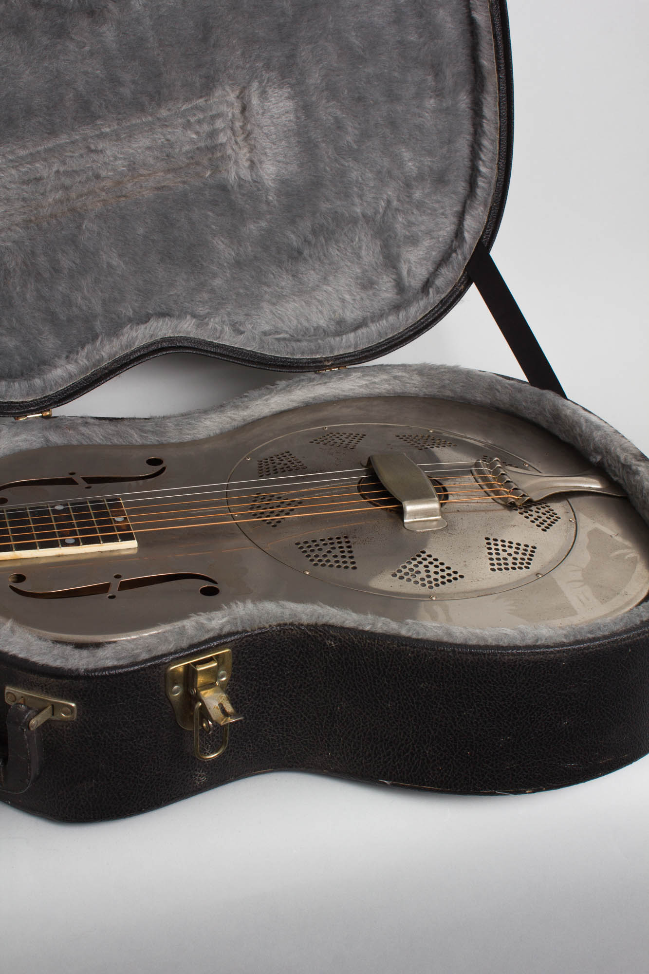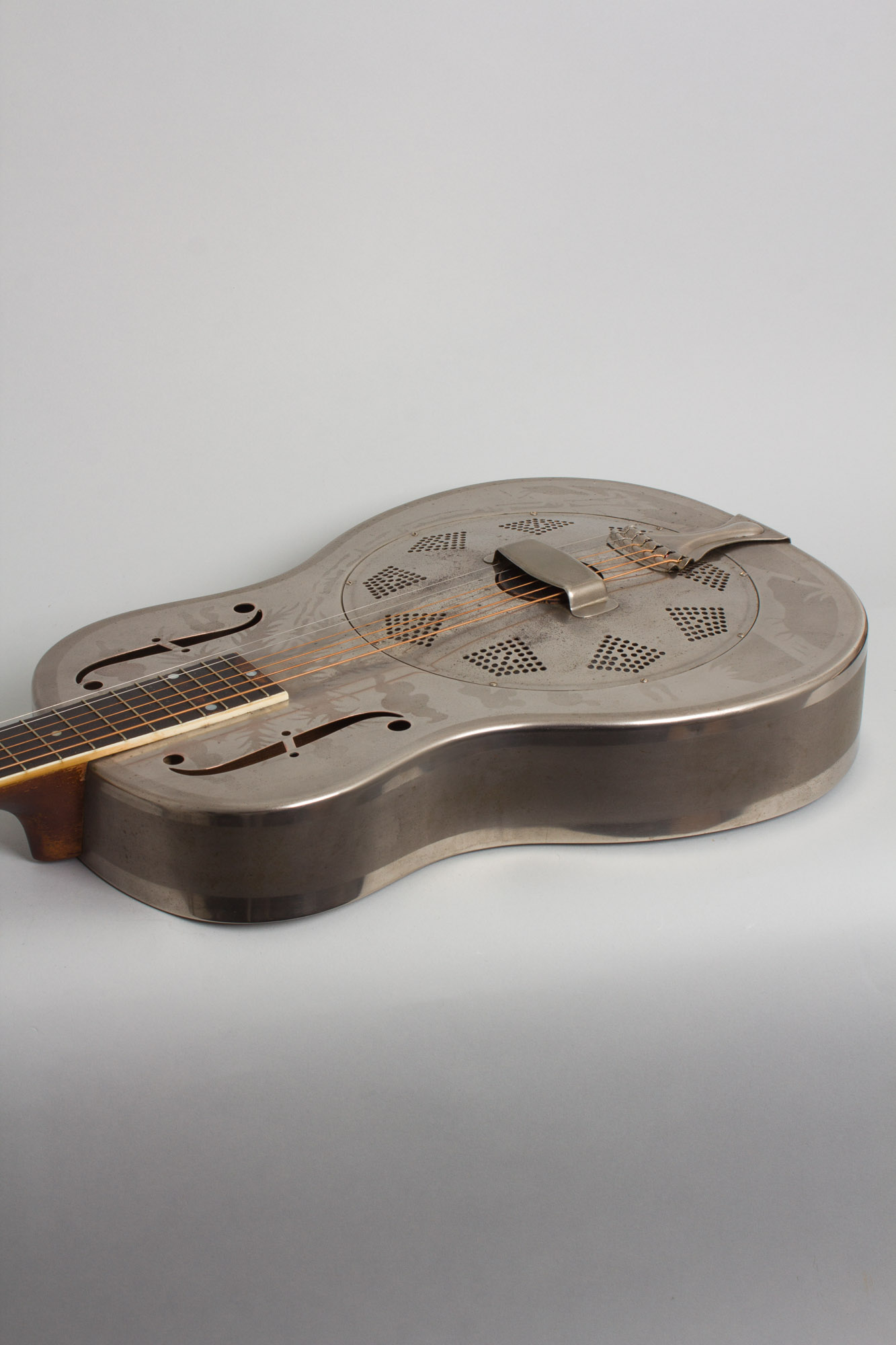 National Style 0 Model Resophonic Guitar (1930), made in Los Angeles, California, serial # S-433, nickel plated finish, brass body, steel coverplate; maple neck with ebonized fingerboard, black hard shell case.