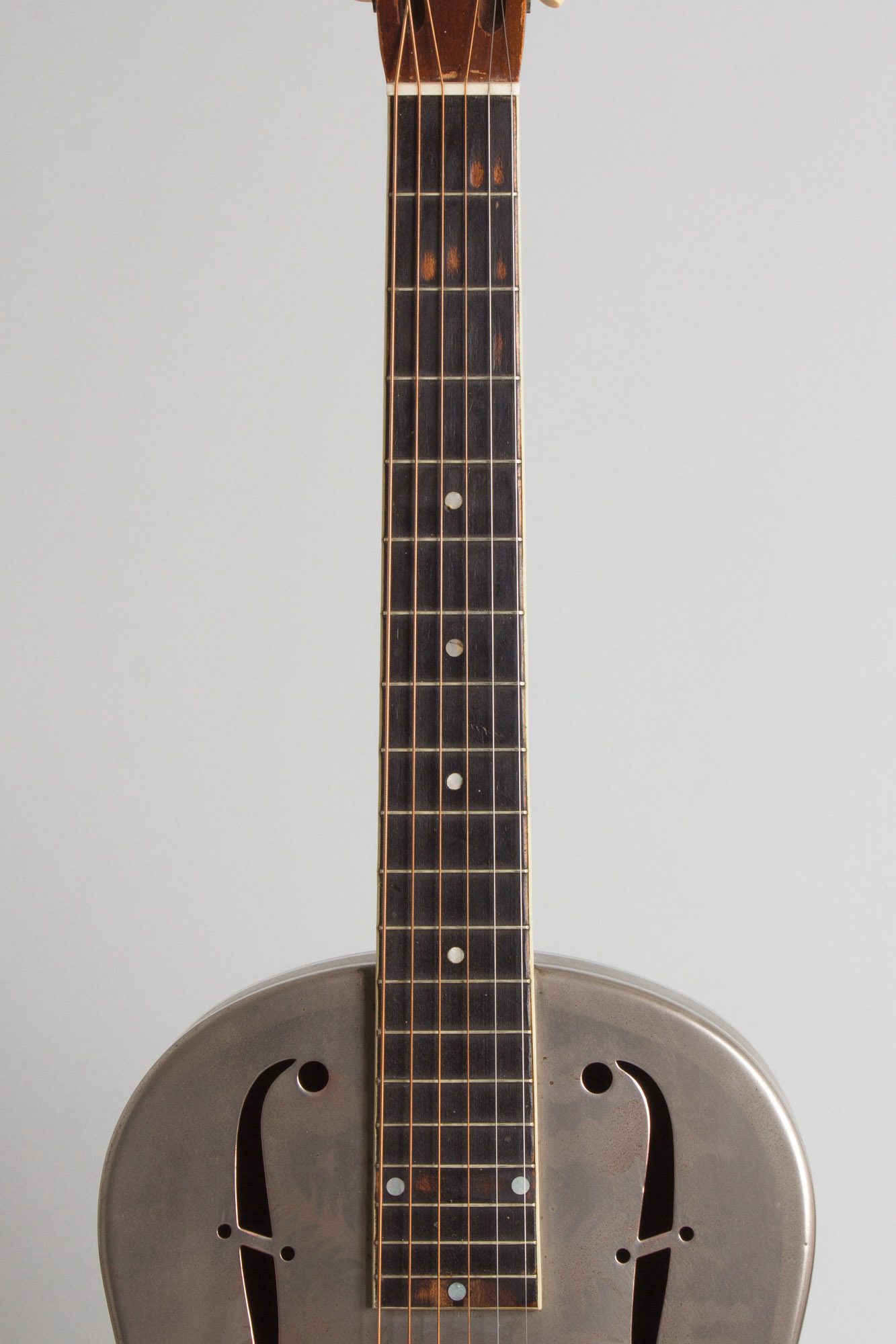 The body is adorned with whimsical sandblasted Hawaiian scenes in variation #1 as per the Brozman book. The maple neck has a bound fingerboard and pearl dot inlay in the "ebonized" fingerboard. The coverplate appears to be made of steel (early Style 0's often mixed brass and steel parts) in the earliest style with no raised ribs, and the f-holes are the original "flat-cut" style. In 1930 this guitar was sold at $62.50, half the price of as Tricone Style 1. Although that for many Americans a considerable sum at the time, the Style 0 was hard to beat for its combination of volume, tone, and beauty even in those economically tough times. 95 years on the Style 0 remains an enduring classic; a favorite of many players then and now, especially for period musical styles with the spotlight on early blues.