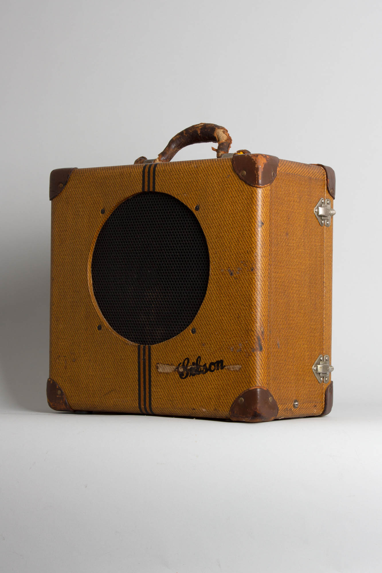 This is a very well-preserved and fine-sounding example of the world's first great guitar amplifier, Gibson's EH-150. This amp is the 1936 variant, a monumental improvement from the fairly primitive predecessors that would set the foundation for the "round shouldered" versions to follow. This "second revision" EH-150 is still in a smaller rectangular cabinet without the domed upper edge that soon became the model's signature look. The gold/brown tweed cabinet cover has orange and black vertical stripes in the center, with a black script Gibson logo in the lower right hand corner. The compact square cabinet has leather-covered corners and round hard rubber feet, with a leather-covered handle at the top. The round front speaker aperture is covered by a black metal grill.