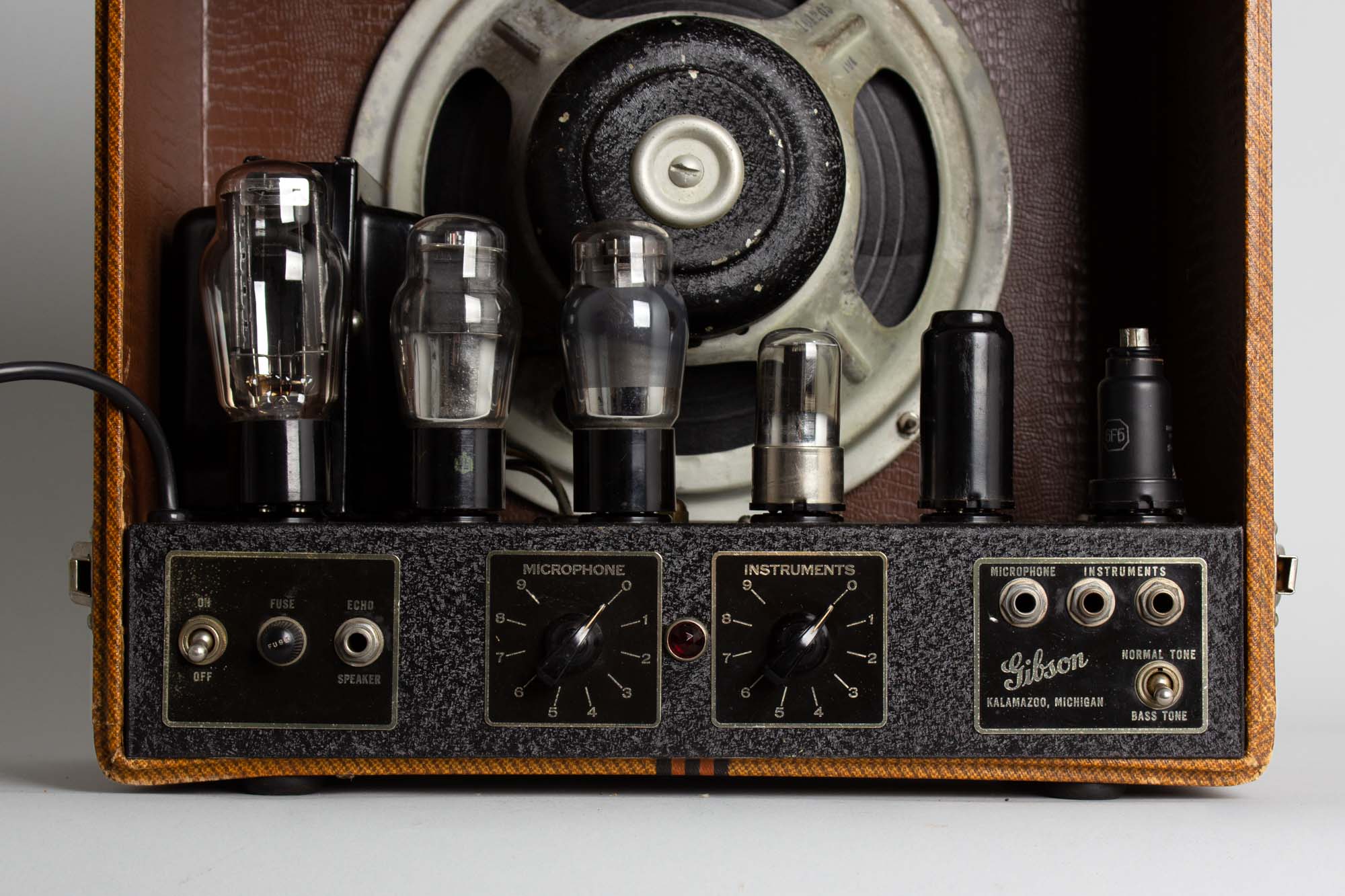 The detachable latched-on back cover reveals the chassis mounted on the bottom with a deco-styled control panel. This lays out left-right with an on/off switch, fuse, "echo speaker" output jack, microphone volume, instruments volume, a microphone input and two instrument inputs, as well as the "bass tone" switch, changing the low-end response of the amp. Many of these were firsts for what was featured on a compact professional amplifier. The Echo feature is a particularly novel idea: the true "Echo effect" is obtained by keeping the amplifier with its built-in speaker near the player and the extension "Echo" speaker at an approximate 35-foot distance, preferably further from the audience and to either side. The slight soundwave lag time creates what Gibson called "a new and beautiful effect". The dual 6N6-G push-pull power section puts out around 15-20 watts into a 10" field coil speaker.