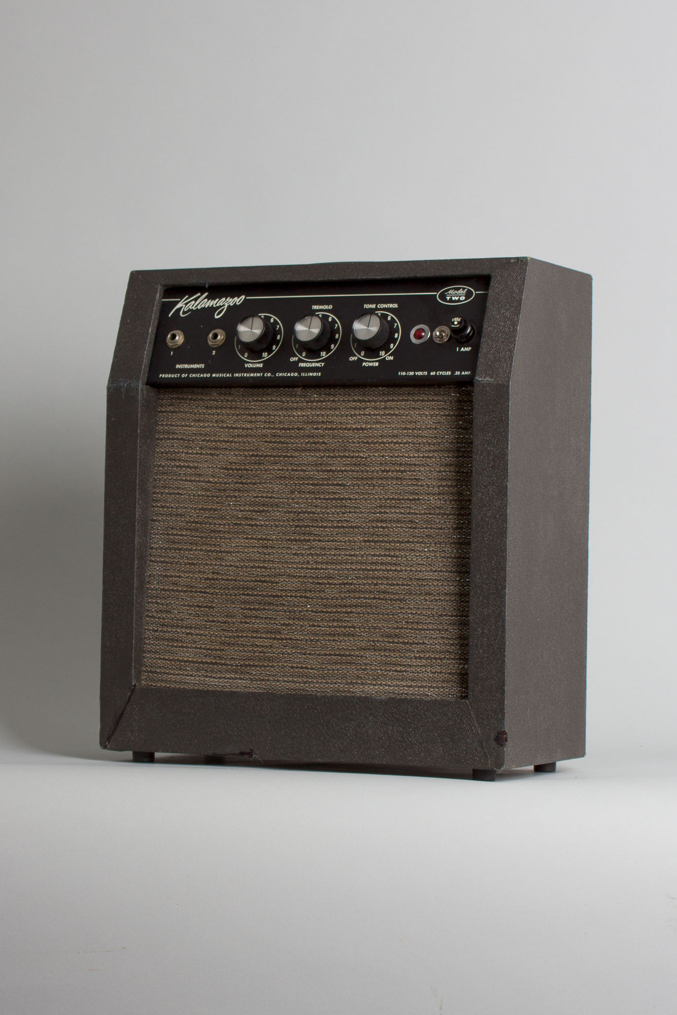 Gibson and its various parent companies have used the Kalamazoo brand several times over the last nine decades; one of the best known was the mid-1960s budget electric line from Chicago Musical Instruments (CMI), Gibson's parent company. These little practice/student amps appear with two model designations, Model One and Model Two, the latter having the addition of an onboard tremolo effect. This model thus features a dedicated speed knob (the depth was fixed) in addition to the two "loudness" and tone controls. These two circuits were also at one point featured in the Gibson-branded Skylark GA-5 and GA-5T, respectively (not to be confused with the earlier Les Paul-amp adjacent GA-5, which is basically Gibson's take on a Fender Champ).