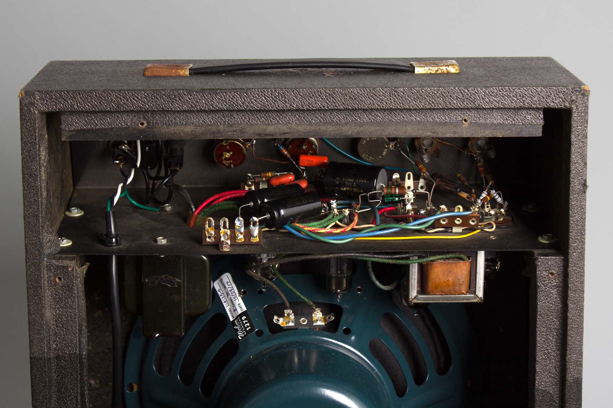 Externally, this amp remains in very good shape, especially considering the cabinet's proneness to wear. Apart from moderate scuffing along some of the edges and corners, the thin fabric covering is generally well-intact. Both the baffle and grille cloth are structurally sound and in excellent shape with no visible tearing; only light staining. The faceplate is very clean and all three of the rare (and often lost) oversized knobs are present as well. The original handle is present and the mounting hardware shows moderate corrosion.