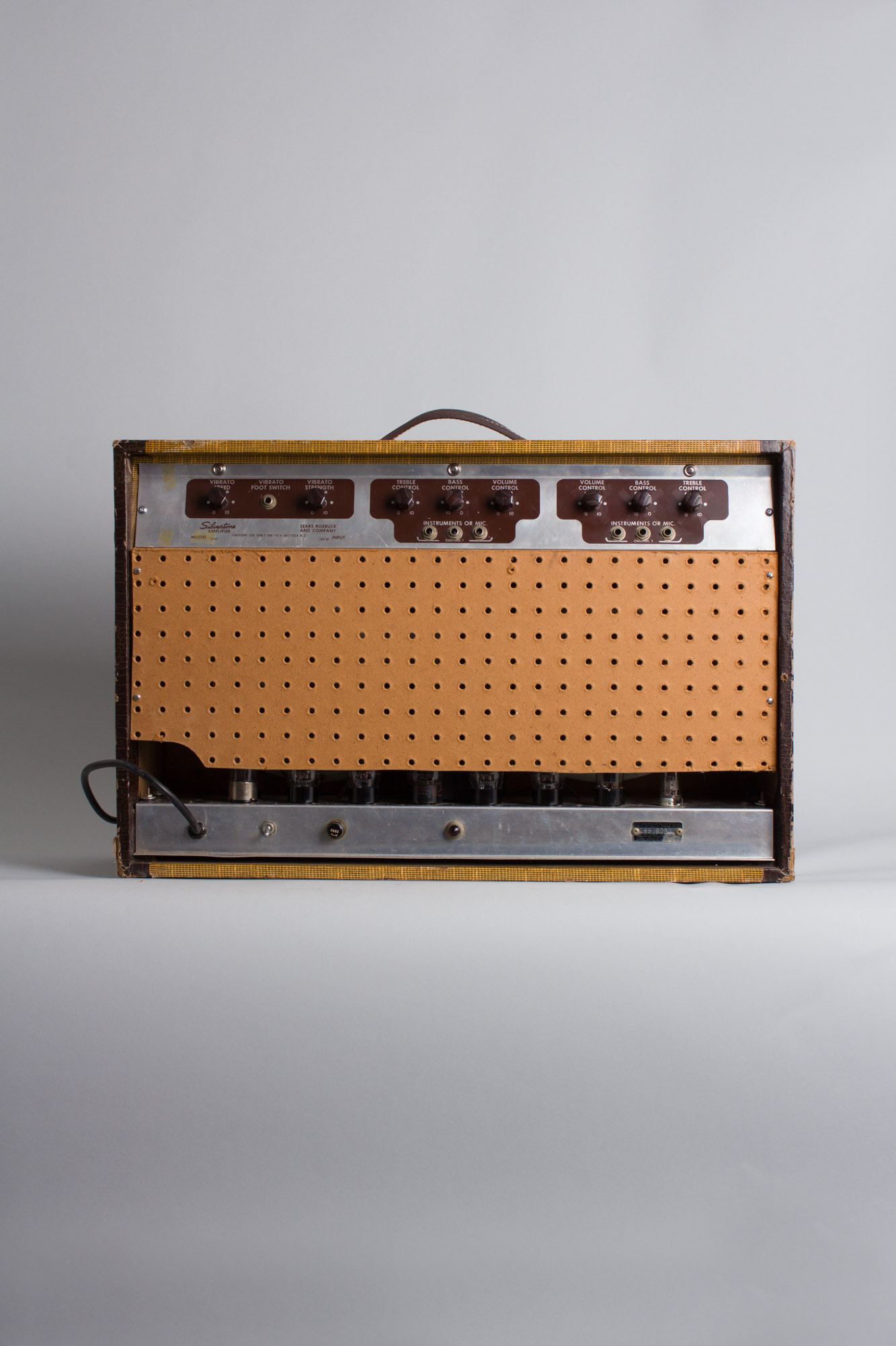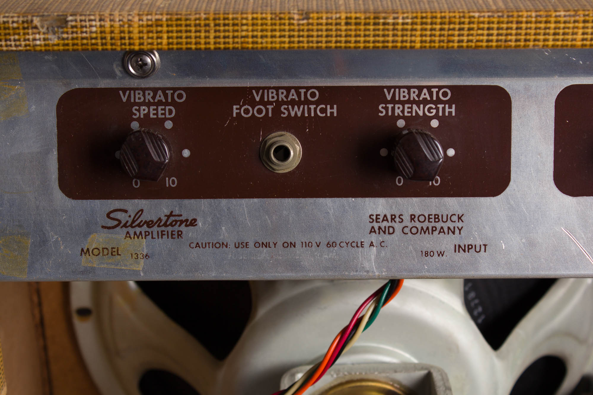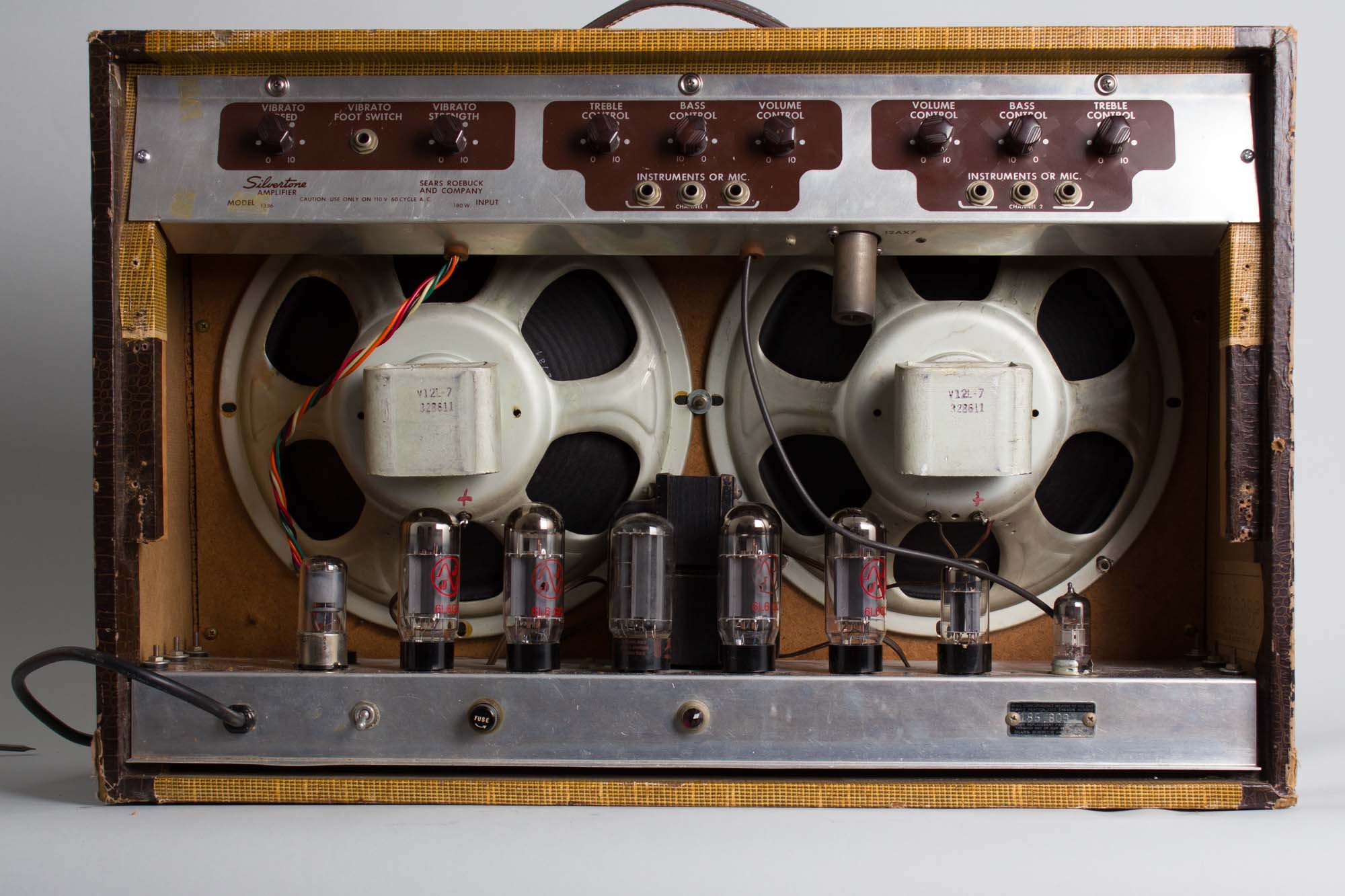 This is a wonderful example of the Silvertone Model 1336 twin amp, one of the best and rare pieces in this brand history This amp was top of the line for the first full line of Danelectro designed and built amps for the Sears catalog 'Silvertone' brand. This connection lasted from the 1950s well up into the '60s and resulted in some of the most popular guitars and amps of their day for beginners, but this amp was a pro-grade product -- at least for sears!