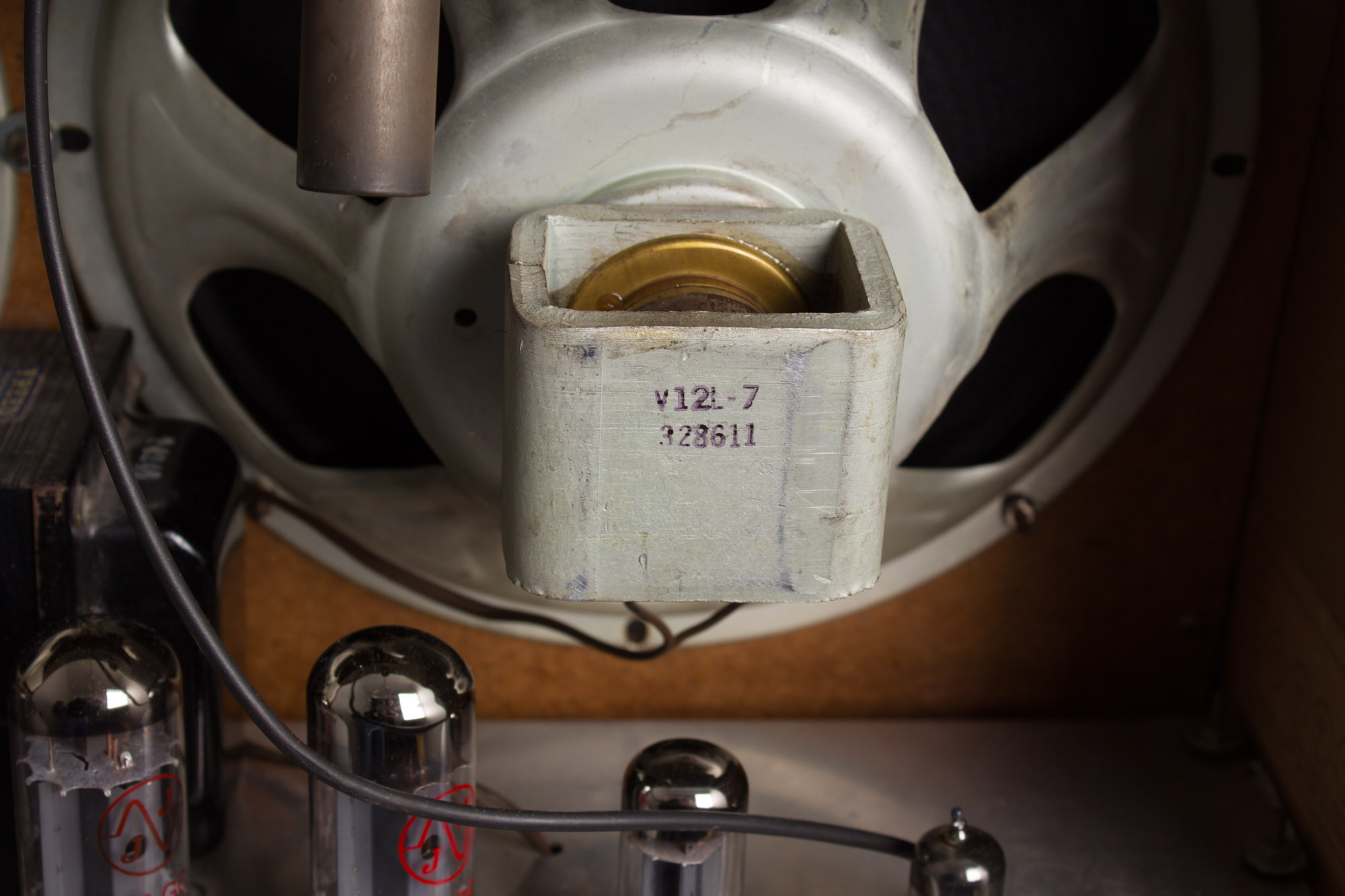 Electrically, the amp is nicely original. The two 12" Utah alnico speakers are original and bear the code 328-611, dating them both to the 11th week of 1956. The speakers have both been reconed professionally and sound and test fabulous. The Freed Transformer Co. power transformer is original as well. The amp has received our typical maintenance and servicing, including a grounded 3-prong power cord, replacement of all electrolytic capacitors, cleaning of all sockets, pots and jacks and output tubes biased to spec.