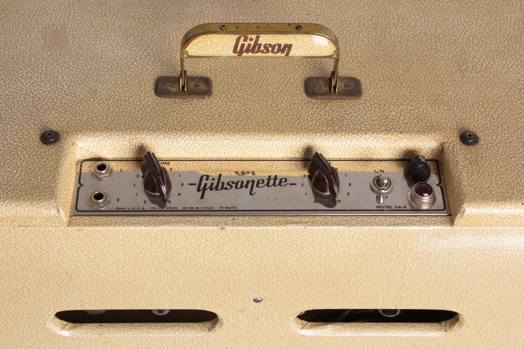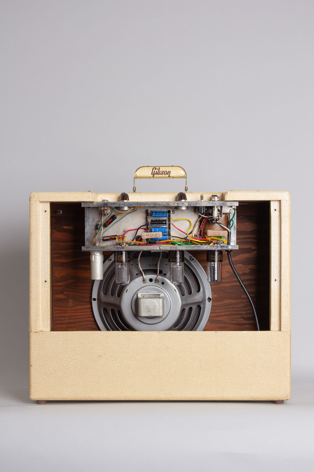 This period may well be the best for Gibson amps, soundwise anyway. This very sturdily built combo has a more Fender-like overdrive sound than earlier darker toned Gibson amps but still maintains its own character. Just 1298 of these high quality but affordable amps were shipped in 1960, most with the newer space-age name. That year the tremolo equipped GA-8T joined the line, noticeably cutting into the sales of this non-trem model.