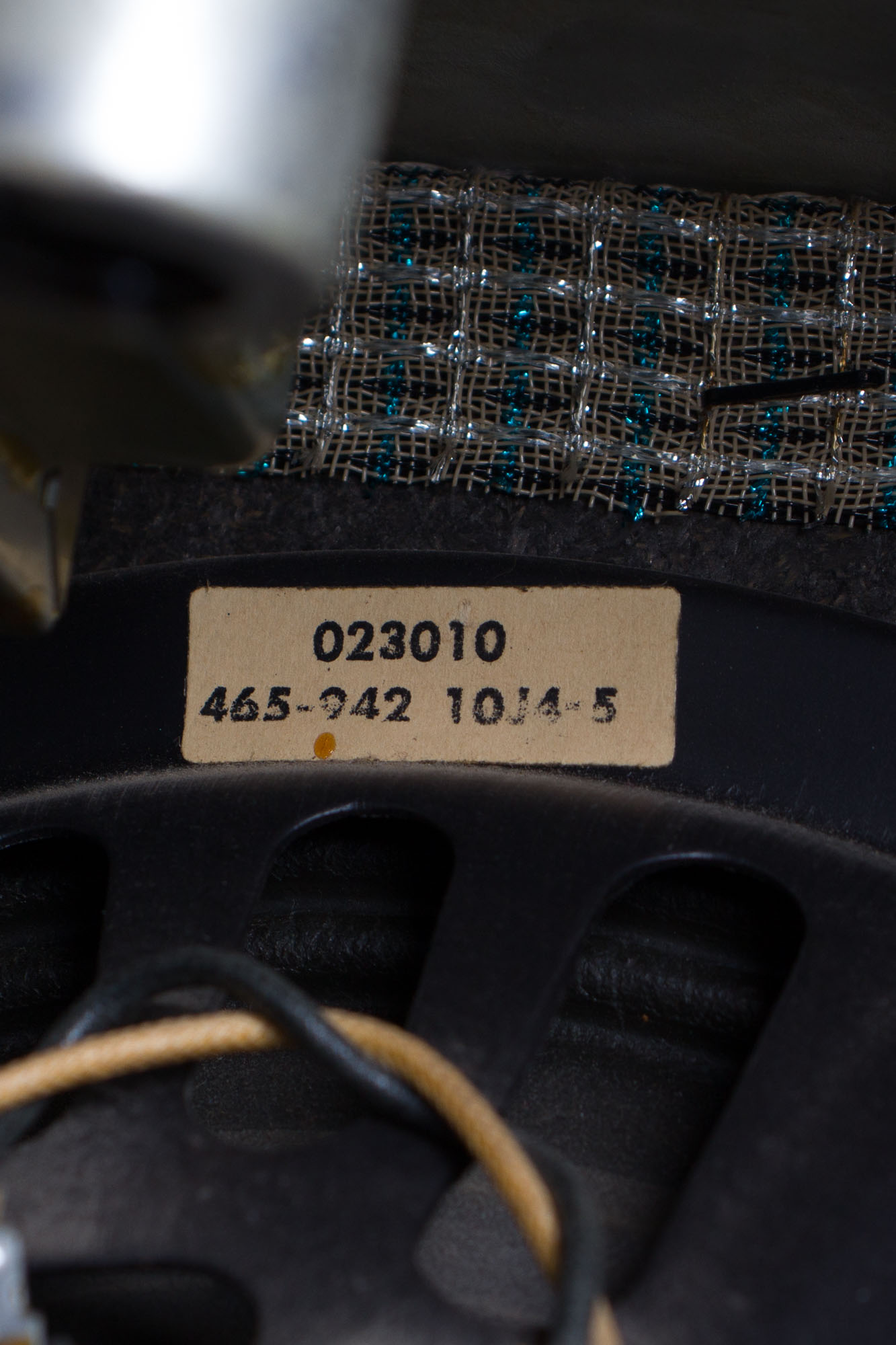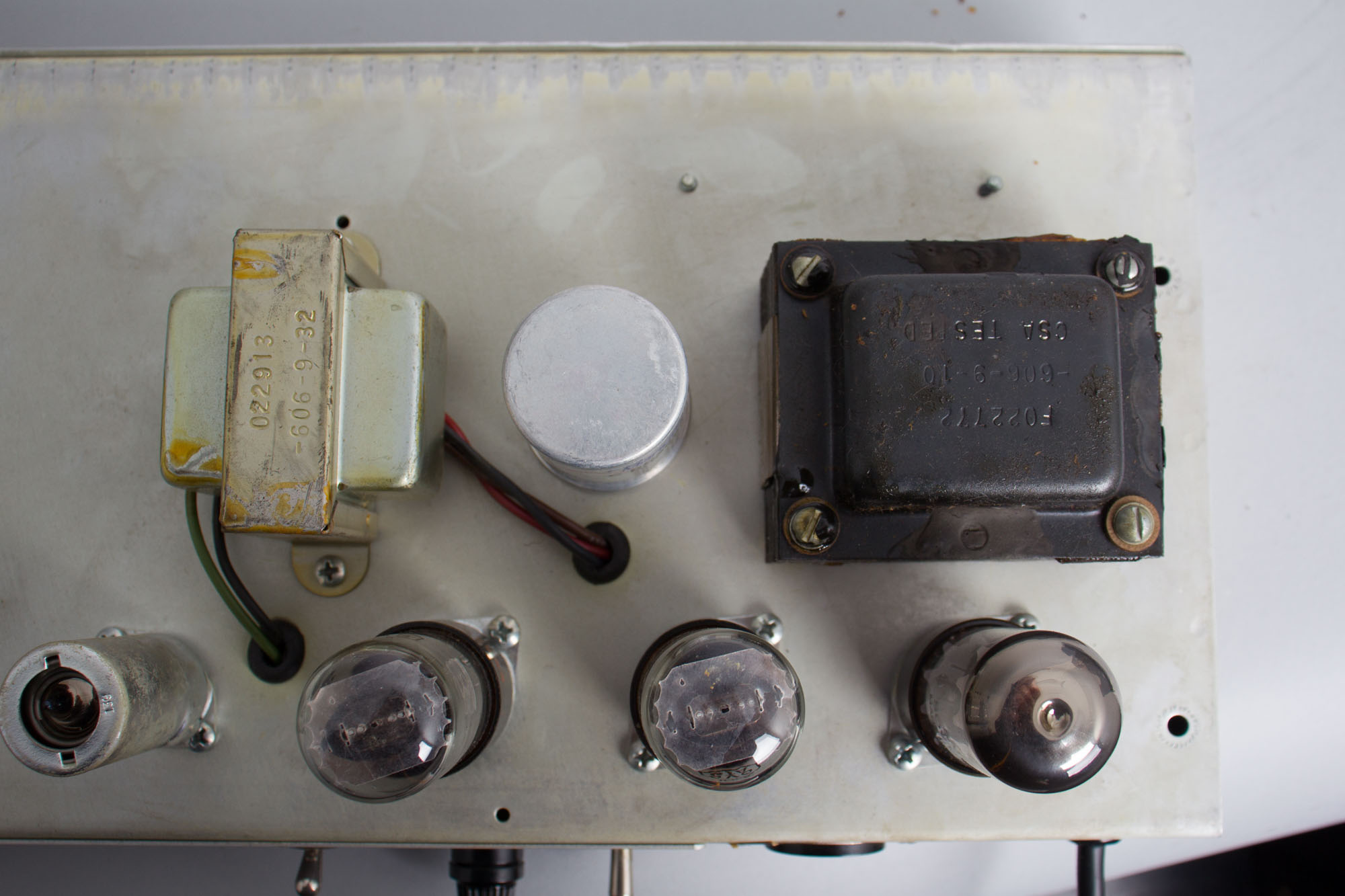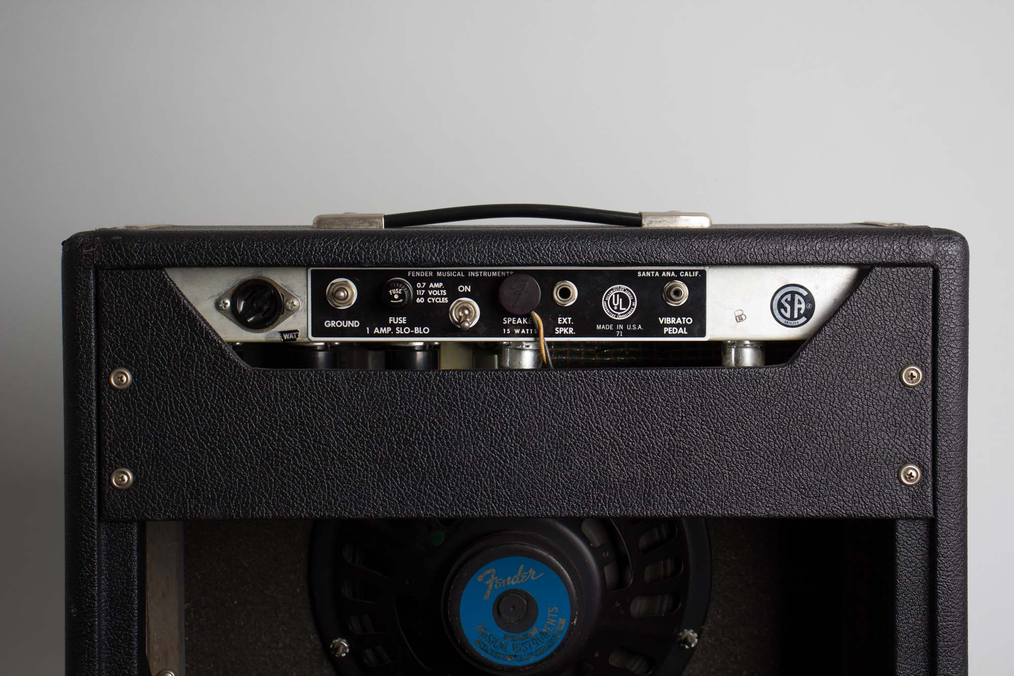 Externally this amplifier is very well preserved for its age. The black Tolex covering is very clean overall with relatively minor sings of wear. The faceplate has some light scuffing, but is overall in good shape and with all the stenciled lettering is still intact. The plastic Fender logo is present and the grille cloth is very well-preserved with one minor tear toward the bottom. The chassis straps and hardware to the original handle show typical minor signs of corrosion and staining but overall remain in good shape.