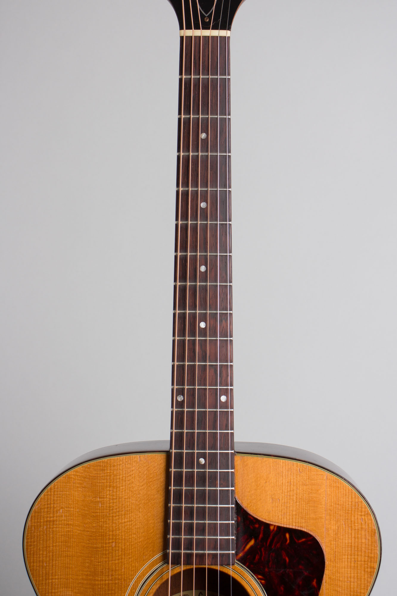 The often very fine sounding Guild flattops of the 1960's are surprisingly hard to find these days, despite being a fairly popular choice in their day. This is a 1963 natural-top F-30, the midline, mid-size model in Guild's flat top line. The F-30 stood in the company's line above the all mahogany M-20 (famously regarded as the "Nick Drake" guitar) and F-20, the same size and shape with a spruce top. The larger F-30 is generally similar in layout to a Martin 000-18, but with a somewhat different body shape owing something to Gibson's narrow-waisted jumbo guitars. The back, sides and neck are mahogany with a spruce top and rosewood fingerboard and bridge.