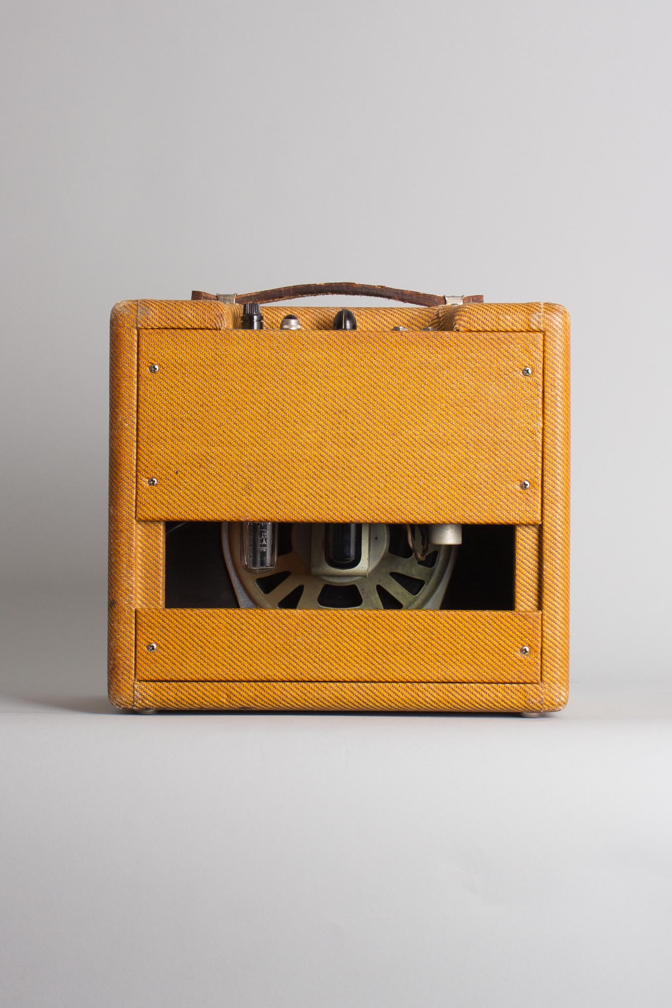 The serial number is C20380, indicating Fender had so far built nearly 20,000 examples of this classic model in just over 7 years! This 5F1 features the slightly larger cabinet and an 8" speaker, an upgrade from earlier mid-50s models. As with any tweed Champ, it features just one "chicken head" volume knob and a single-ended 6V6-driven power section, yielding about 5 watts of output power. Like pretty much all of them, it sounds fantastic!