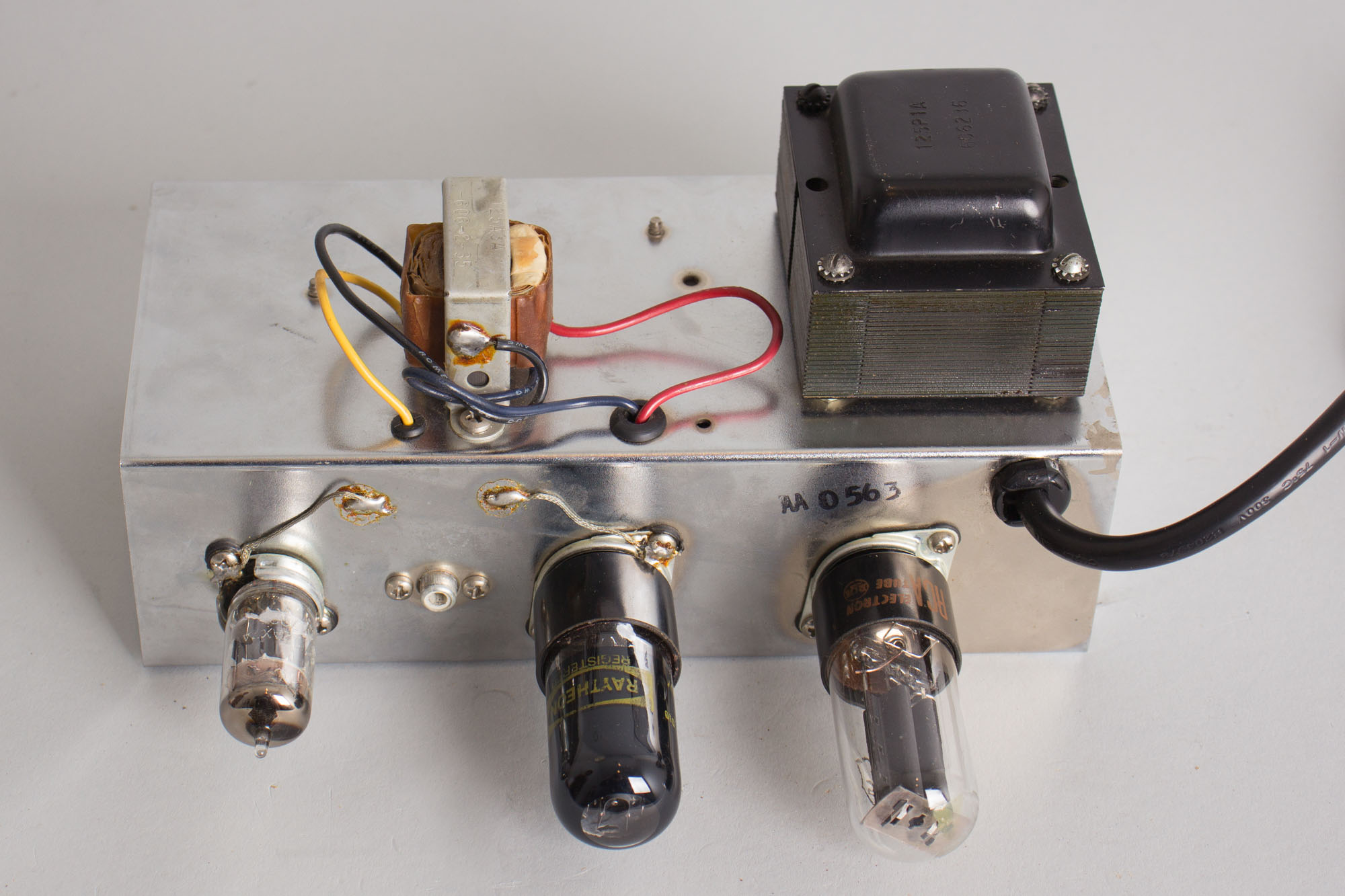 Externally, this cabinet is in fantastic shape for a nearly 62-year-old amplifier. The rather frail Tweed covering sports a very attractive amber patina with some typical edge wear and minor scuffing overall. The faceplate is beautifully clean, save for some very light wear and some of the stenciled numbers partially missing around the volume control. The grille cloth is in great shape with no notable tears or fraying and even the original leather handle is present and still has plenty of life left in it. The amp comes with what appears to be its original Victoria Luggage Co. cover, which is in truly fantastic shape!