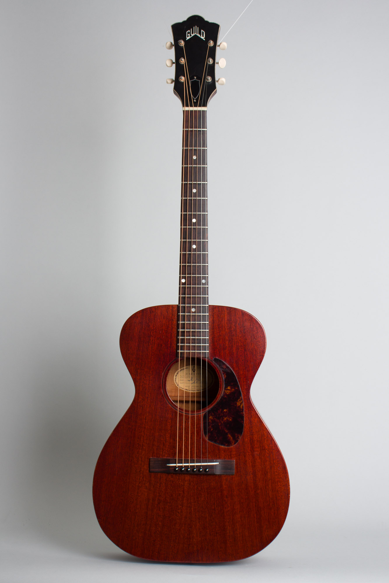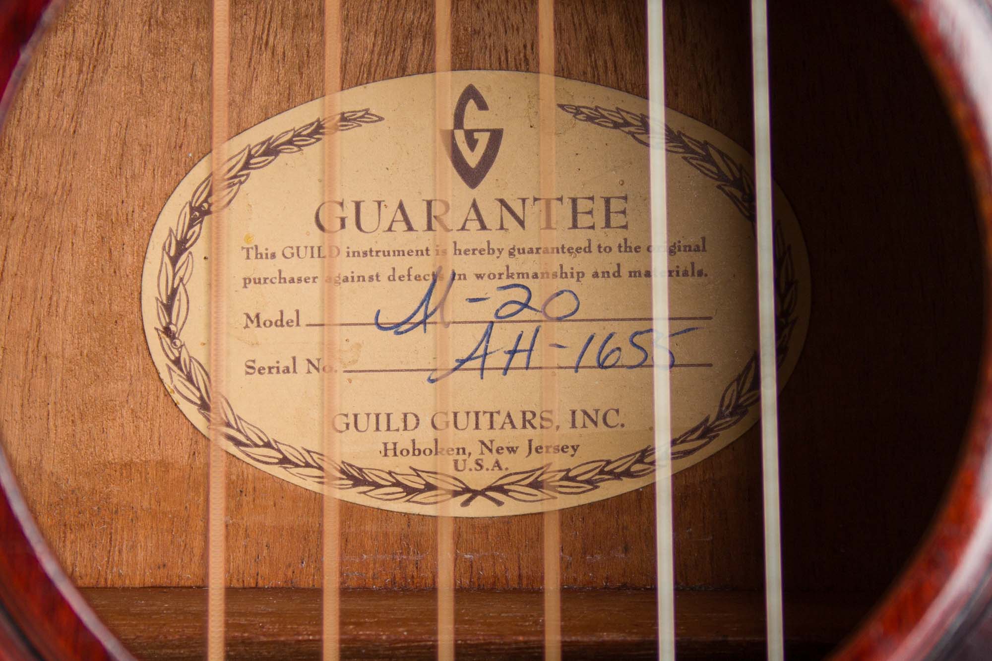 Guild M-20 Model Flat Top Acoustic Guitar (1965-6), made in Hoboken, NJ, serial # AH-1655, dark mahogany finish, mahogany body and neck, rosewood fingerboard, black hard shell case.