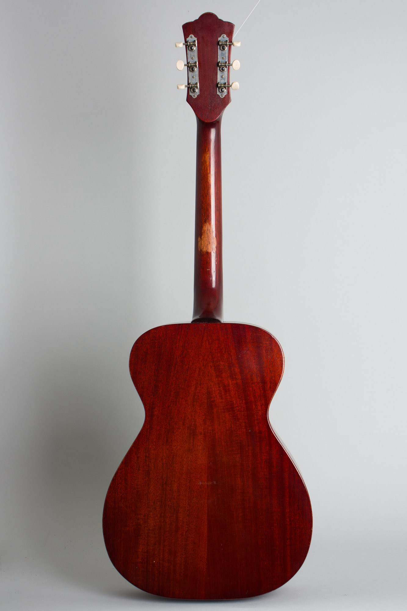 A small body all-mahogany guitar, the M-20 has a different tonal character from any other Guild and excels particularly as a fingerpicking instrument. This mid-60's model is very lightly built, especially for a Guild! The neck is slim and comfortable, somewhat in between typical Martin and Gibson spec. of the period. The tuners are Waverly openback strip gears, fairly basic but still better than the Japanese tuners Guild substituted a bit later on. Arguably this is a better guitar of this type than either of those companies were producing in 1965.
