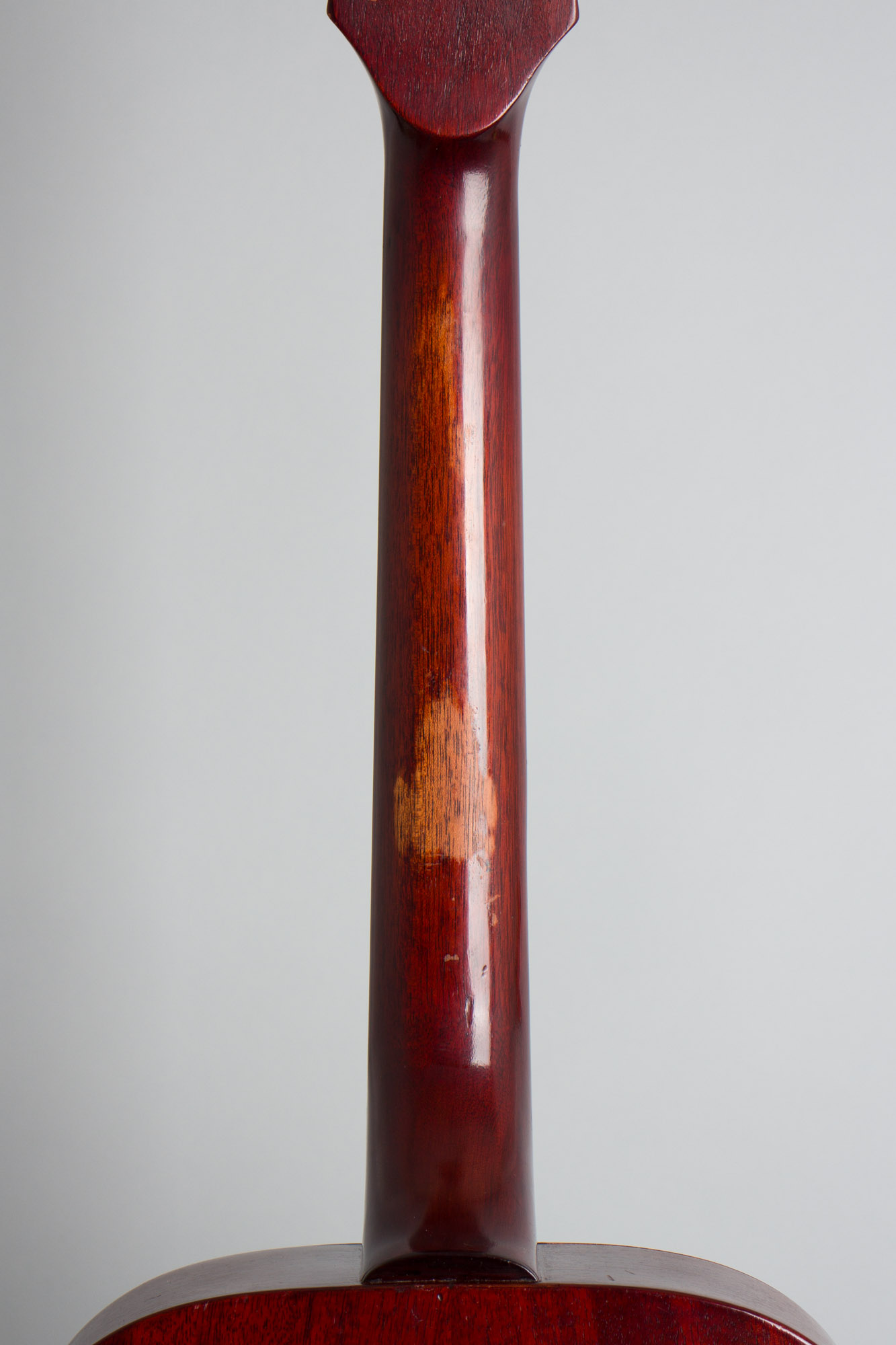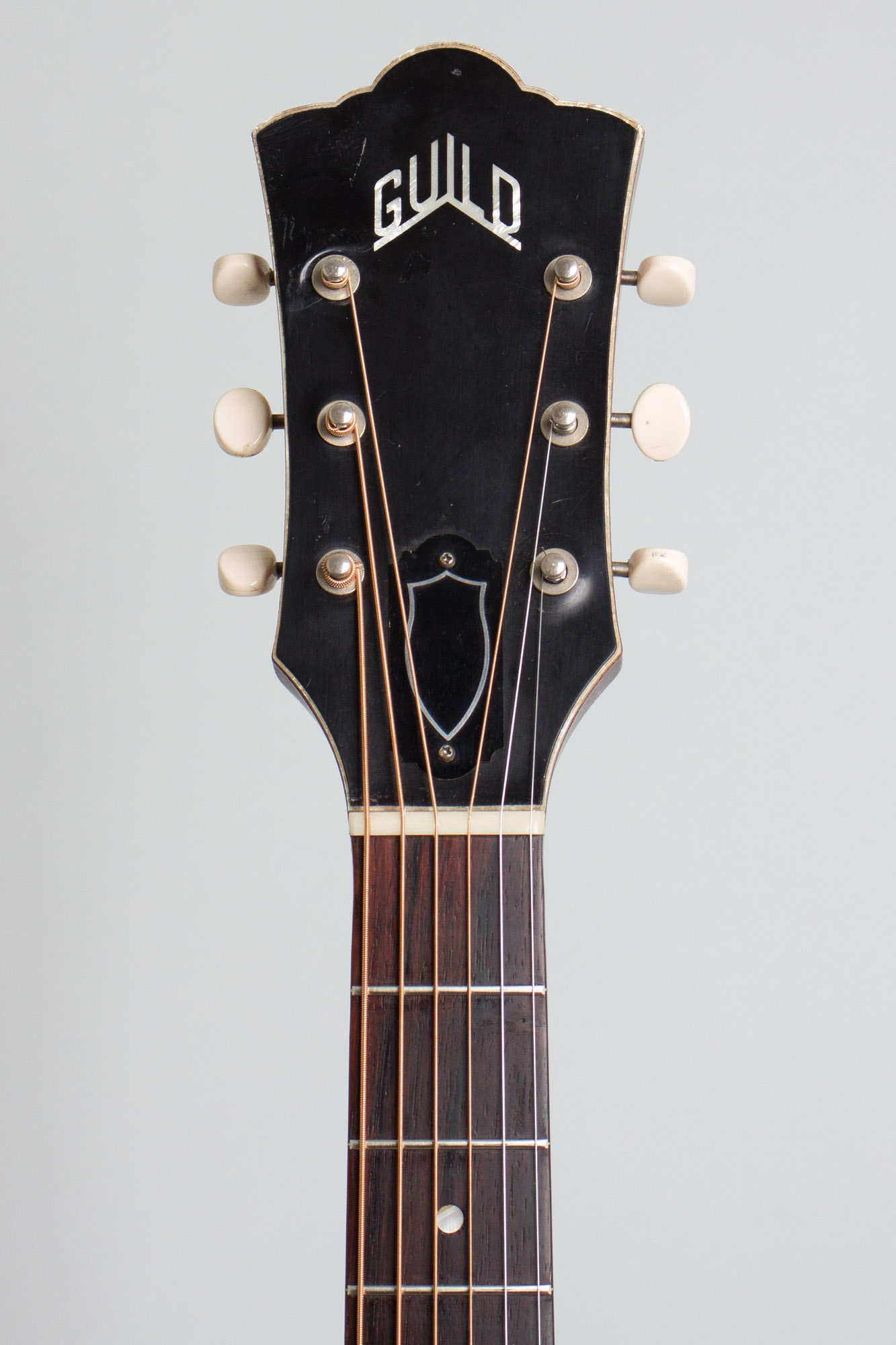 For nearly 60 years along this is a clean and great sounding little guitar, played in a bit but recently given its 100,000vmile tune up and so an excellent player. There some small scratches, dings and dents to the finish overall; the back shows a spot of disturbance from what looks minor strap burn. As with all these unbound guitars the heaviest wear is along the back edge but there is virtually none of the common pickwear to the top. The finish on the back of the neck is oddly worn down to the wood in a couple of decent sized spots but feels smooth to play on with only a couple of tiny dings and dents. The vinyl headstock facing has shrunk up just a bit as is typical with Guilds but less than many of this period.