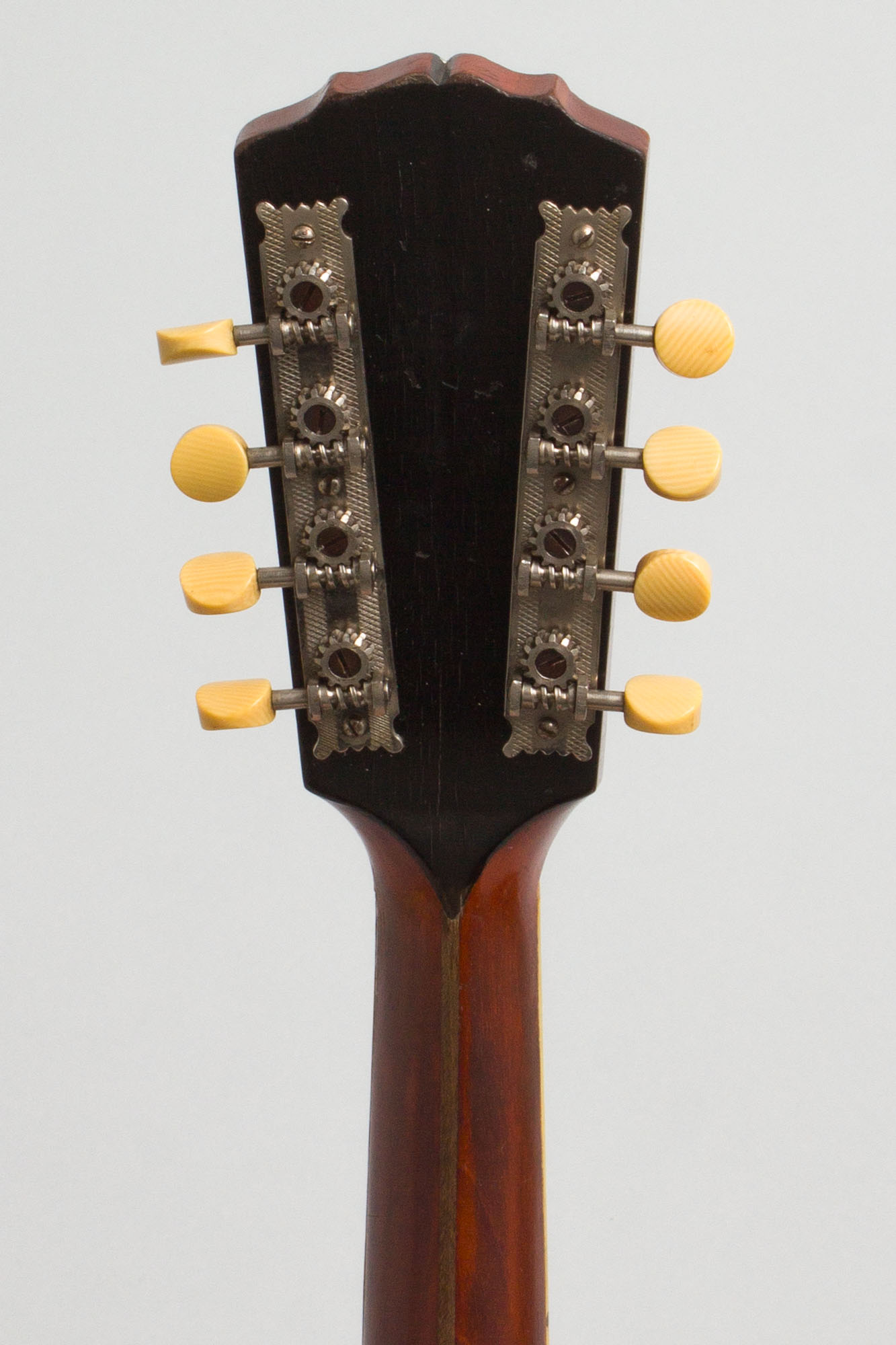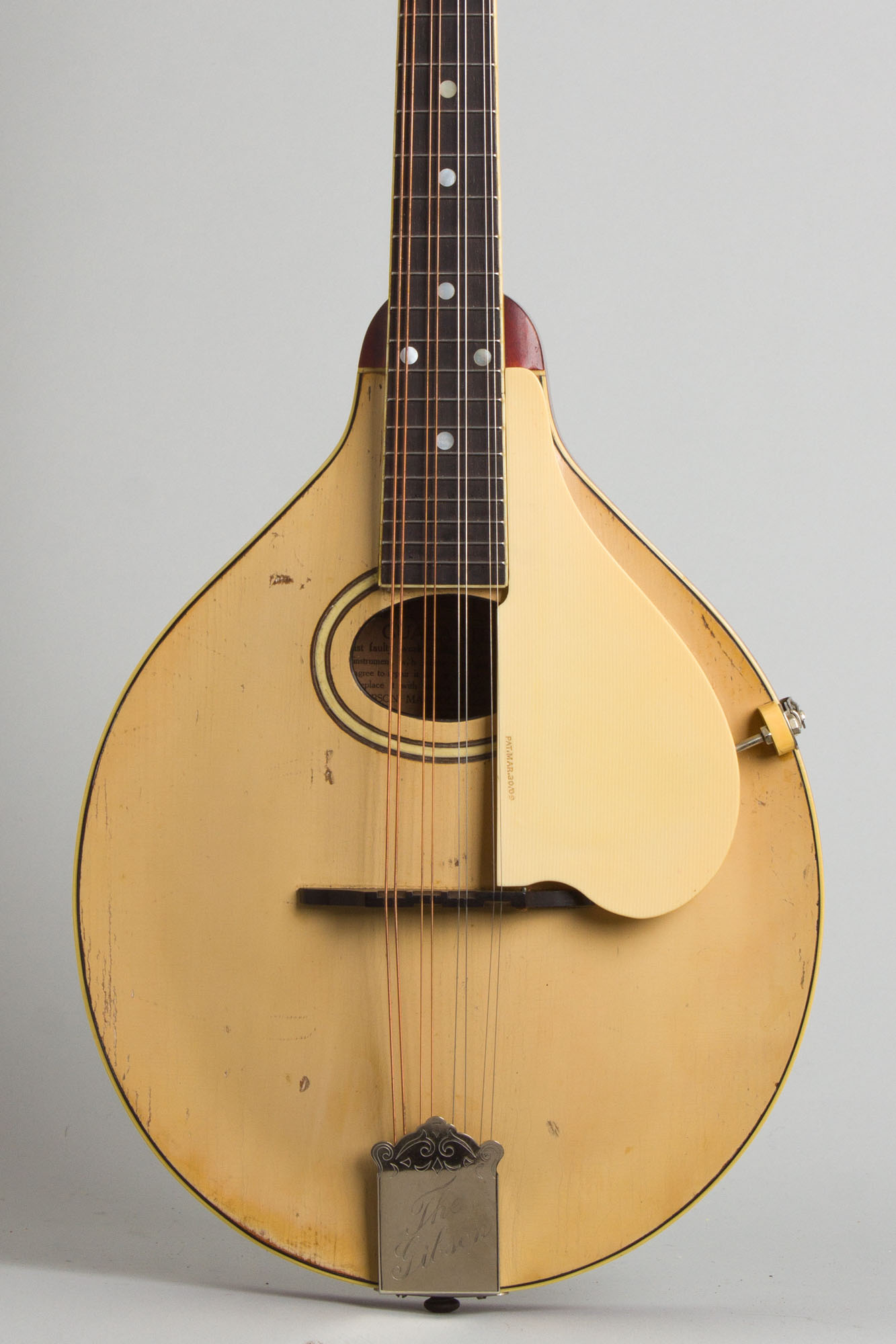 The striking white top is double bound with a wide ivoroid soundhole ring encircled by three-ply wood on either side. The pickguard is grained ivoroid as is the bracket anchor, a very attractive looking material used only on banjo fittings besides this lone mandolin model. The back and fingerboard are single bound, the peghead sharply slanted "THE GIBSON" script logo and inlayed curlicue vine pattern. The tuners are the typical period openbacks, the original one-piece compensated bridge and engraved tailpiece are all intact. Overall this is a fine playing and sounding example of this striking and singular Gibson mandolin.