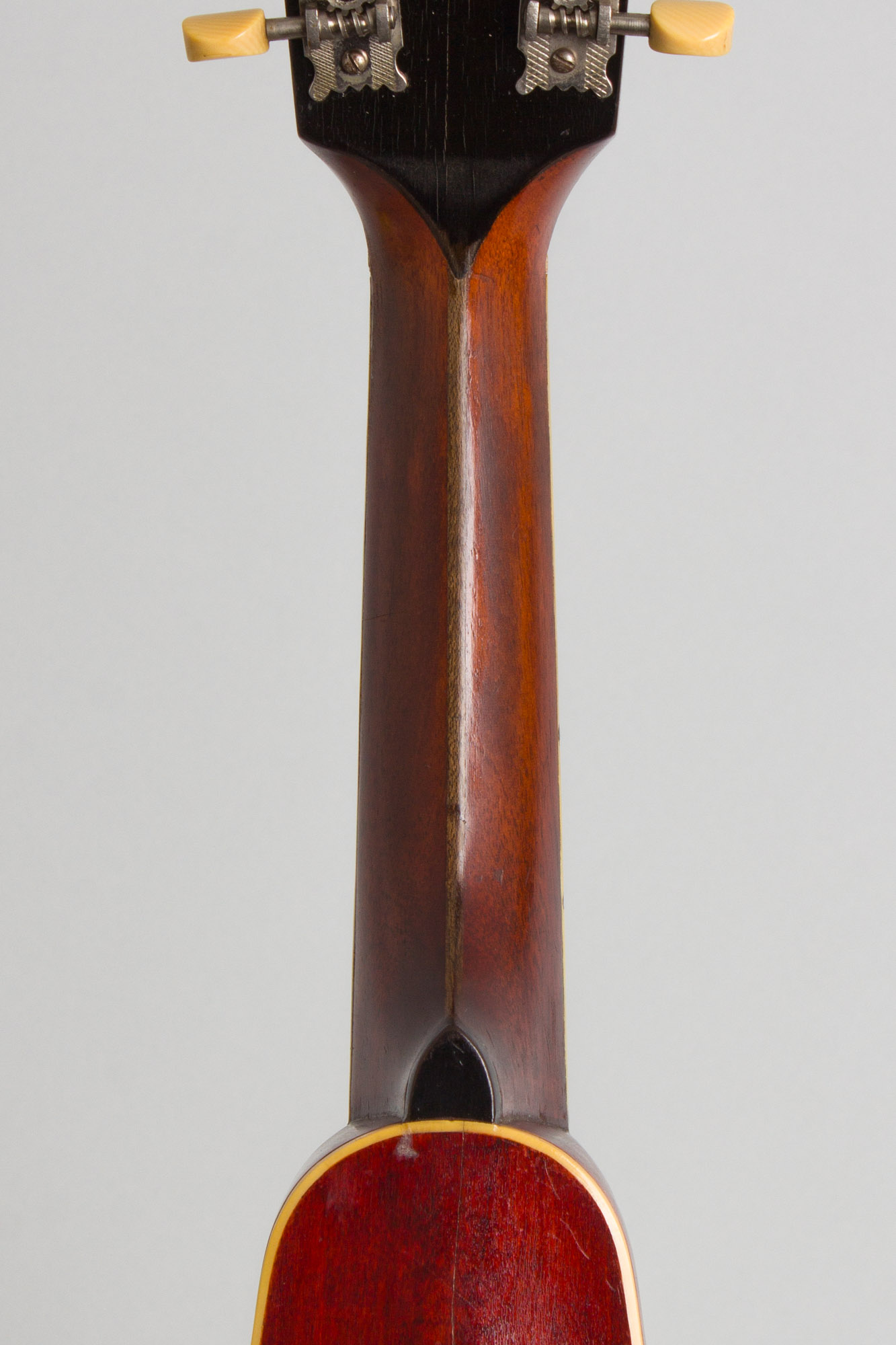 This distinctive ivory-topped instrument remains in nicely original condition with some typical playing wear. There is scuffing and fine checking to the all-original finish with dings, scratches and dents scattered overall. The top shows some light discoloration to the ivory finish and noticeable dings and scrapes through the lacquer, but generally the top is still quite attractive. The back and sides have very fine checking and some similar wear, while the back of the neck is partially worn through to the wood.