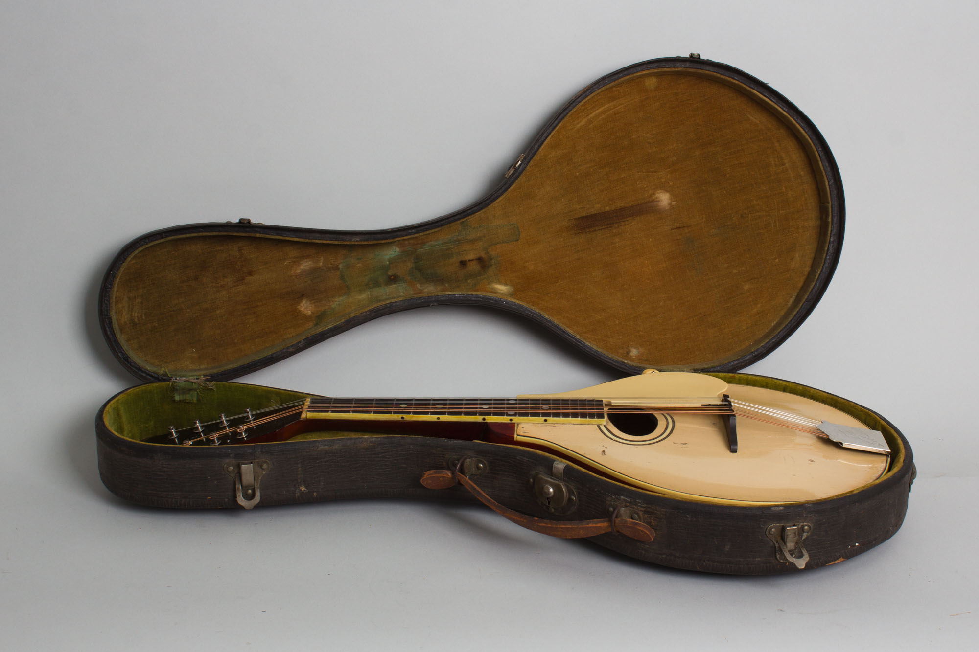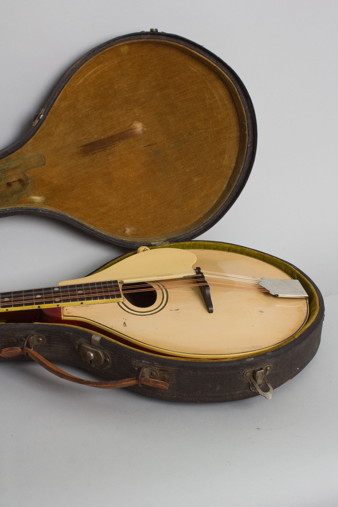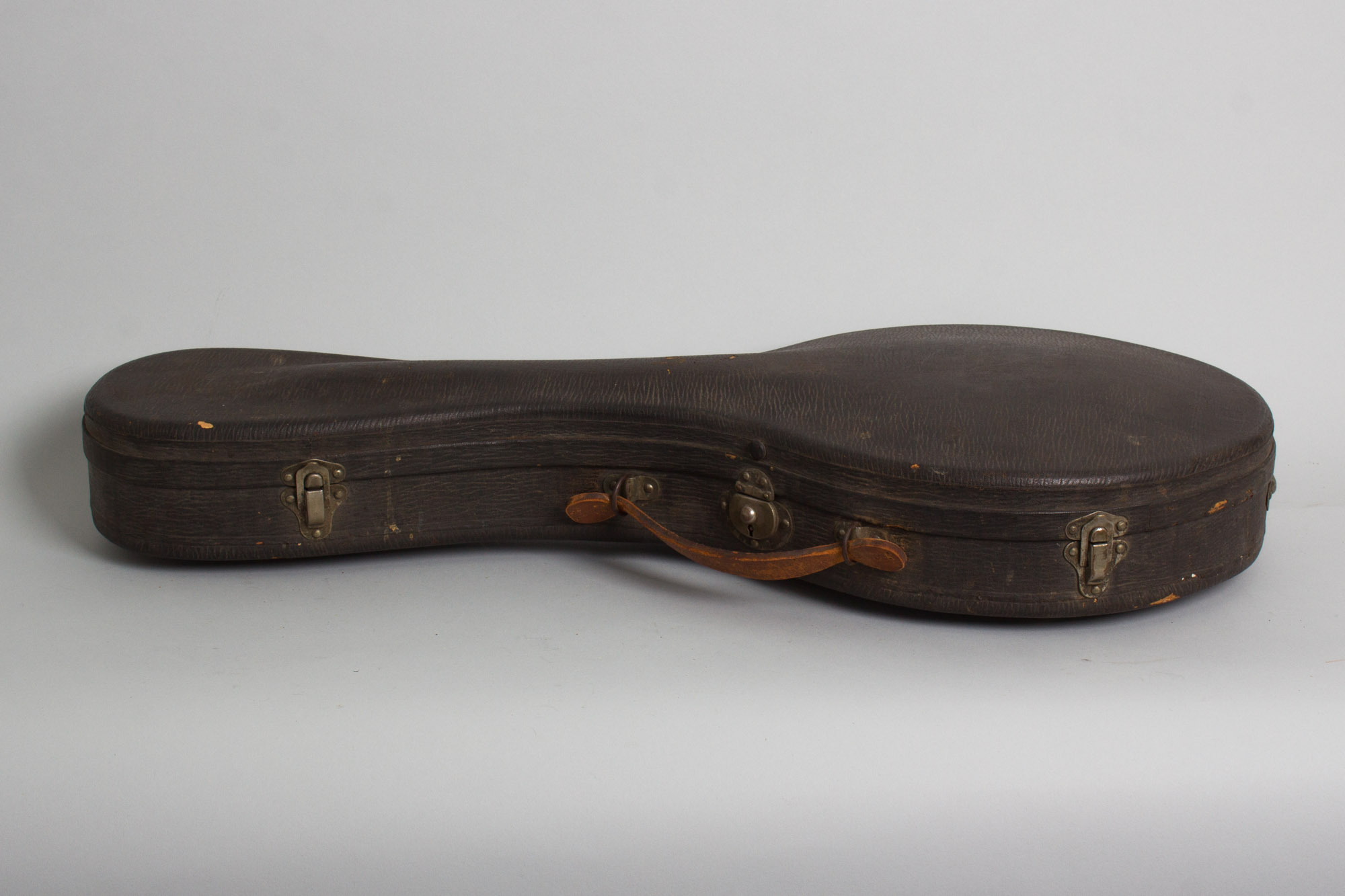 The only repair is a sealed grain split down the upper center of the back, which was not cleated or finished over. The mandolin remains all original except for a very neat refret with appropriate wire showing no subsequent wear and it plays excellent. The instrument includes the original hard case, in very solid condition with an eccentric but functional one-piece leather handle. This is not only a lovely art Nouveau gem but a fine player's A-3 with a bright but even sound, well past its 100th birthday and ready for 100 more! Very Good + Condition.