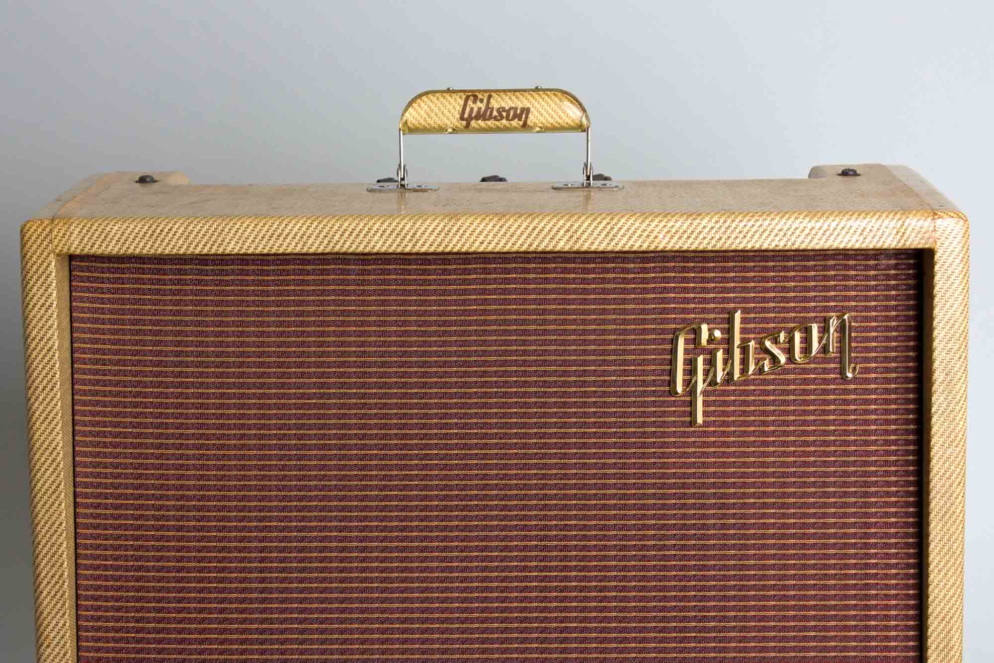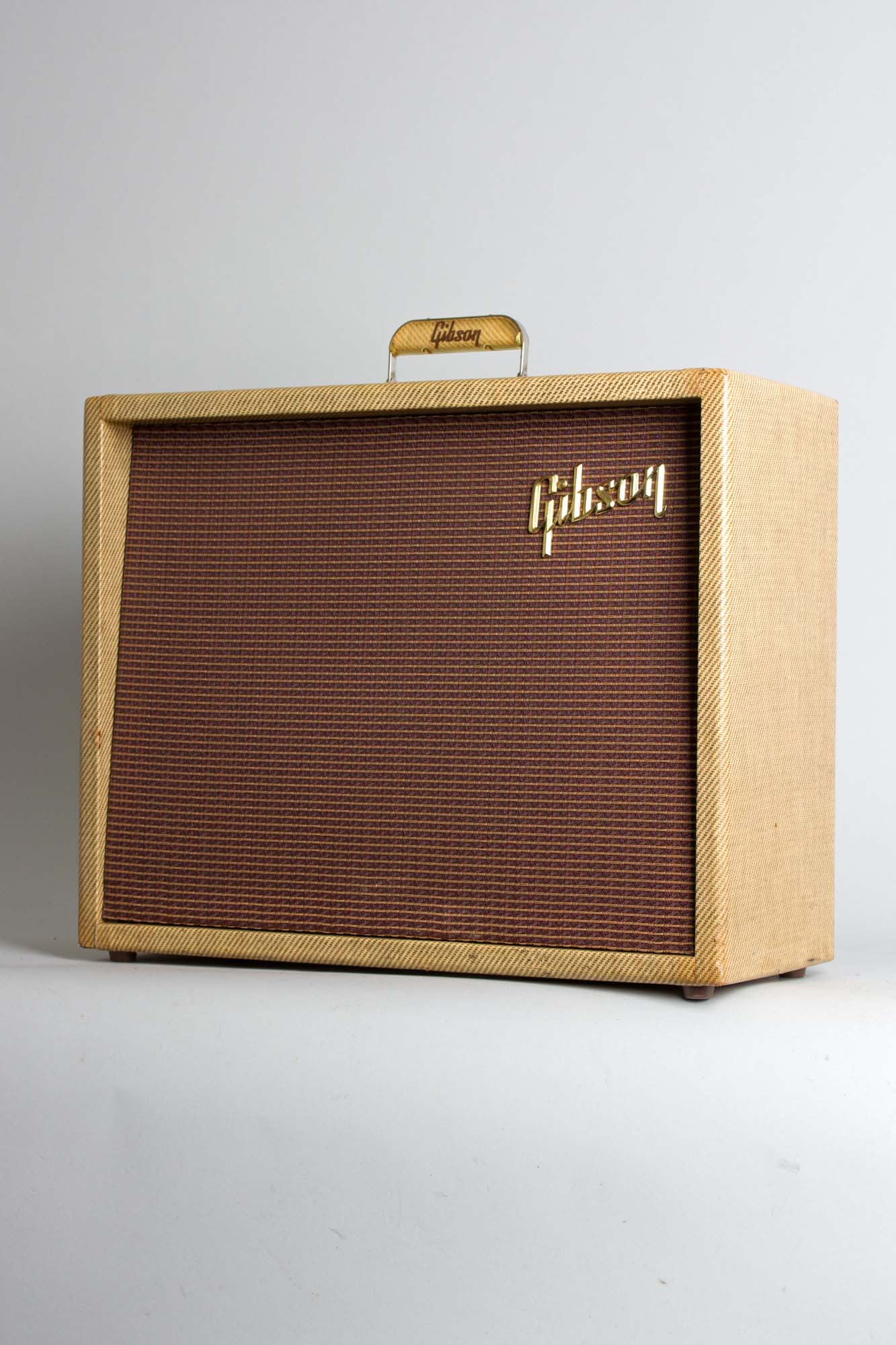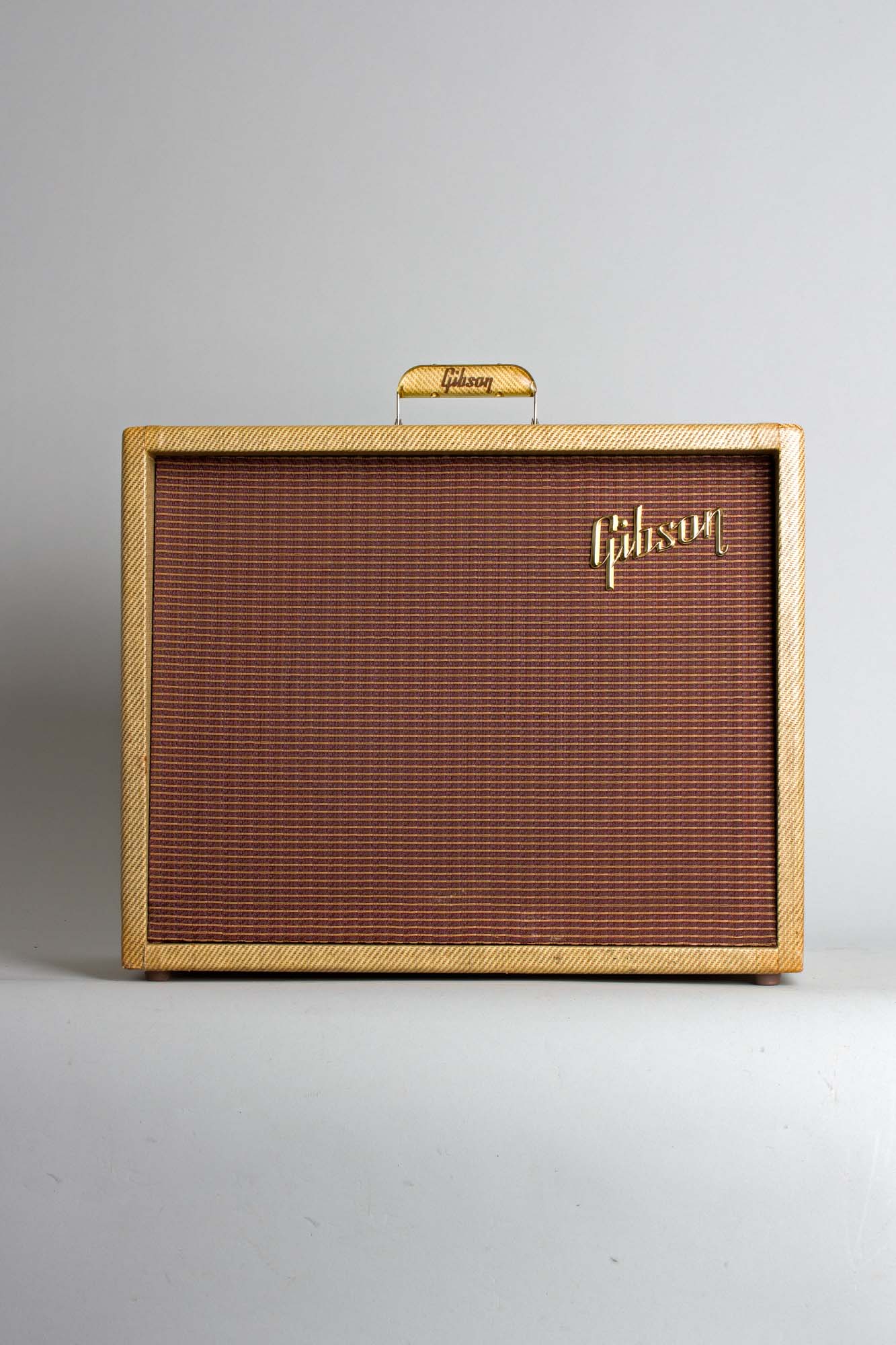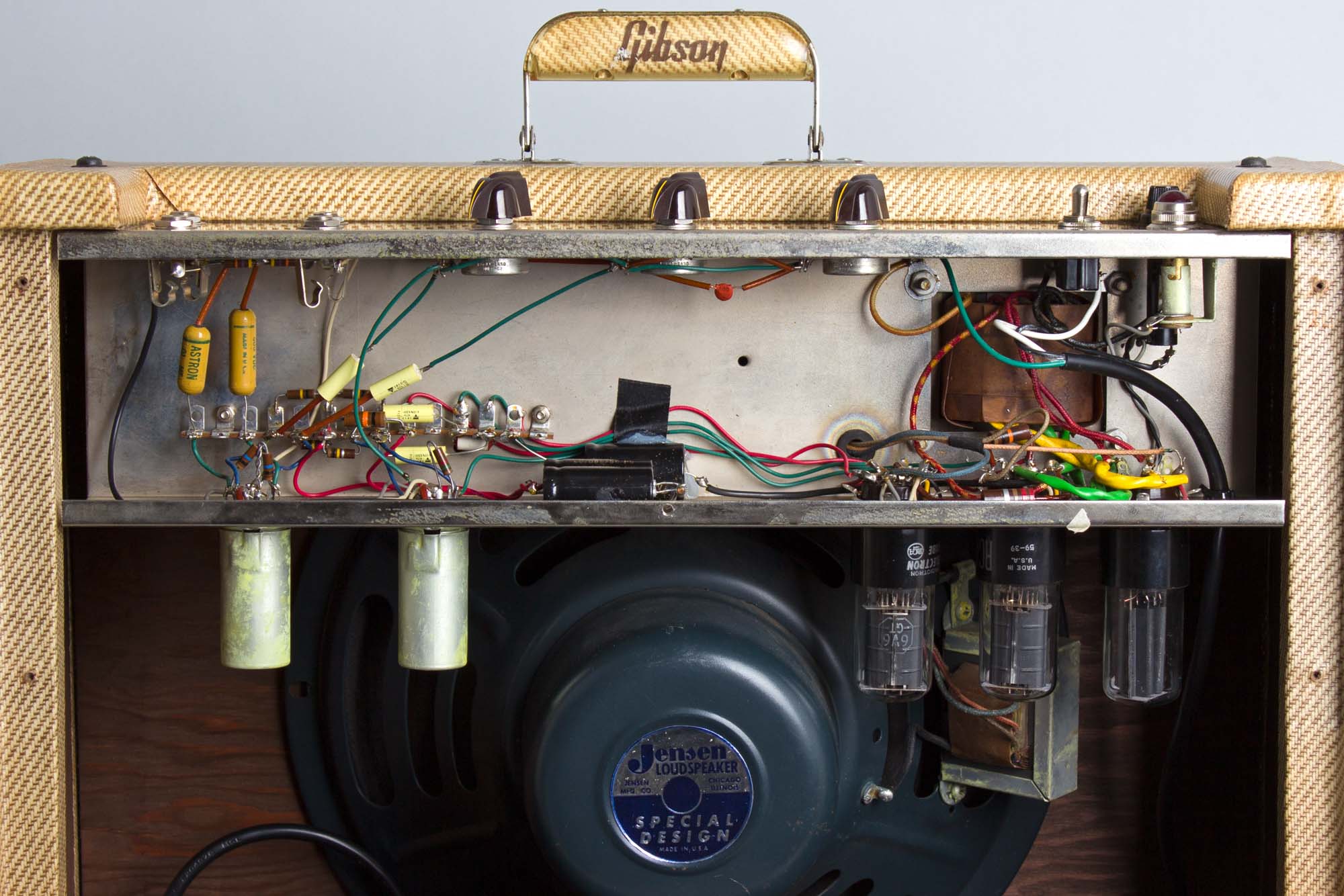Around the turn of the decade, Gibson revamped their line-up cosmetics to more closely resemble the slender and boxy look of "narrow-panel" tweed amps made by Fender, who had risen to become the industry-leading amp manufacturer by the late 50s. As sales numbers were unfortunately dwindling, Gibson soon moved on to continue competing with their own front-facing panel design by 1962-63. This short-lived 'tweed-era' of Gibson's bore some of our favorite amplifiers, both in sound and in design, offering their own version of 'tweed' tone in a really well-made package.