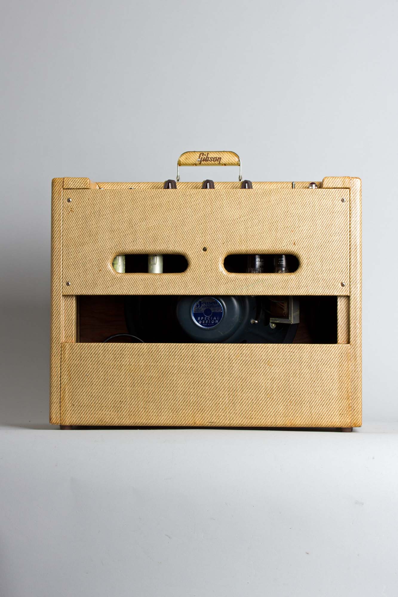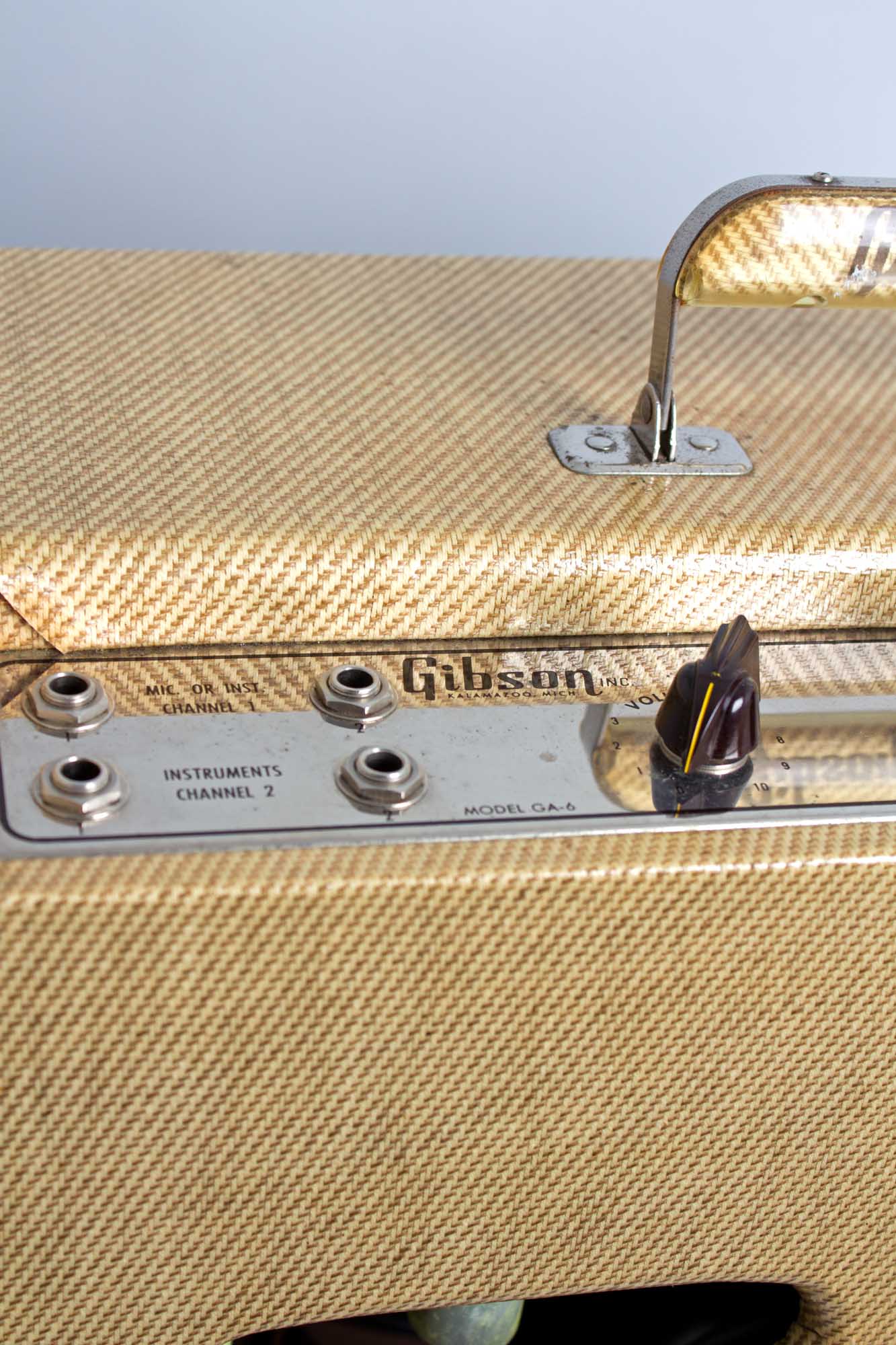 This fairly rare Gibson GA-6 Lancer is in a spectacularly preserved, close to near-mint state with minimal signs of use and remains beautifully original. In the middle years of the 1950s the GA-6 was Gibson's mid-line amplifier offering, intended to compete directly with the classic wide panel 5C3 Fender Deluxe, which in fact, the circuit of the GA-6 resembles quite a bit. The GA-6 has long been referred to as the "poor man's tweed Deluxe", although at the time it was not actually any less expensive!
