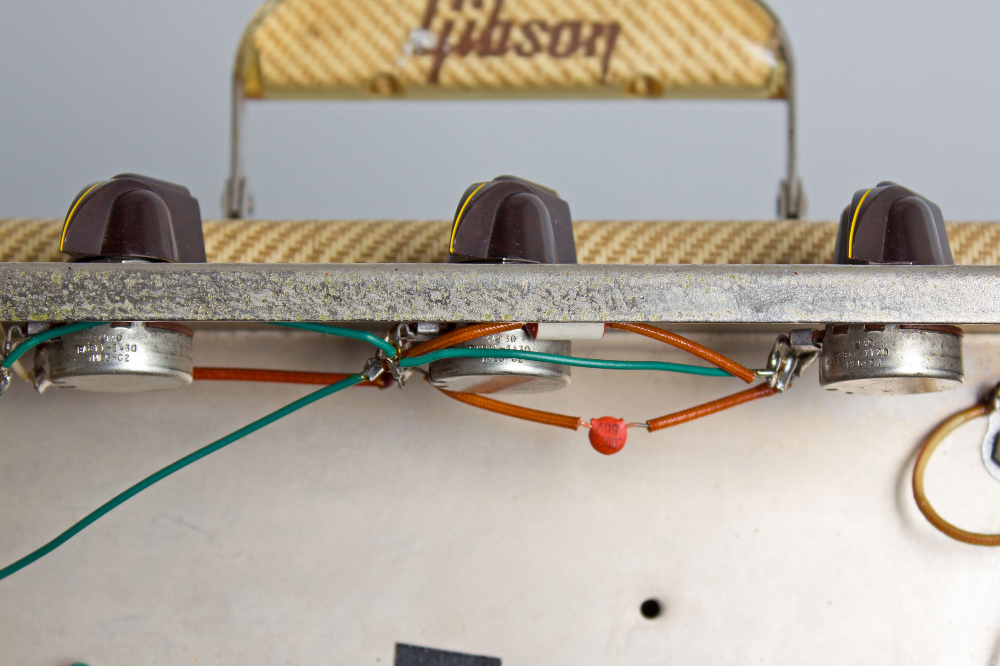 Electrically, the amp is nicely original. The original Jensen P12R, marked 220-913 (dating to the 13th week of 1959) is in fantastic shape. Both power and output transformers are original to the amp and marked GA-23P and Z-3560/220-916, respectively, with the latter dating to the 16th week of 1959. The Centralab pots all date to the 30th week of 1959. The amp has received typical maintenance to ensure reliable and safe operation for years to come, including the replacement of all electrolytic capacitors and any coupling capacitors that are too far degraded. All sockets, pots and jacks have been cleaned and the power tubes have been biased to spec. The amp also has been outfitted with a 3-prong grounded power cord.
