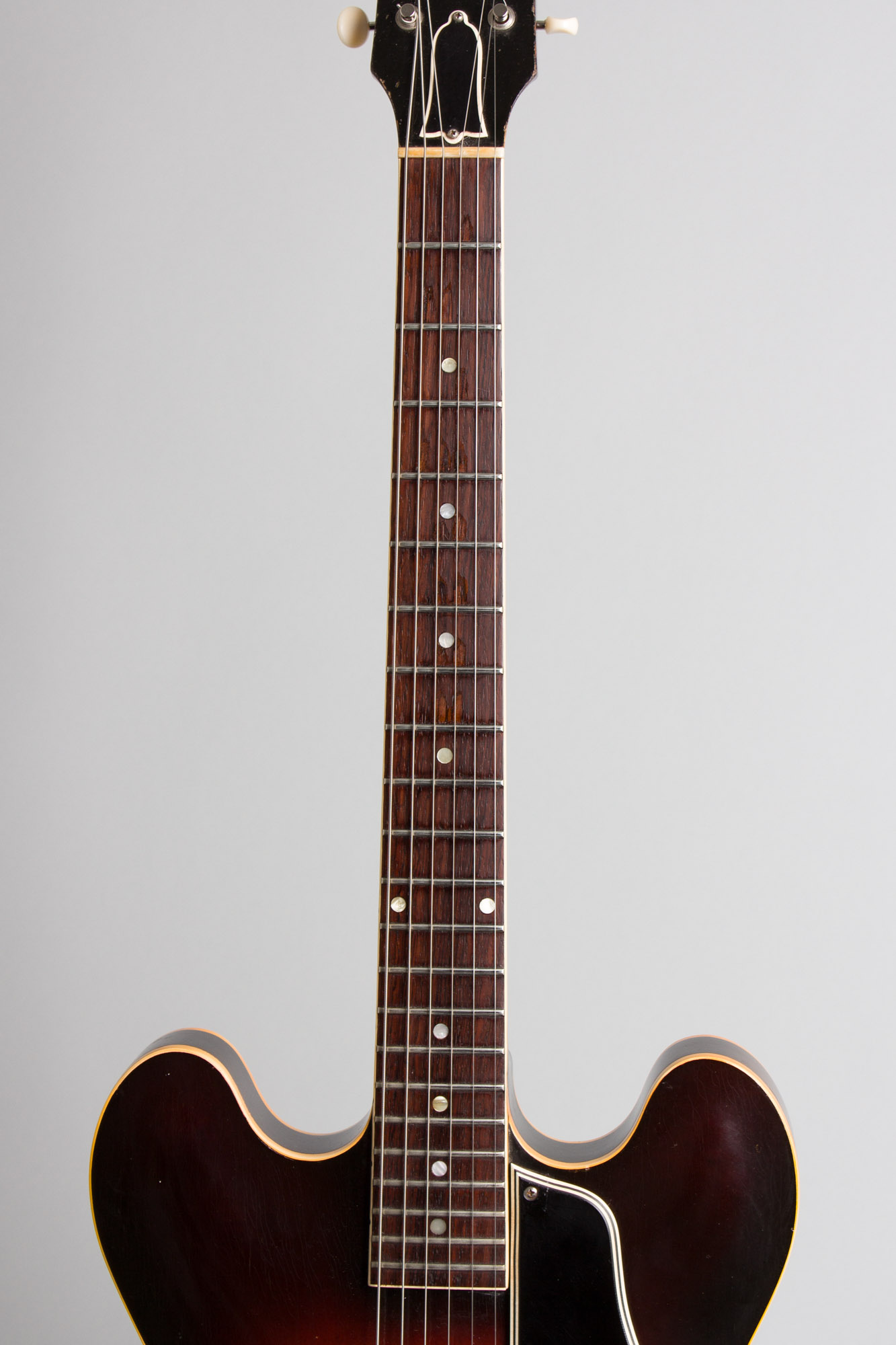 The distinctive feature of the original ES-330T is that single P-90 mounted in the middle of the body, something Gibson first tried in 1955 with the ES-225. It is controlled with 1950s style amber plastic "bonnet" tone and volume knobs. This center pickup placement gives a smooth midrangey tone, obviously not as versatile as the twin pickup ES-330TD, but with a distinctive sound all its own. This is simply a superbly easy-handling, lively sounding and great-playing guitar, super lightweight and still with the round backed 1959 style neck, slimmer than some but not the wide, flat version seen on most 1960-61 guitars. This is not the cleanest or prettiest one of these we have had, but a guitar you'll pick up and play for a bit and suddenly it's a couple of hours later, even if you don't plug it in!