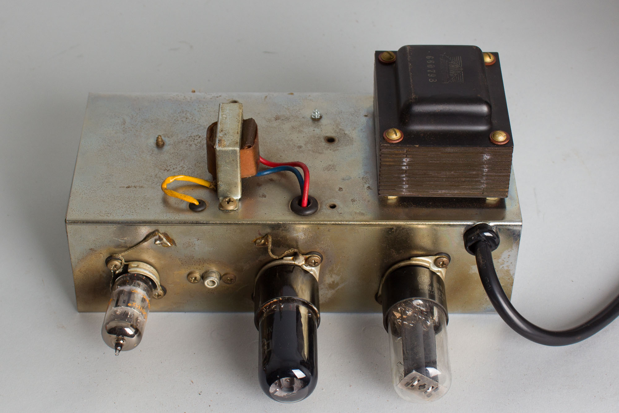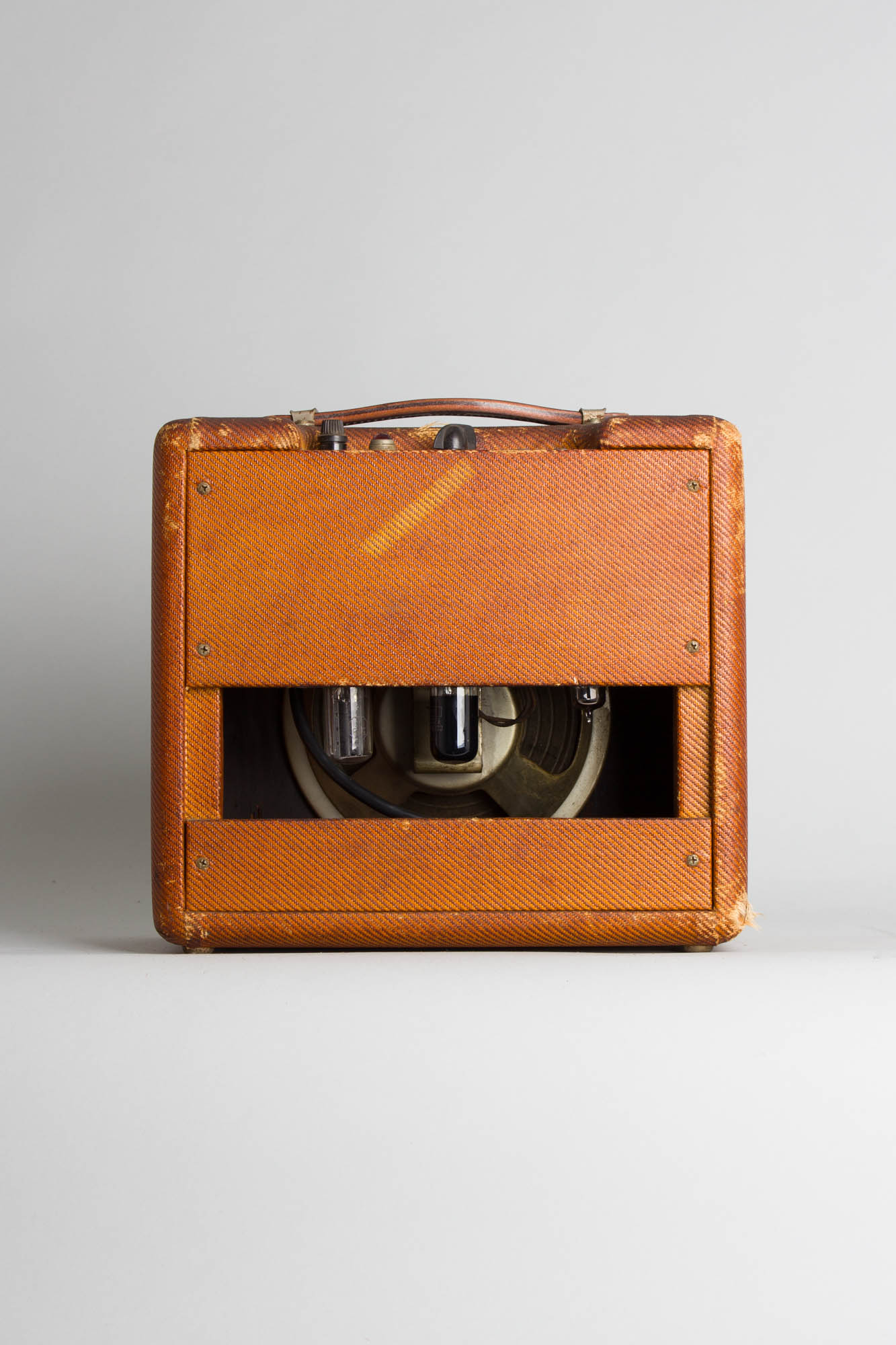 Cosmetically, this Champ's tweed-covered exterior is deeply smoked with an attractive darker patina and shows only a modest amount of scuffing and tears. The faceplate is in fairly good shape with minimal signs of corrosion, though most of the stenciled lettering has worn off. The grille cloth is nicely intact with no notable tears. The handle has been replaced with a finely-crafted reproduction by Bob Brookwood of Brookwood Leather. The torn original handle is included with the amp.