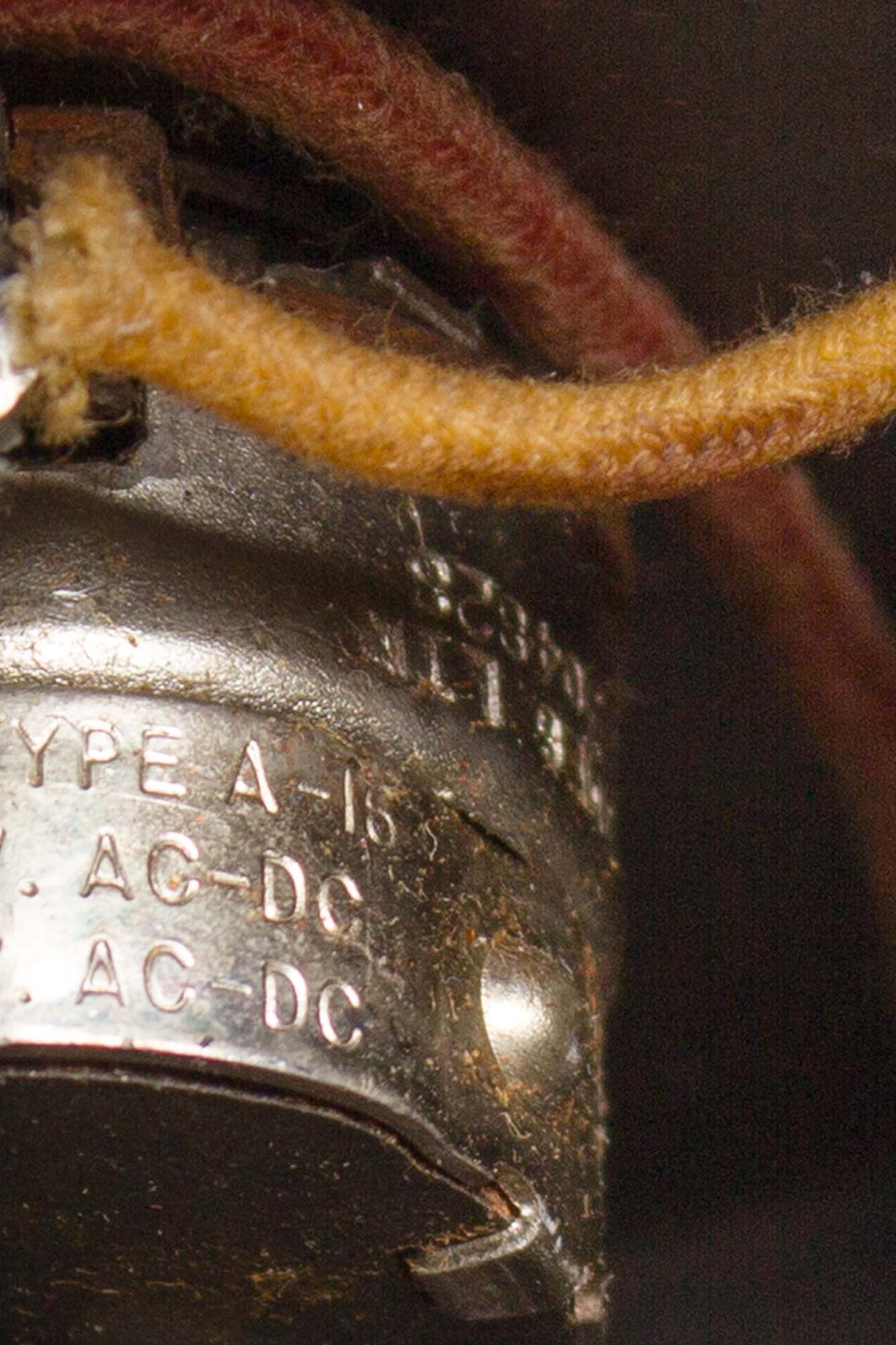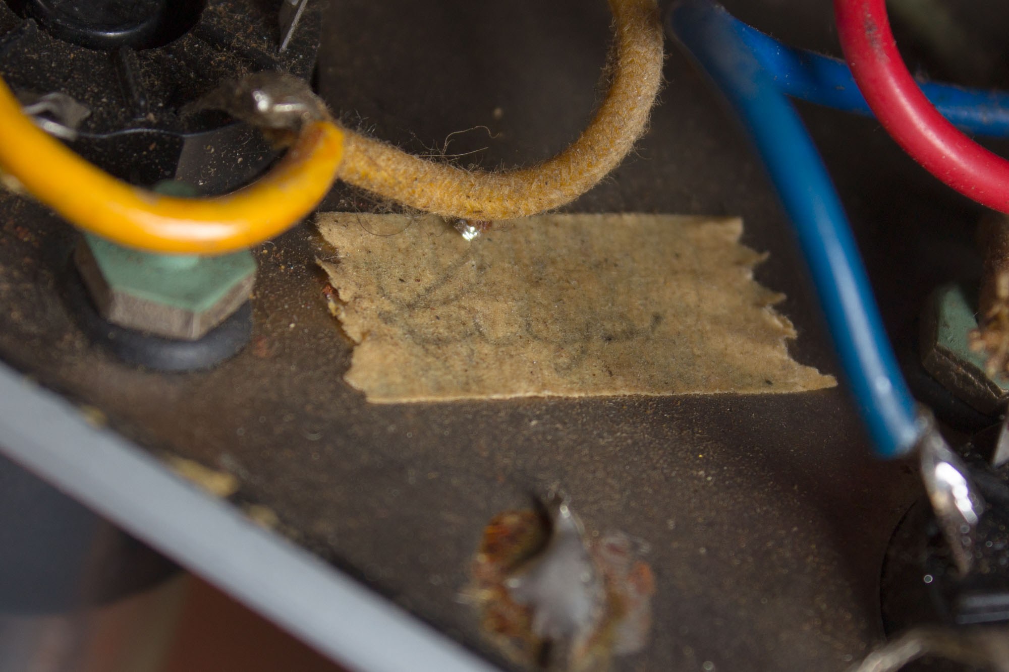 Electrically, the amp is nicely original: the Oxford speaker, marked 465-842, dating it to the 42nd week of 1958. somewhat amazingly the speaker still bears its original cone, which has been lightly patched in one spot, but still sounds and tests great. Both the power and output transformers are original, the former made by Triad and marked 66079B. The single twin-can pot is coded 304-828, dating it to the 28th week of '58. The amp has received our routine maintenance including standard replacement of electrolytic caps, as well as a grounded 3-prong power cord and cleaning of all sockets, pots and jacks as well as biased to spec. It was wired up by Lupe, and has her masking tape signature still intact. And it still sounds fantastic, with the echoes of a lot of gawd-knows-where nights cranked up to "11", at least! Very Good + Condition.