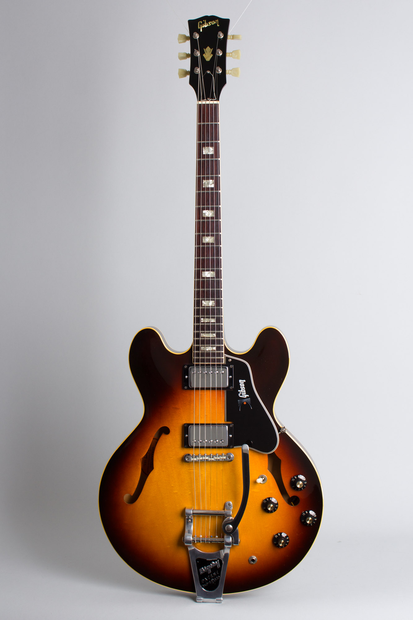 This is a simply superb, almost incredibly clean example of the classic later 1960's ES-335TD, in the sunburst finish that was one of the two standard options at the time. It is factory equipped with a Bigsby vibrato tailpiece, confirmed as original by the hangtag still in the case stamped "ES-335TD Special Bigsby". It also has the little stenciled Gibson flourish on the pickguard, which was only applied in this year as it quickly proved prone to getting worn away by strumming!