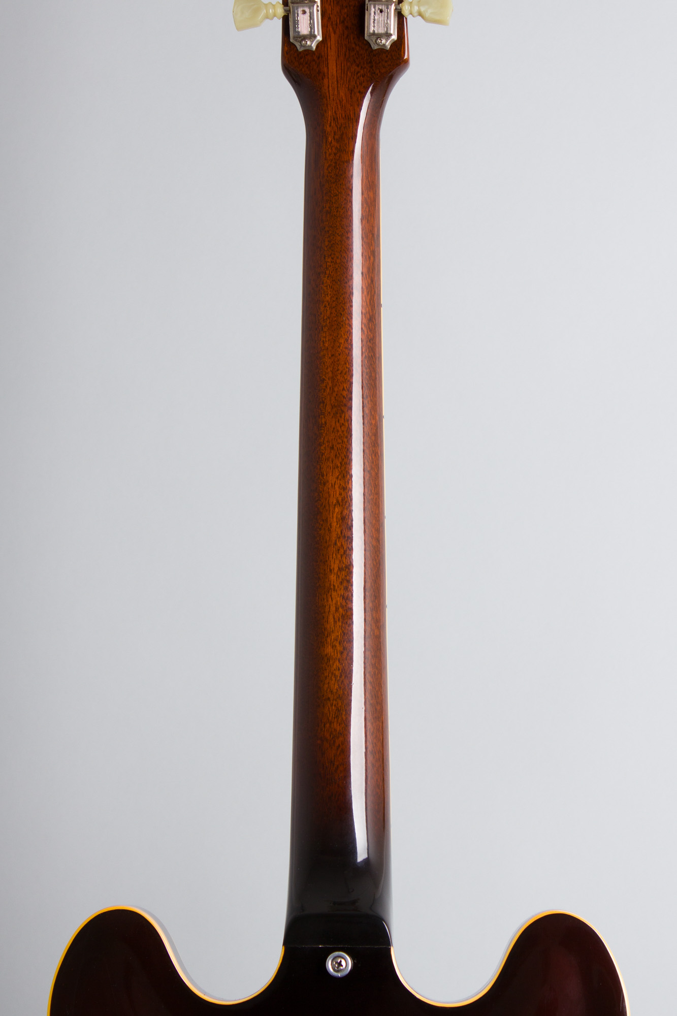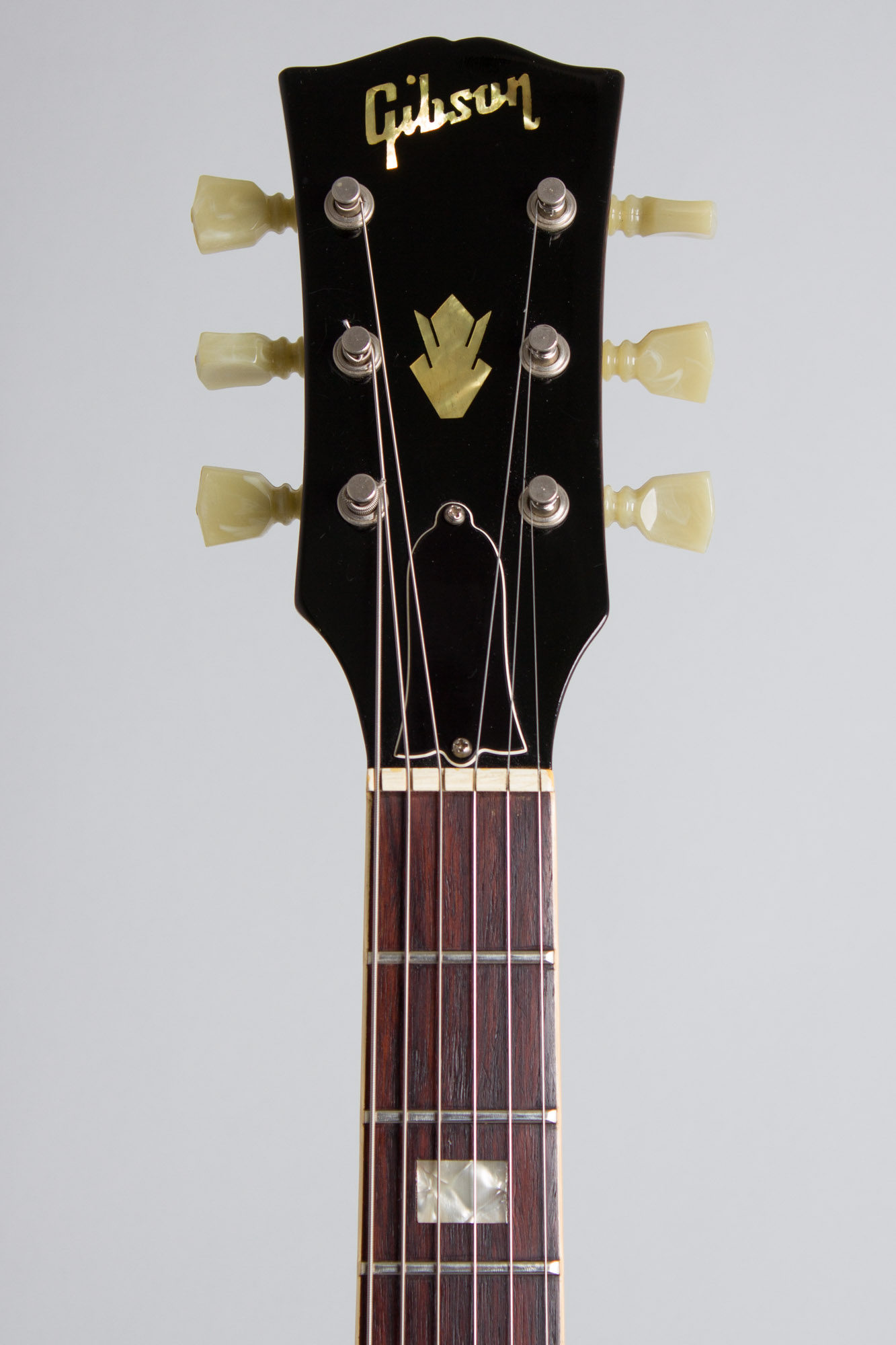 The instrument's other features are typical for 1968, with chrome-plated hardware including the Tune-O-Matic bridge with nylon saddles, trapeze tailpiece and two Gibson humbucking pickups with patent number sticker on the bases. Other typical appointments include enclosed Kluson Deluxe tuners with double-ring plastic buttons and the "amp" style black molded plastic knobs, in this case with gold caps not specifically specified for this model but obviously original. The bound rosewood fingerboard has pearloid block inlay with the narrow 1 9/16" nut of this era; it is a bit wider than some which can run as slim as 1 1/2". 2294 of these shipped out in sunburst during 1968 but few will have survived as smartly as this one, a fantastic find in a great playing and sounding late '60s guitar!