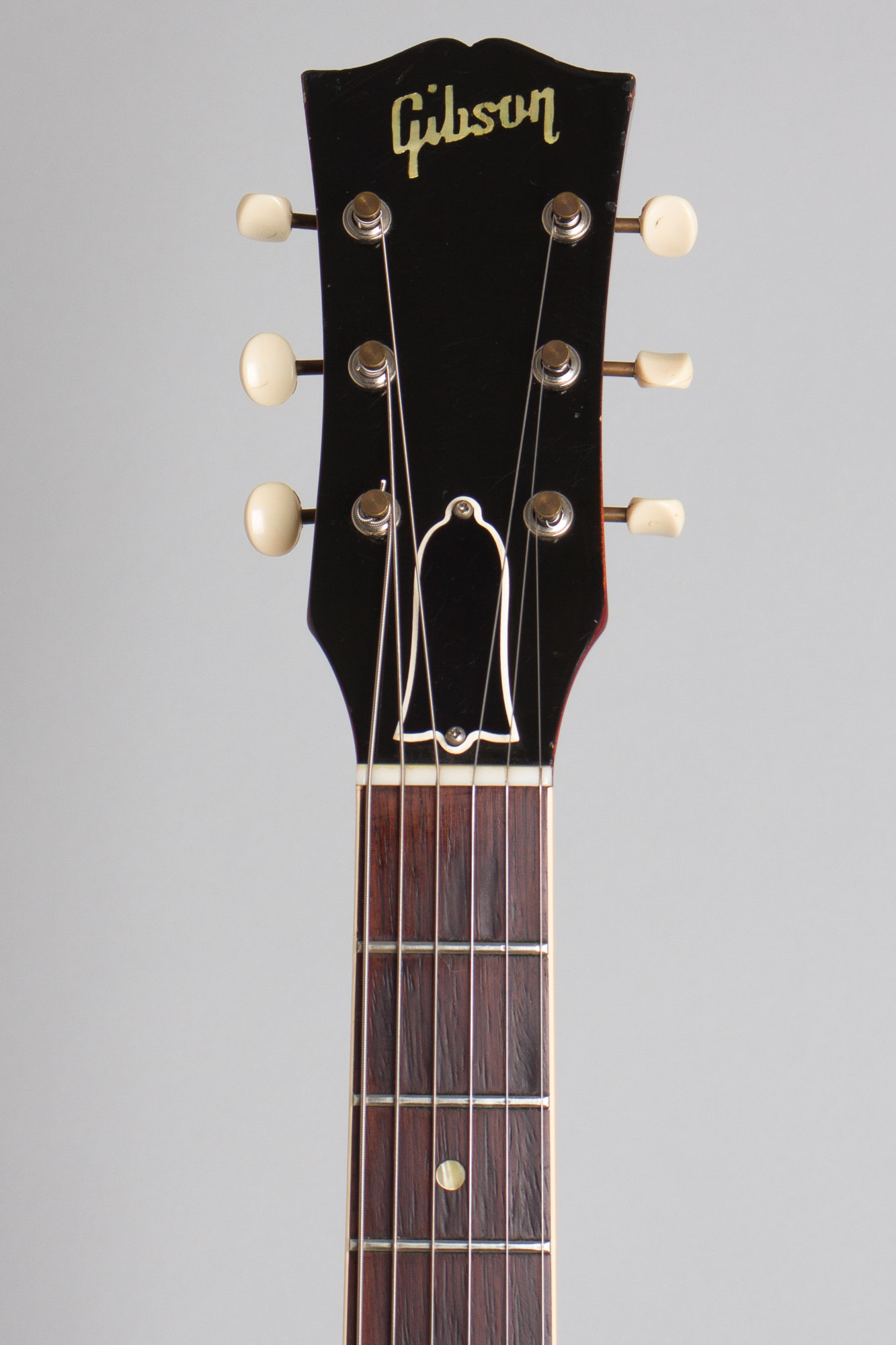 An item of note on this guitar is the shallow C-profile neck is just slightly slimmer at the nut than generally expected on SG's until 1965, halfway between the 1 11/16' spec. ostensibly universal in early 1960s and the later 1 5/8"'. While the prevailing theory is the older wide nut was ubiquitous until 1965 we have seen a number of earlier Gibsons that deviate from this. The company was apparently flirting with slimming this on the "amateur" level guitars at least a few years prior. The neck itself tapers noticeably towards the body with the very flat "1960 C" profile and a an effortless slim feel.