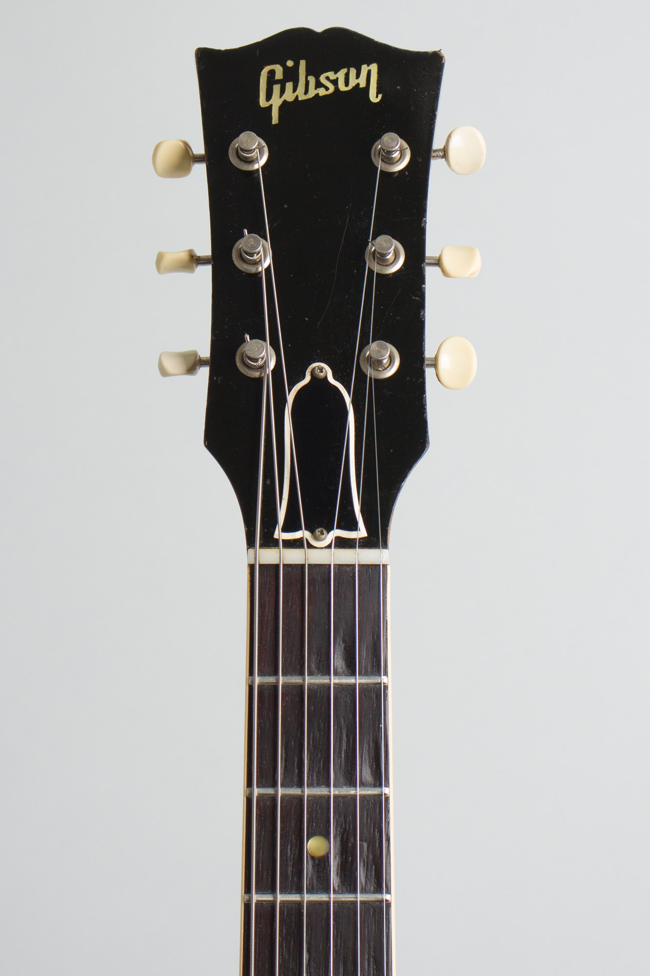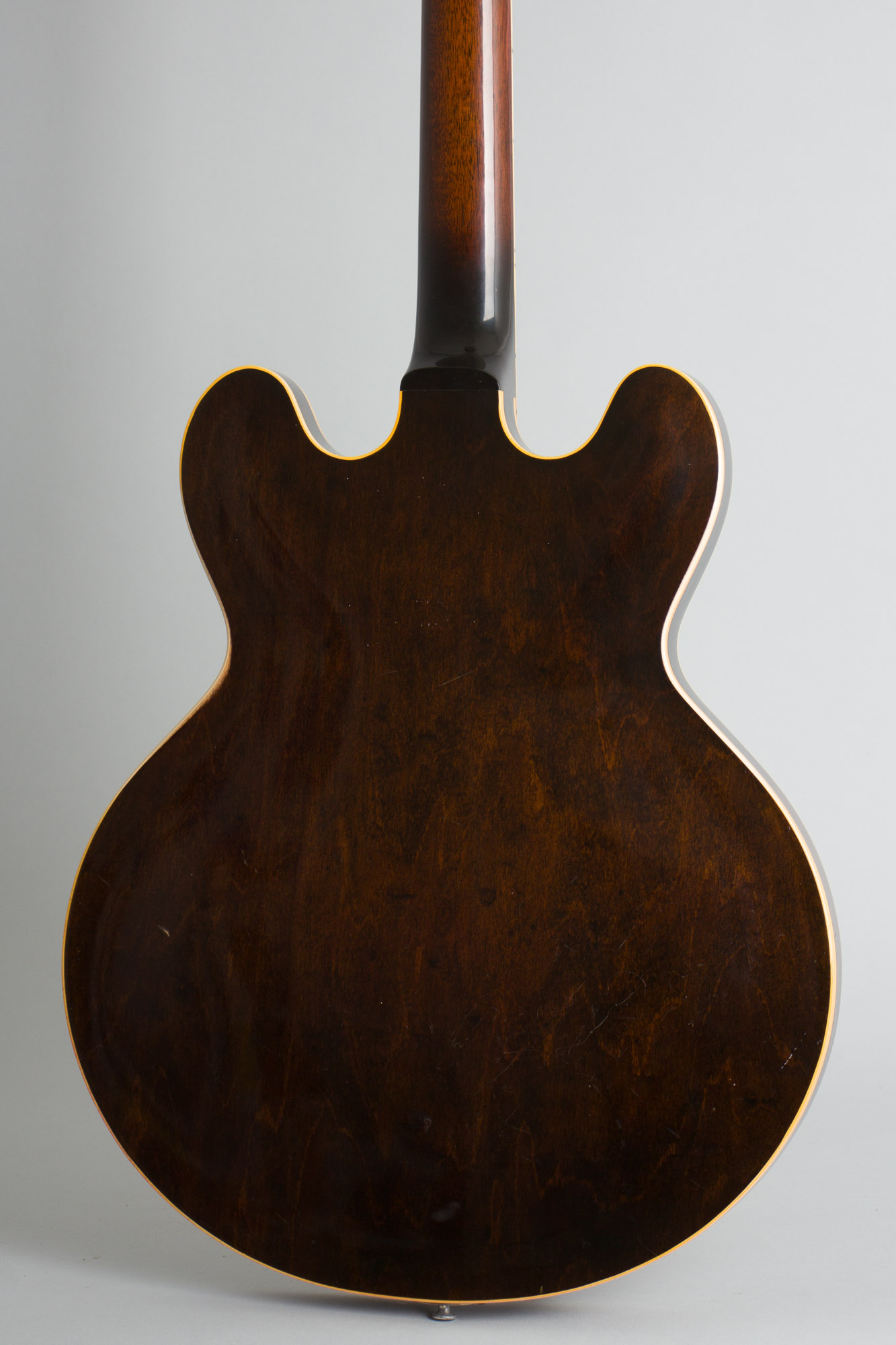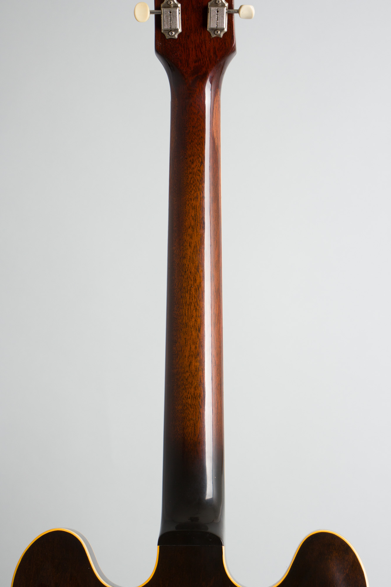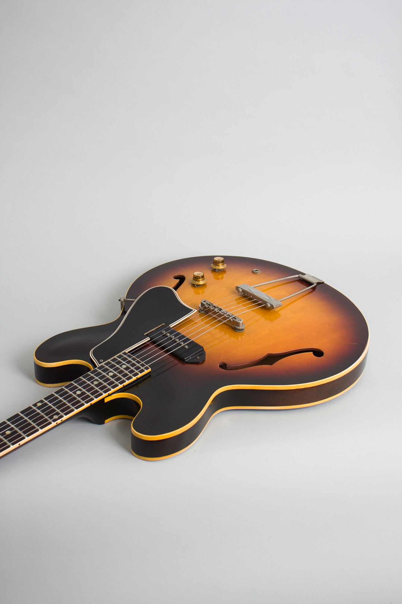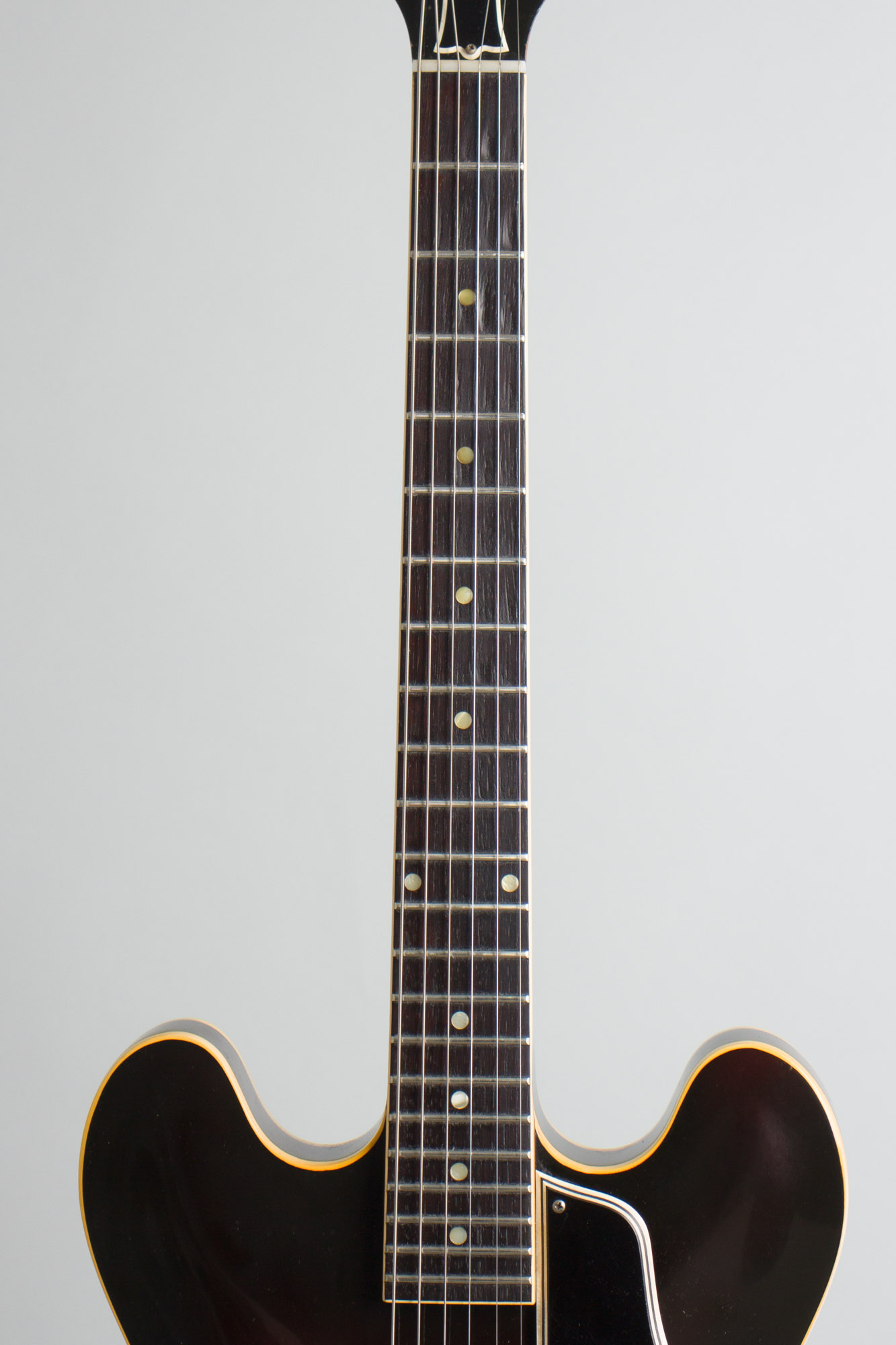The distinctive feature of the original ES-330T is that single P-90 pickup mounted in the middle of the body, something Gibson first tried in 1955 with the ES-225. It is controlled with the then-new metal-capped plastic tone and volume knobs. This center pickup placement gives a smooth midrangey tone, obviously not as versatile as the twin pickup ES-330TD, but with a distinctive sound all its own. This is simply a superbly easy-handling and great-playing guitar, super lightweight and still with the more shallow flatter-feeling neck seen on most 1960-61 guitars. This is one of those guitars you'll pick up and play for a bit, and suddenly it's a couple of hours later, even if you don't plug it in!