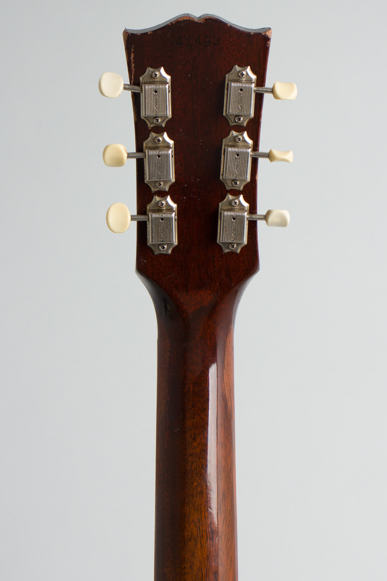 Overall this is a lovely original guitar with only some minor wear. It remains nicely original and the finish is shiny overall, with some very small dings, dents and handling marks. There is some light scuffing to the pickguard and scraping to the back from the past 60+ years. The headstock has some dings and a couple of chips to the treble side, around the G string tuner that has a bent shaft. The tuner still works fine, but it must have taken a bang long ago. The original frets have been recrowned in the lower positions and there is some visible wear to that zone of the fingerboard. There was never even a strap button added.