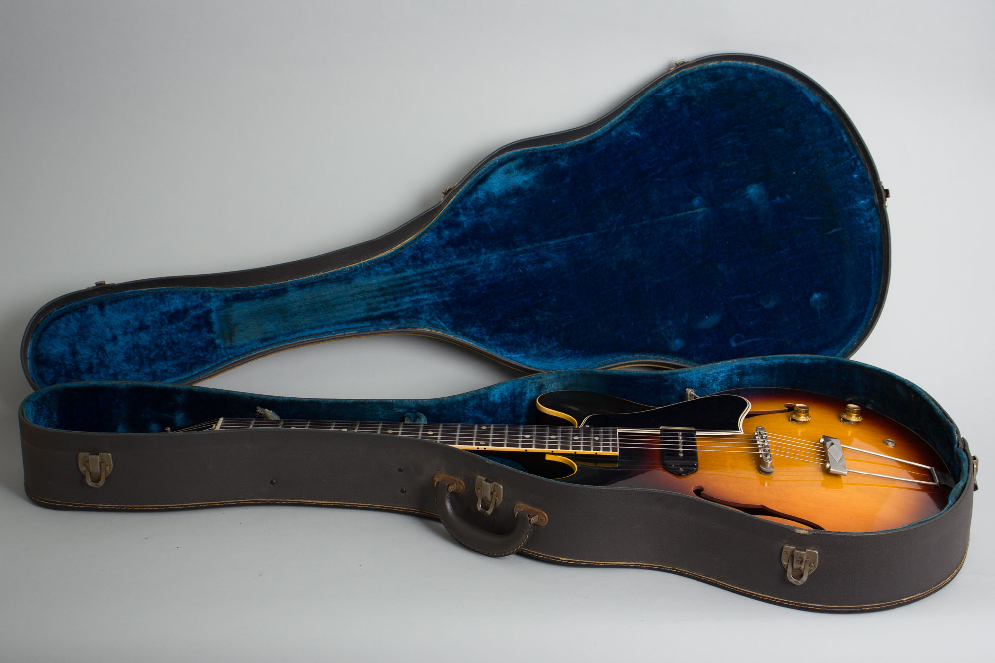 Gibson ES-330T Model Thinline Hollow Body Electric Guitar (1961), made in Kalamazoo, Michigan, serial # 41493, sunburst top, dark back and sides finish, laminated maple body, mahogany neck with rosewood fingerboard, period grey chipboard case.