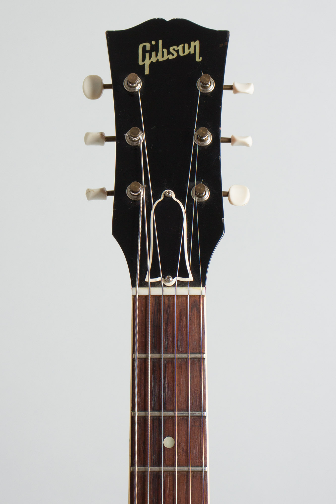 An item of note on this guitar is the shallow C-profile neck is just slightly slimmer at the nut than generally expected on SG's until 1965, just at halfway between the 1 11/16' spec. ostensibly universal in early 1960s and the later 1 5/8"'. While the prevailing theory is the older wide nut was ubiquitous until 1965 we have seen a number of earlier Gibsons that deviate from this. The company was apparently flirting with slimming this on the "amateur" level guitars at least a few years prior. The neck itself tapers noticeably towards the body with the very flat "1960 C" profile and a an effortless slim feel.