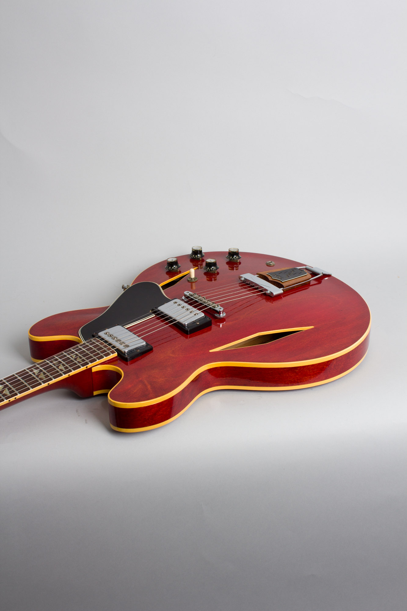 One of our favorite '60s Gibsons, the Trini Lopez Standard adds a slightly sassy cosmetic edge to the common cherry red ES-335 formula! The diamond shaped f-holes and position markers give the guitar a rakish air, while the single-sided headstock contributes a certain extra pizzazz. A snazzy engraved rosewood-and-plastic tailpiece insert carries the "Trini Lopez Model" designation, with a couple of extra diamonds. While these guitars are usually referred to as having a "Firebird Style" headstock, this model in fact slightly predates the non-reverse Firebird guitars it shares that design with, so really the later Firebirds have a "Trini headstock".