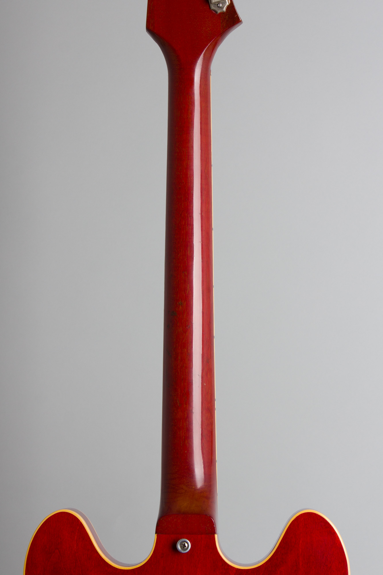 This is a very clean and all-original guitar, appearing well cared for and apparently not too much used. The all-original finish is clean with a minimally faded cherry hue, showing some broad checking and minor dings, dents and slight scratching to the back. The top has a few odd lightly spotted areas under the strings that would polish out if desired. Other than this minor wear the guitar is quite clean. All hardware is original and stock, the chrome very well preserved with some wear and spotting to the pickup covers.