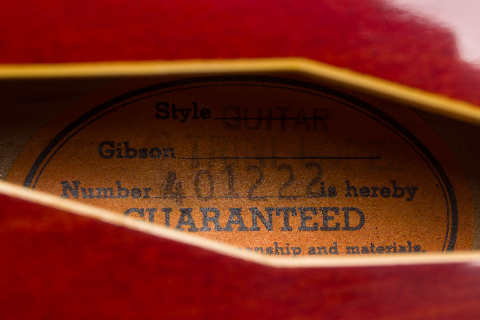 Gibson Trini Lopez Standard Model Semi-Hollow Body Electric Guitar (1966), made in Kalamazoo, Michigan, serial # 401222, cherry lacquer finish, laminated maple body, mahogany neck with rosewood fingerboard, original black tolex hard shell case.