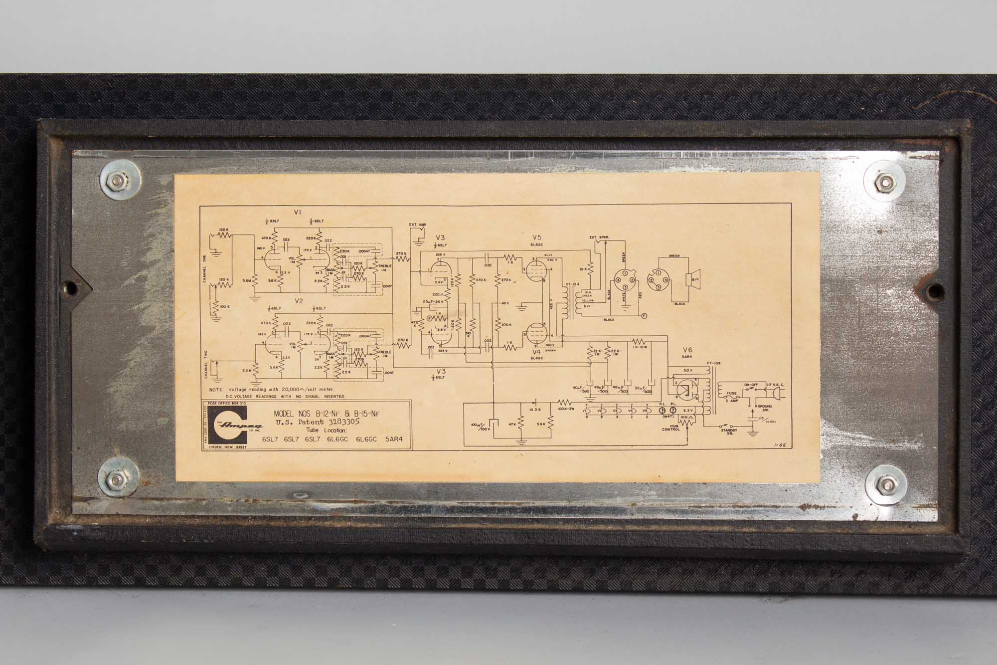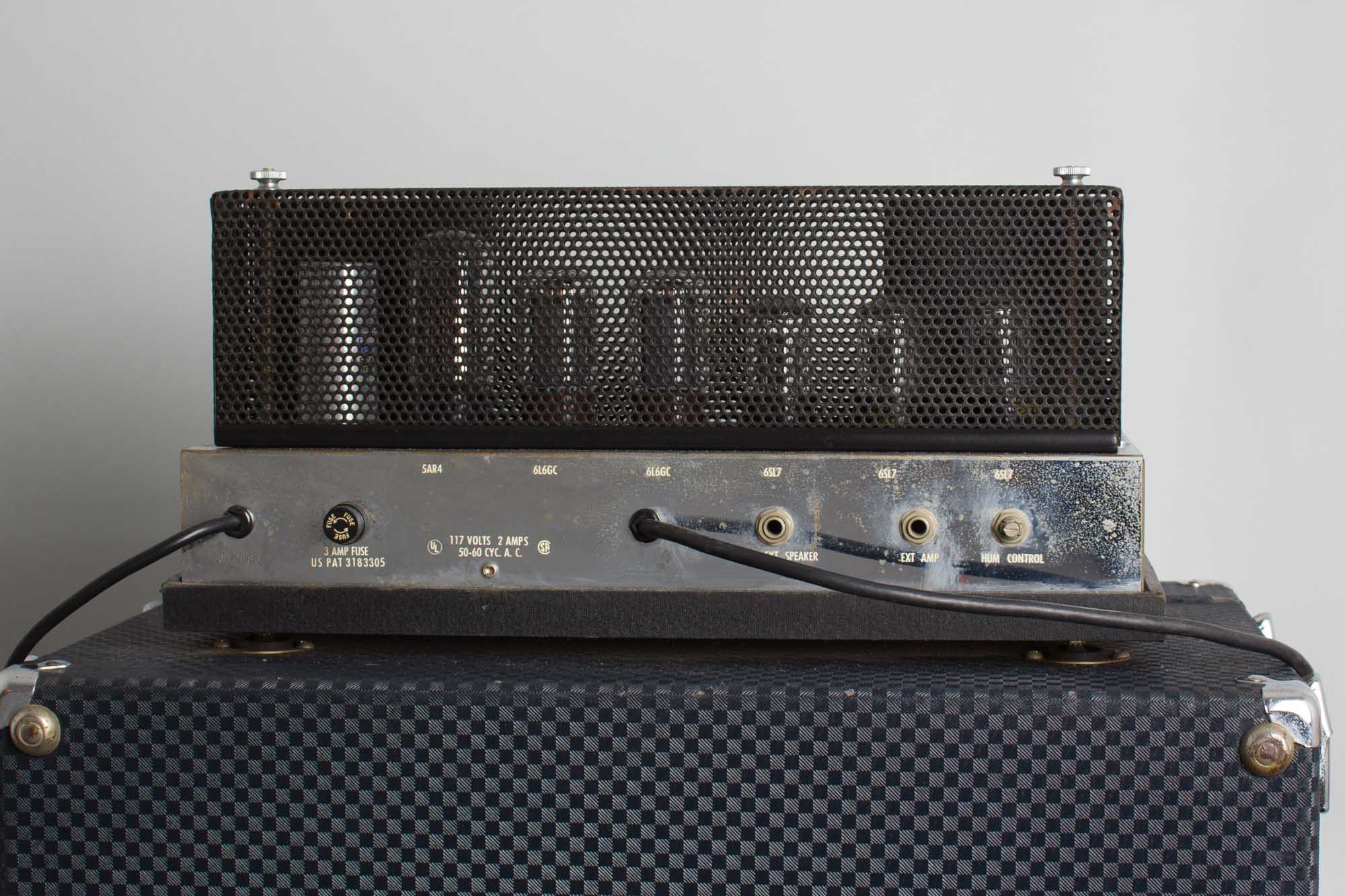 The B-15 saw a number of revisions through the first half of the 60s. This particular amp is the "NF" version, where Ampeg decided to go back to a single baffle design that was further recessed from the front. The power section was redesigned for fixed bias, offering an increase in efficiency and headroom, now putting out ~30 watts of power over its 25 watt predecessors. The amp otherwise has the same features as earlier revisions; two channels, each with its own volume, treble and bass controls, guitar and bass inputs for channel one and an instrument input for channel two. The push-pull 6L6-driven power section puts out roughly 30 watts into a single 15" speaker.