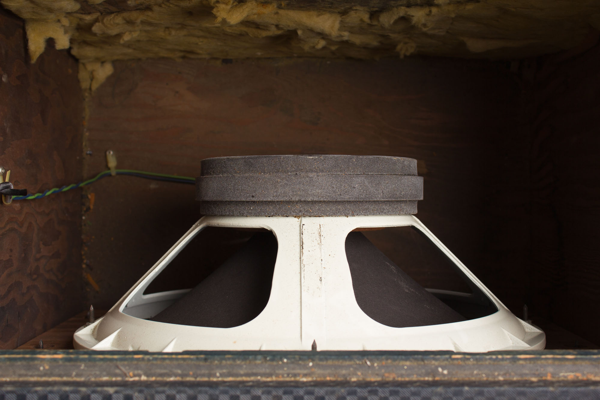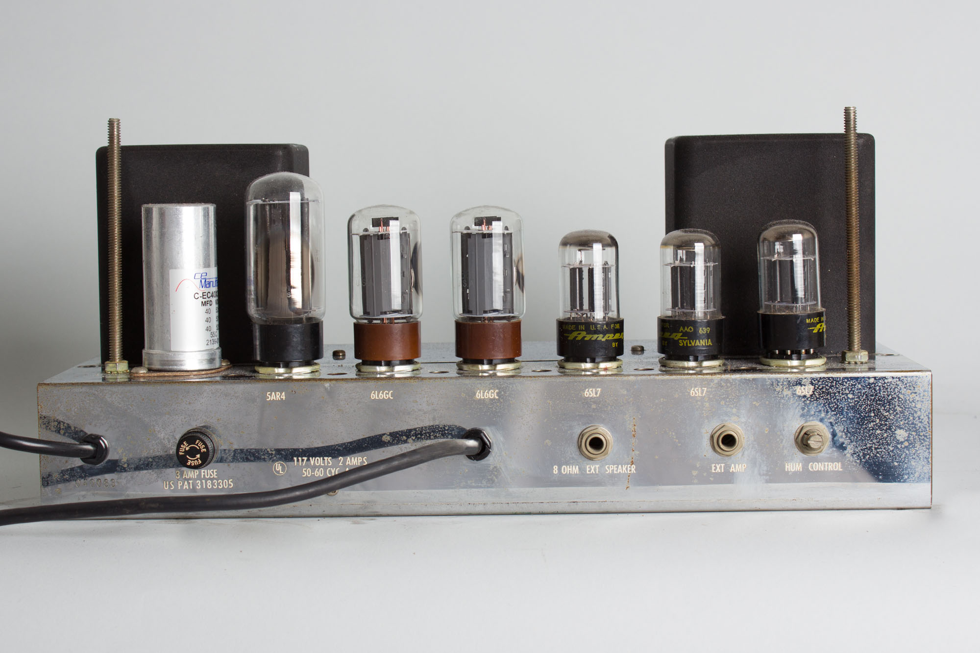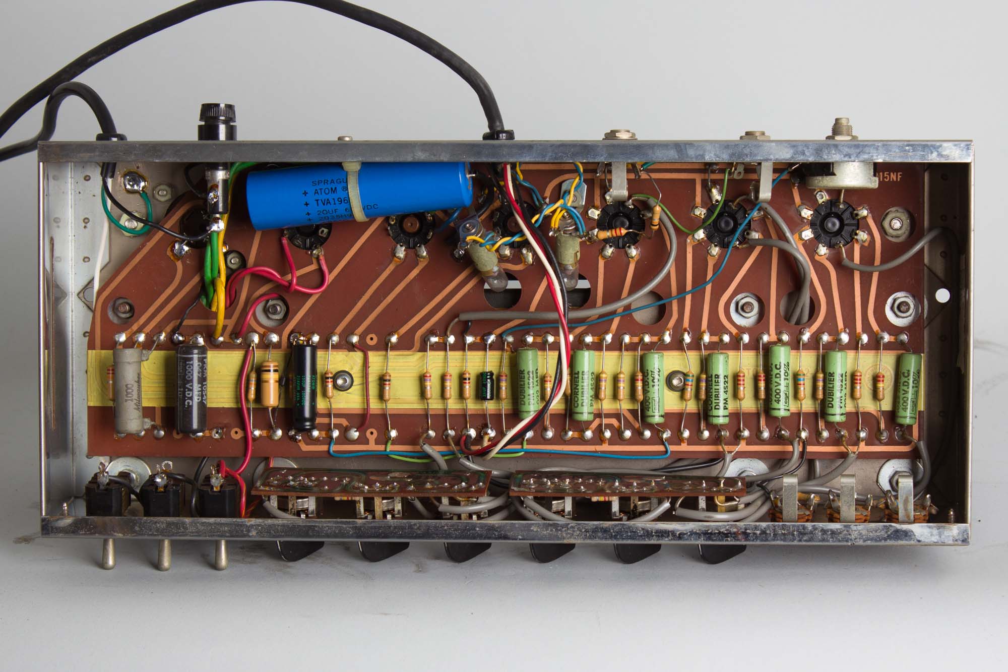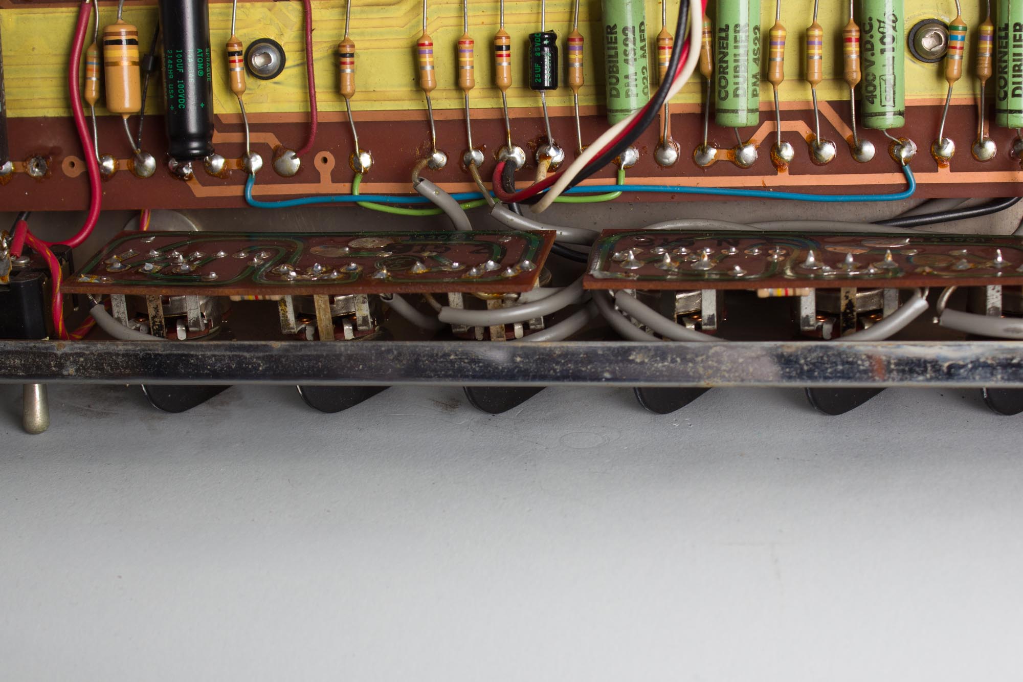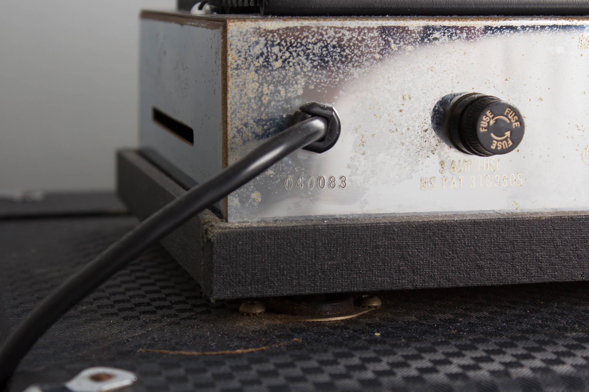 Internally, this amp remains nicely original. The serial number dates the chassis to 1966. The speaker is the original or at least a period 15" Altec 421A, commonly seen as an option around this time. The speaker bears the serial number 04860 and still retains its original cone and sounds great. The amp has seen our typical servicing and maintenance, including replacement of all electrolytic capacitors, adding a grounded 3-prong power cord, cleaning of all sockets, pots and jacks and biased to spec.
