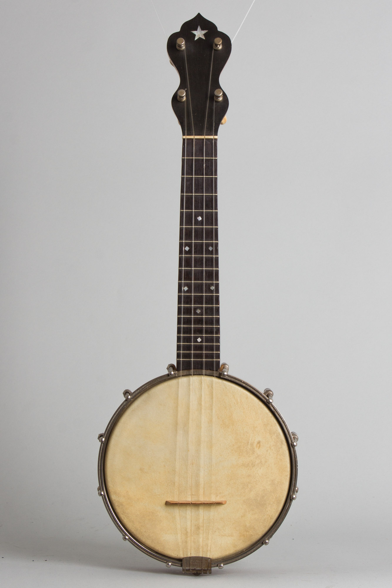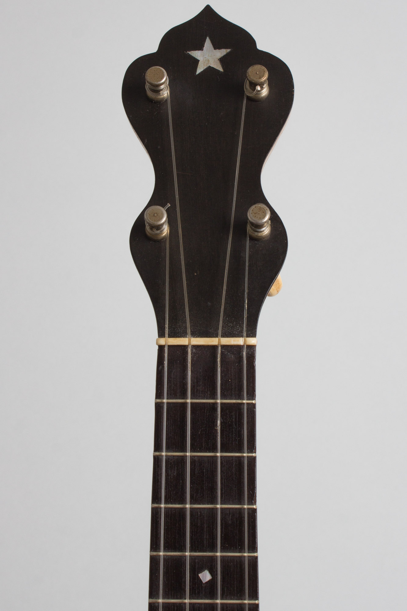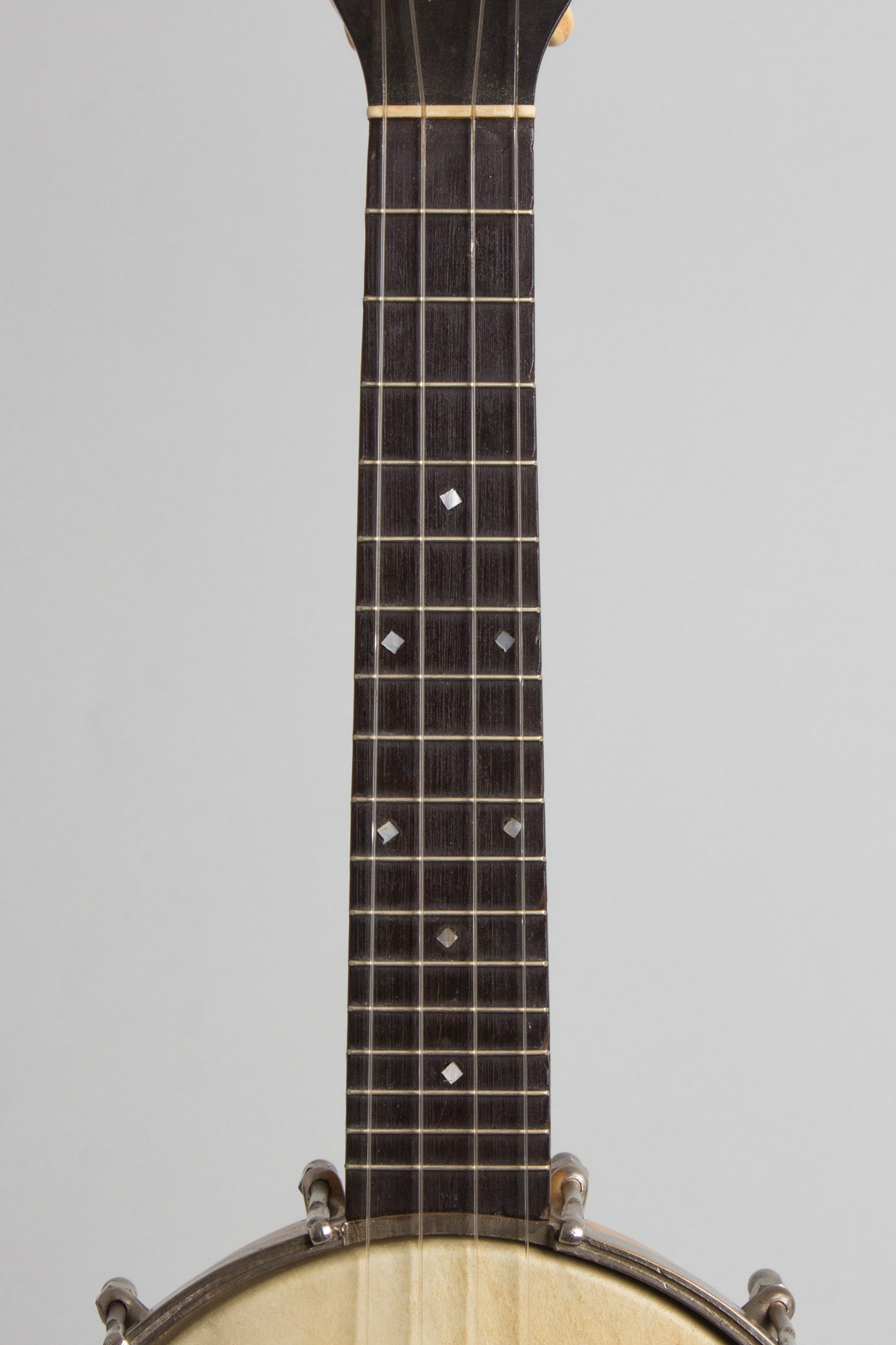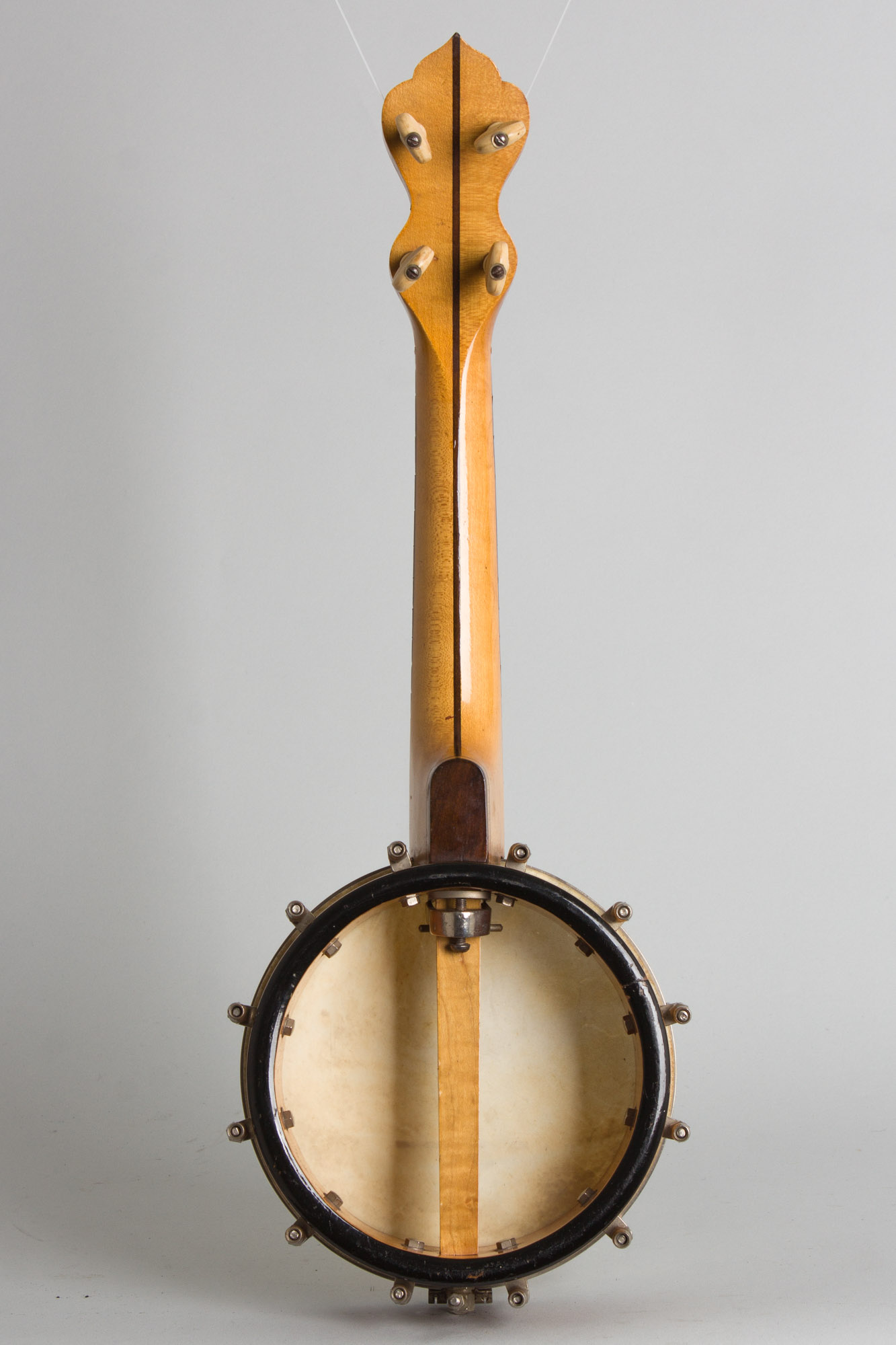 This is a very nice example of an earlier 1920's-style better-grade blonde Slingerland-made banjo uke. It is unbranded (as most were) but is definitely the work of this Chicago company, who built something like 90% of the inexpensive banjos of the 1920s. The 3-ply laminated neck and 7" openback rim are finished in natural maple, with some nice burl figure on the rim. The ebonized fingerboard has pearl diamond inlay, the banjo-shaped headstock is covered with a plain ebonized veneer sporting one inlaid pearl star. The hoop is heavy gauge, the hooks good quality and the nickel bent-metal tailpiece is marked with the "Bell Brand" logo. This cute little instrument is quite loud and very snappy player with that already-recorded-on-a-78 tone.