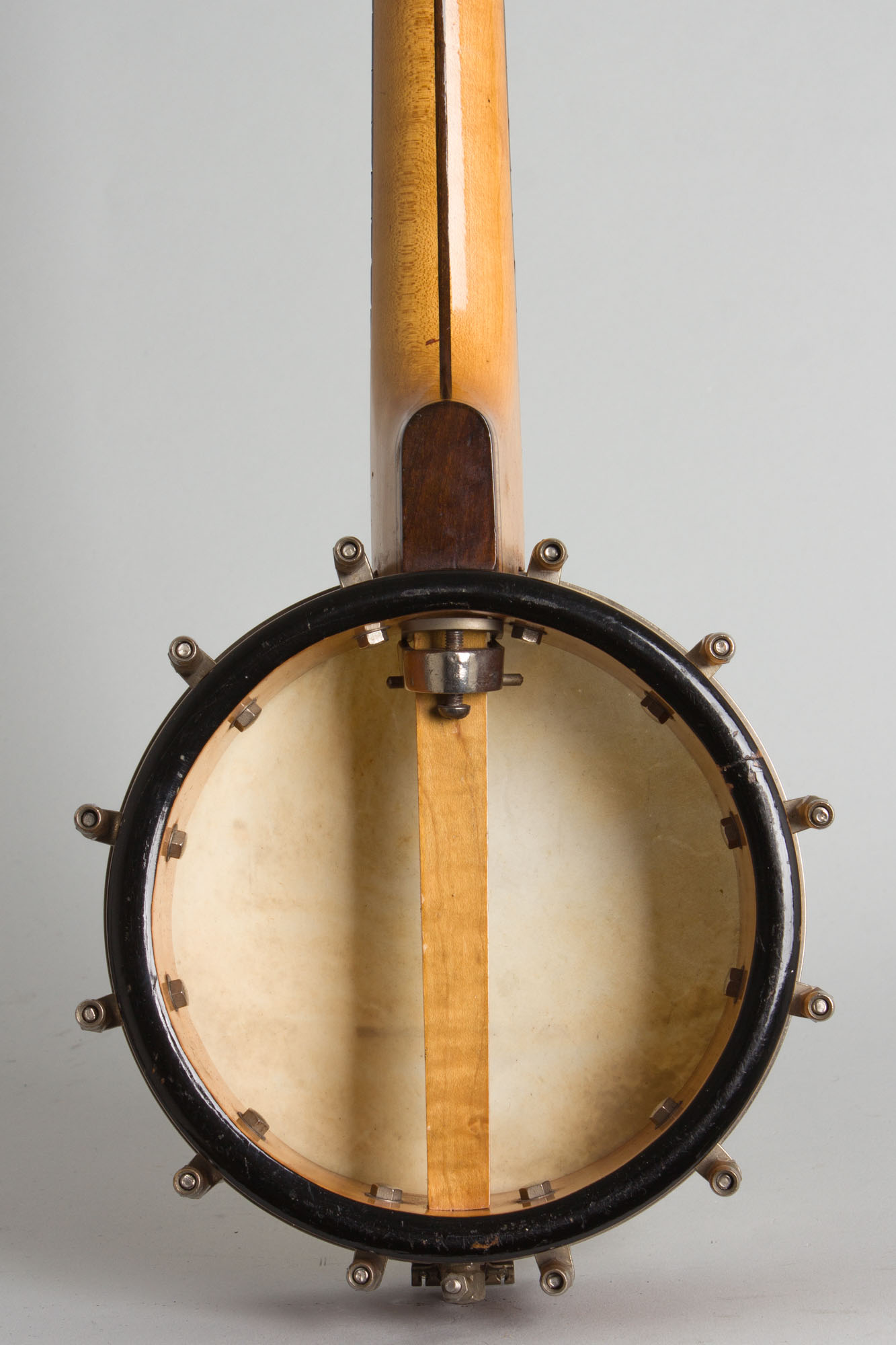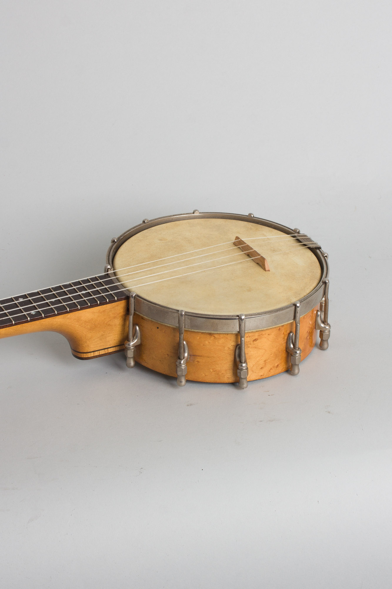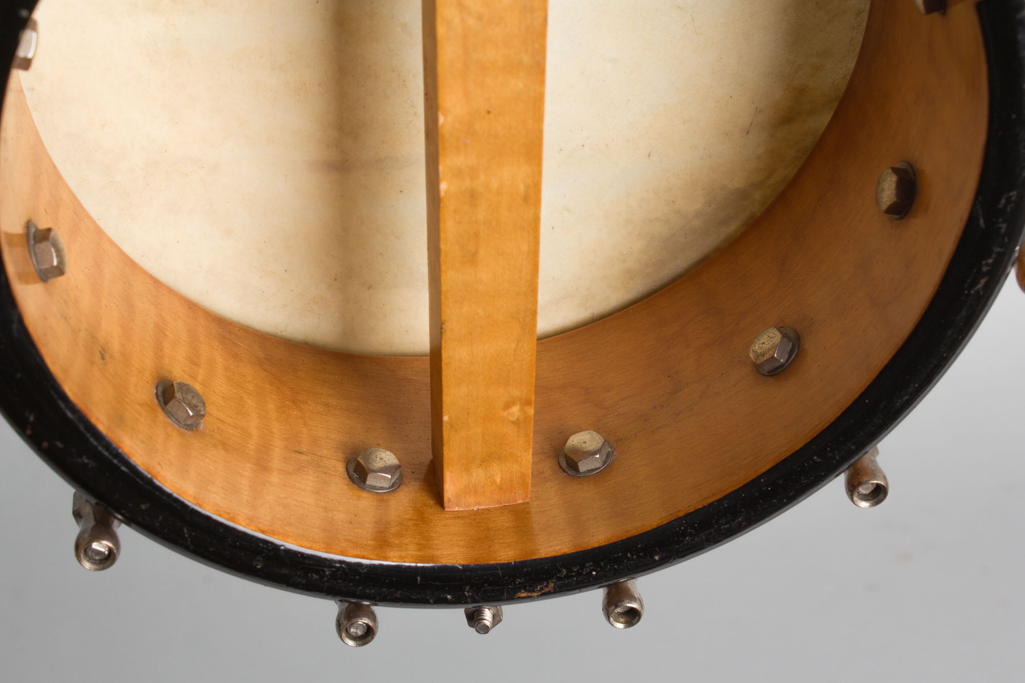 This is a very nice example of this lovely about 100 year old and perhaps slightly overbuilt instrument. It remains in clean original condition, with no repairs or alterations. The blonde finish has only very minor wear and the plating on the hooks, nuts, and other hardware has a few minor corrosion spots. The bridge is a period, but cut down somewhat, the genuine calfskin head appears original or at least period. This blonde Slingerland sounds raucously delightful, a fun instrument to play that never fails to bring a smile when strummed. Overall Excellent Condition.