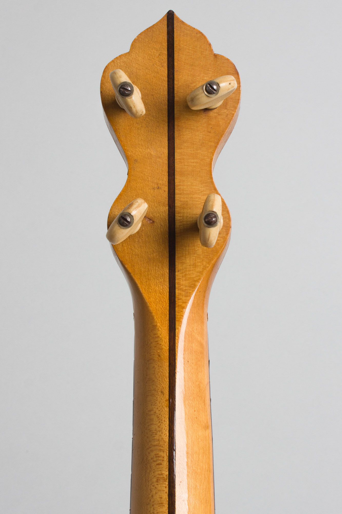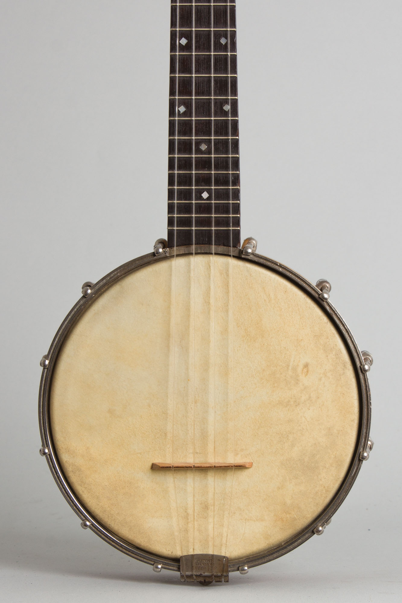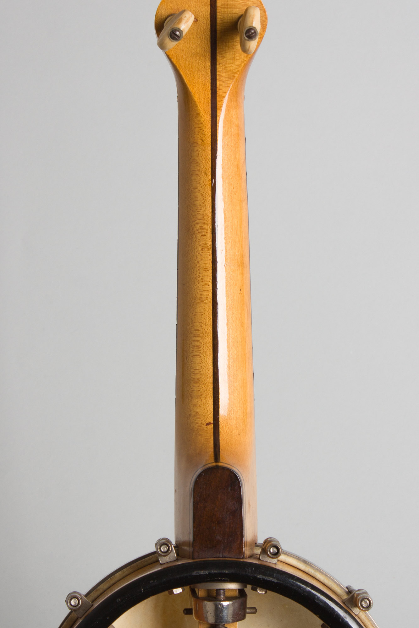 This is a very nice example of this lovely about 100 year old and perhaps slightly overbuilt instrument. It remains in clean original condition, with no repairs or alterations. The blonde finish has only very minor wear and the plating on the hooks, nuts, and other hardware has a few minor corrosion spots. The bridge is a period, but cut down somewhat, the genuine calfskin head appears original or at least period. This blonde Slingerland sounds raucously delightful, a fun instrument to play that never fails to bring a smile when strummed. Overall Excellent Condition.