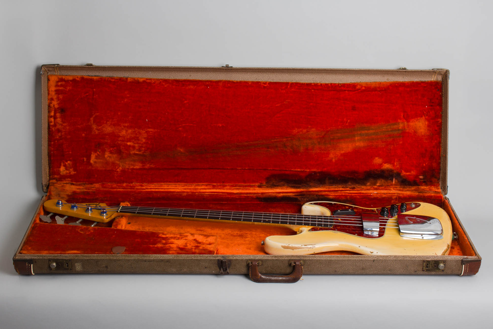 Fender Jazz Bass Model Solid Body Electric Bass Guitar (1962), made in Fullerton, California, serial # 89514, Blonde lacquer finish, ash body, maple neck with rosewood fingerboard, original brown tolex hard shell case.