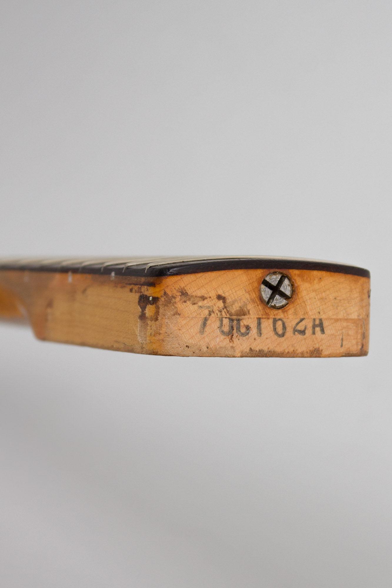 The original finish shows wear basically everywhere but no added overspray or alteration. The body has numerous scrapes, dings and dents with a small spot of finger wear into the wood above the pickguard. The back of the body has many dings and scrapes and several large spots of buckle wear, the edges endless dings and dents. The screw holes in the top ahead of the bridge for the original mutes have been filled in somewhat sloppily. The original bridge itself is relatively clean; the large chrome cover was likely in place for much of the instrument's life, as indeed it still is. The center chrome pickup cover is the correct style but a later piece. And something we have never seen before; soldered to the bottom strap button is a hook that appears to be intended for hanging a Gris-Gris bag or some similar Mojo item. THAT we did not dare disturb!