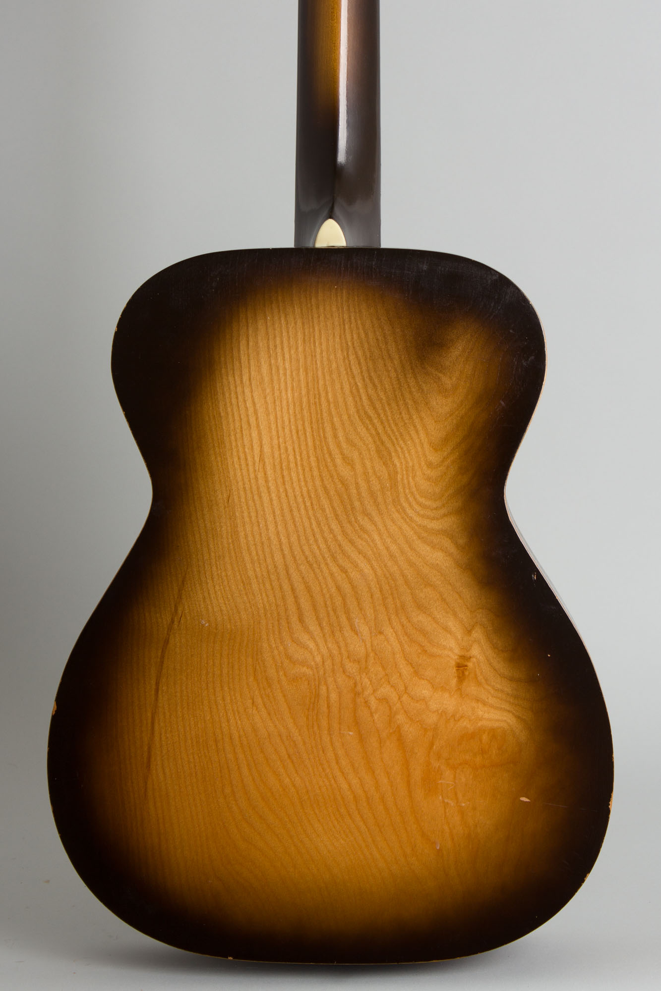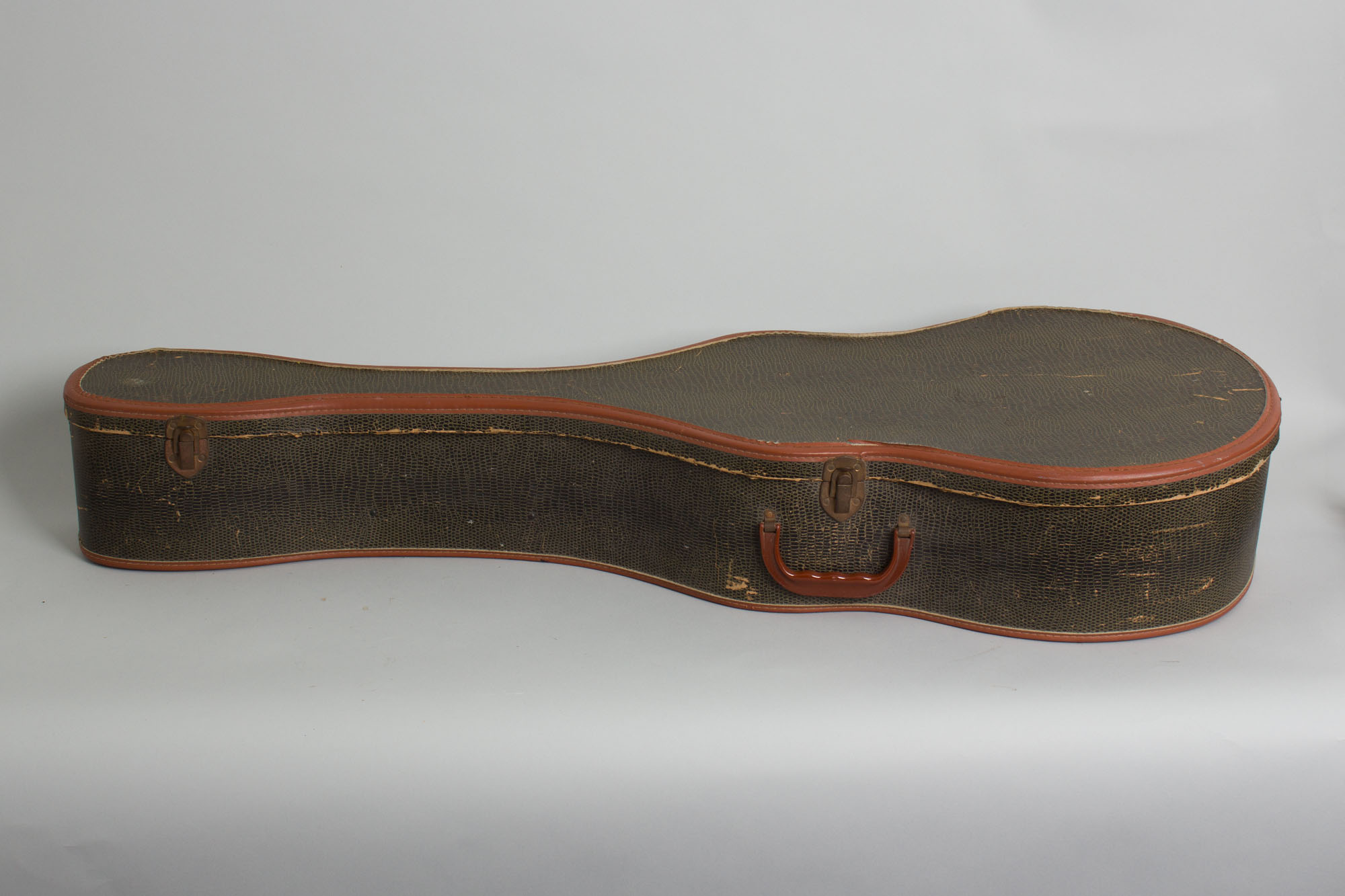 This guitar remains overall relatively clean with some typical light wear. There are a few dings and scuffs on the top, and chipping to the body edges; the top's "binding" is actually painted on! This is heavier on the "unbound" back edge than the front; there a couple of deeper scrapes to the sides from contact with the case. The ladder-braced top is very solid and the entire guitar is crack-free. There are DeArmond bites (small screw holes and some scarring from the bracket) to top on either side of soundhole; these could be patched if desired or a period DeArmond pickup re-installed.