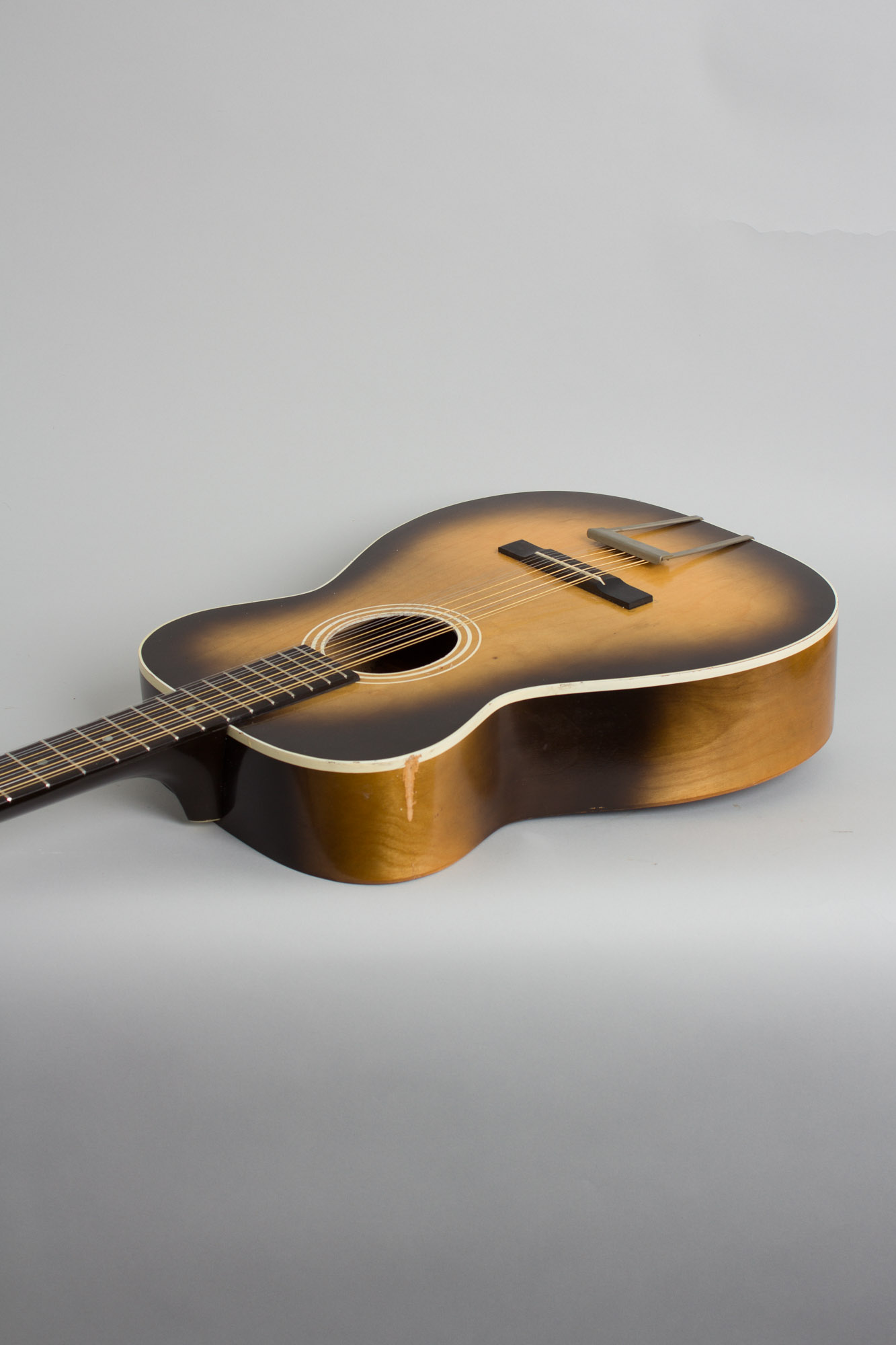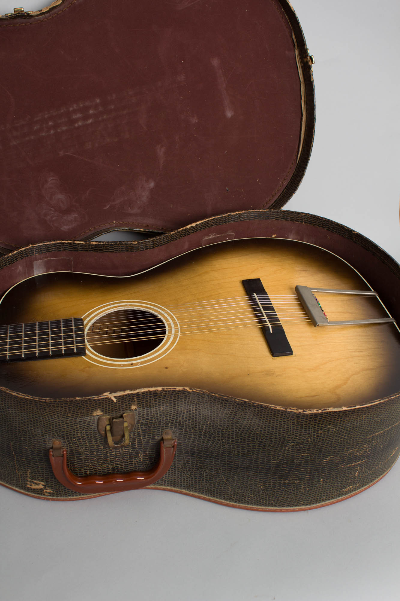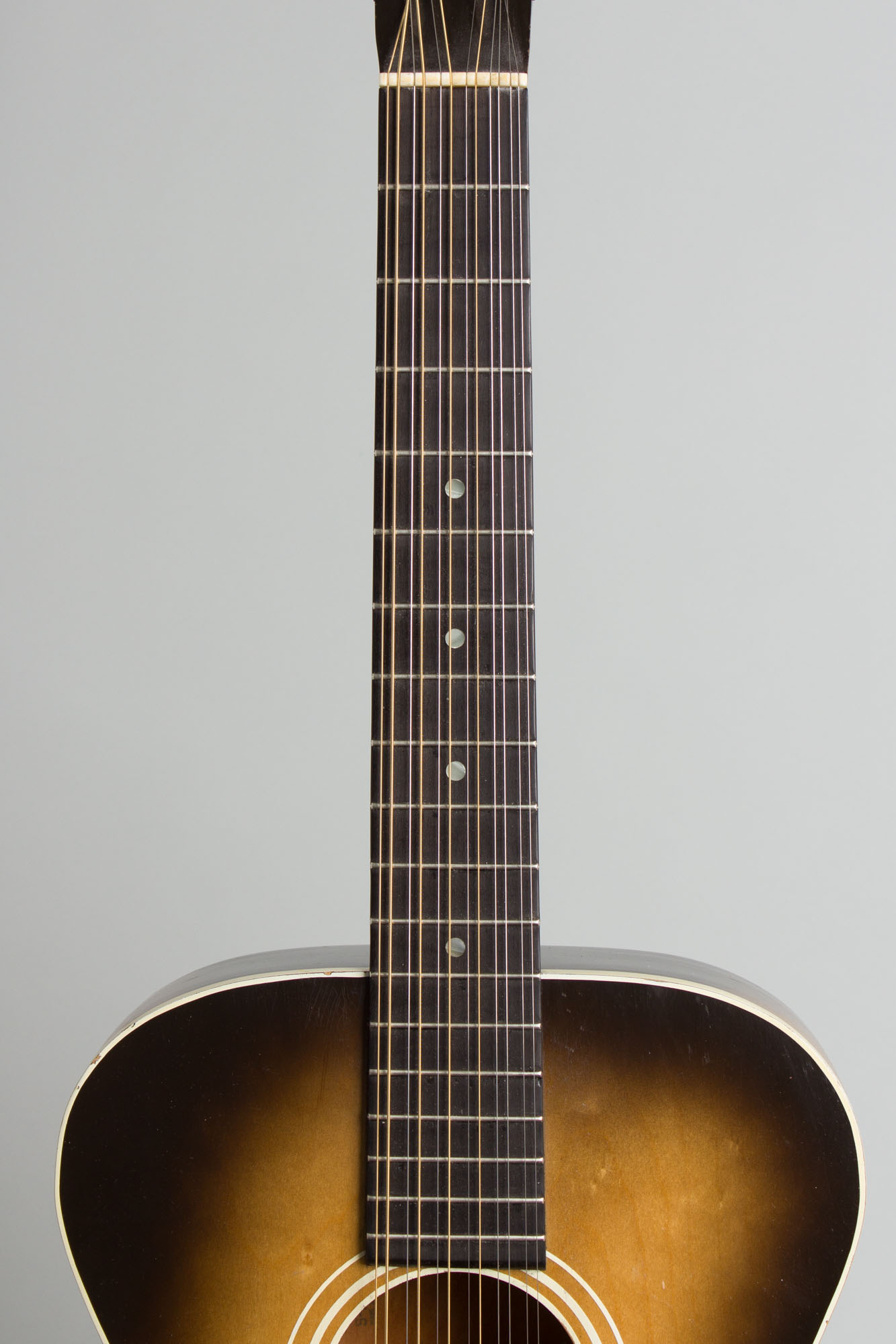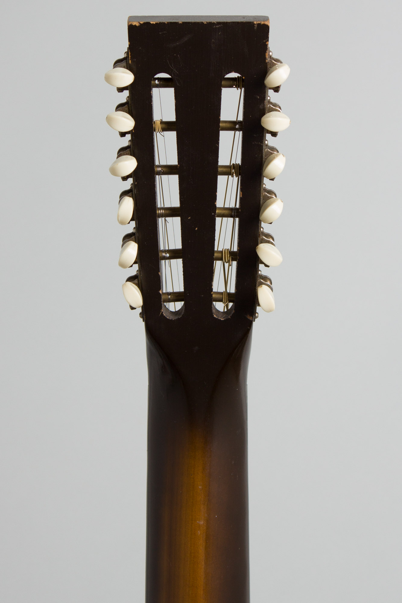 1964 was the last year for this older style round-body Harmony-Stella Model 922, re-born the next year as the slimmer-waisted H-912. This older version has a big powerful sound, and when it was built was still the only mass-market choice for an auditorium sized 12-string. At this point Gibson, Martin and Guild were not yet bringing higher-grade 12-string flattop instruments to market so in 1961 the venerable 922 was pretty much your only choice for Piedmont blues and Leadbelly songs! Humble perhaps, the H-922 is still in its own way a very cool and fairly unique instrument.