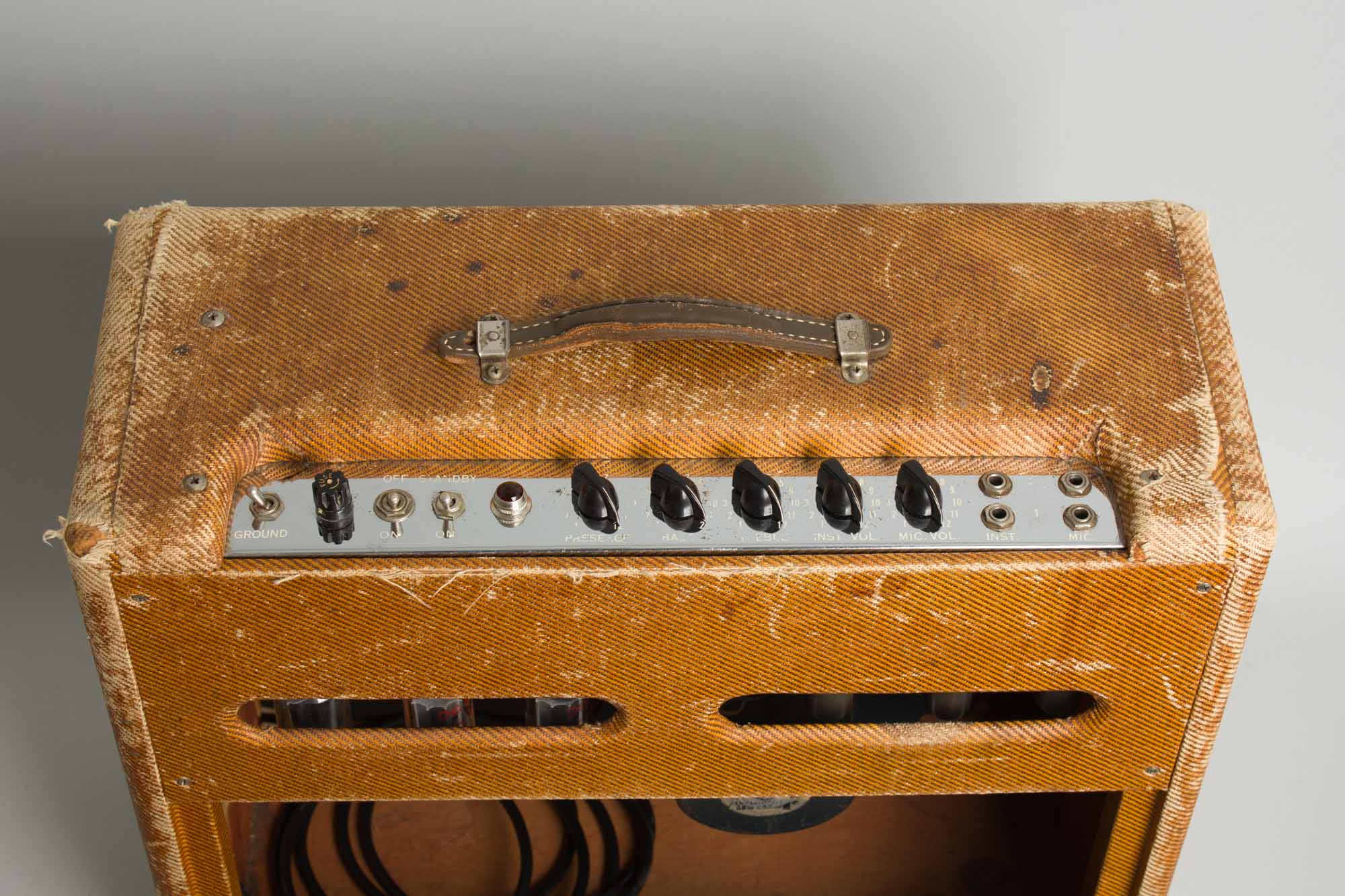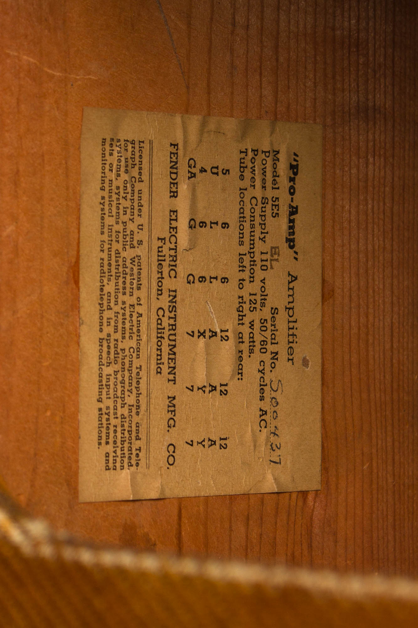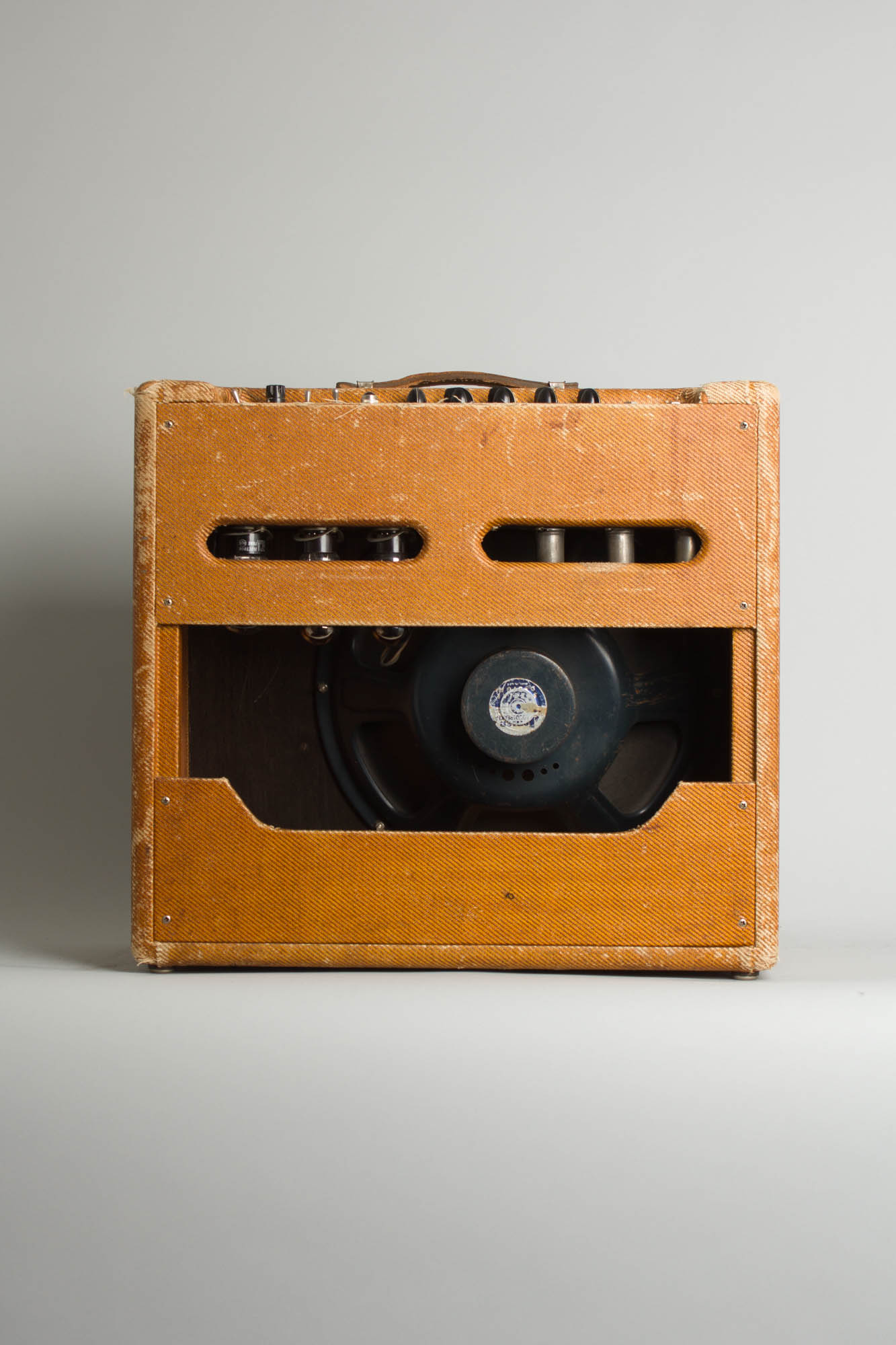 This is a very nicely preserved example overall. The tube chart bears the stamp "EL" indicating assembly in December of 1955. According to available serial number records, Fender only made around 700 5E5 Pro models that year, far less than several of the smaller combos. Cosmetically, the tweed covering shows it's fair share of use, including some heavier fraying and wear around corners and edges. Overall it remains in good shape and bears a very attractive patina. The grille cloth is nicely intact and clean overall with some light fraying here and there. The control panel is nicely shiny, though some of the stenciled lettering has worn off. The handle appears to be an older replacement.