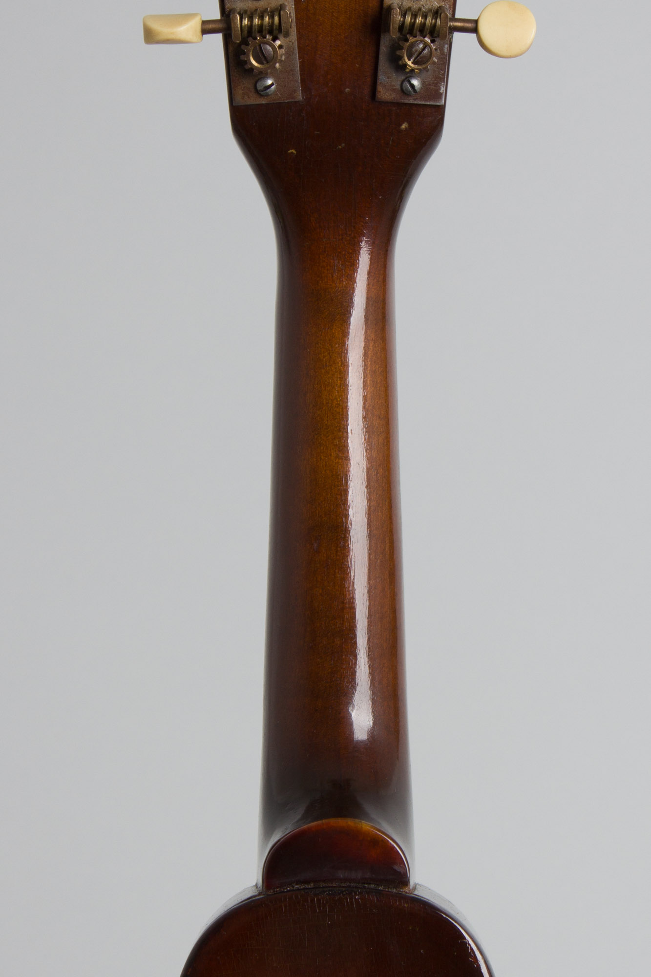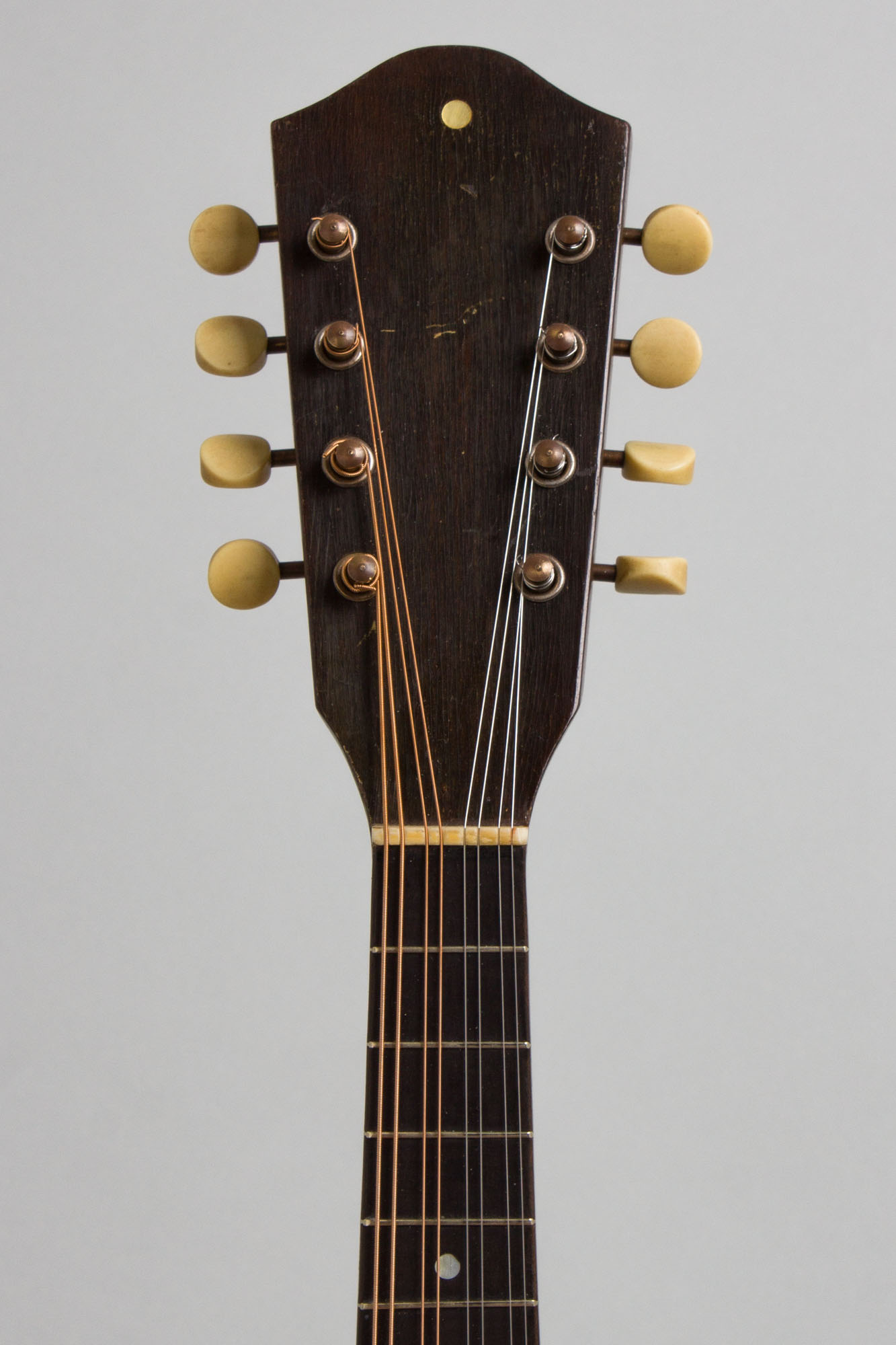This older mandolin has a pressed arched top and back with an elevated fingerboard and bridge. While not carrying any markings it is definitely a Strad-O-lin product, with many cosmetic and construction features similar to their common F-hole models. The inlaid line around the top is a typical Strad-O-lin feature, as is the body shape and blocky heel. The neck is fairly chunky for a period mandolin with a deep "U" profile, the top and back relatively thin giving it a bright peppy sound. The elevated pickguard is oddly truncated but appears original. While not a high-end instrument this is a rare and interesting product of this somewhat obscure NY area maker, and a fun mandolin to play.