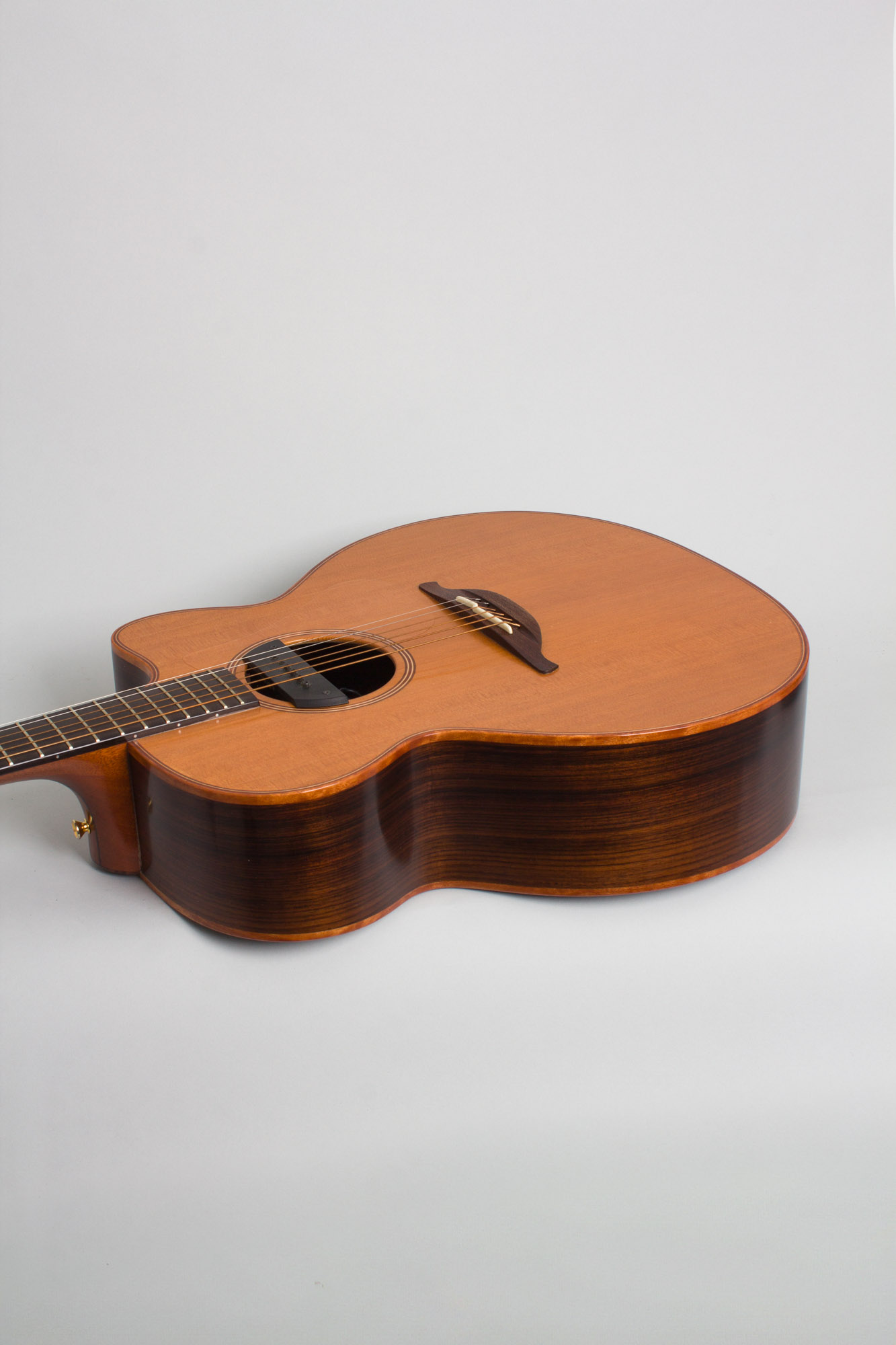 These innovations find a worthy showcase in the O-25, one of Lowden's most recognizable and popular models and part of what they call their "Original Series." This well-preserved example is the "C" version of this flagship model denoting the addition of a Venetian cutaway to the smaller jumbo-esque (in shape) "O" style body; it is a versatile, dynamic instrument with rosewood back and sides with a warm, rich sound from the red cedar top. The comfortable five-piece laminated rosewood and maple neck is crowned off with golden Gotoh SG381 tuners and an ebony fingerboard and may be a comfortable option for a fan of a smaller, more concert-sized instrument with a little more physical depth than, say, a Martin 000.