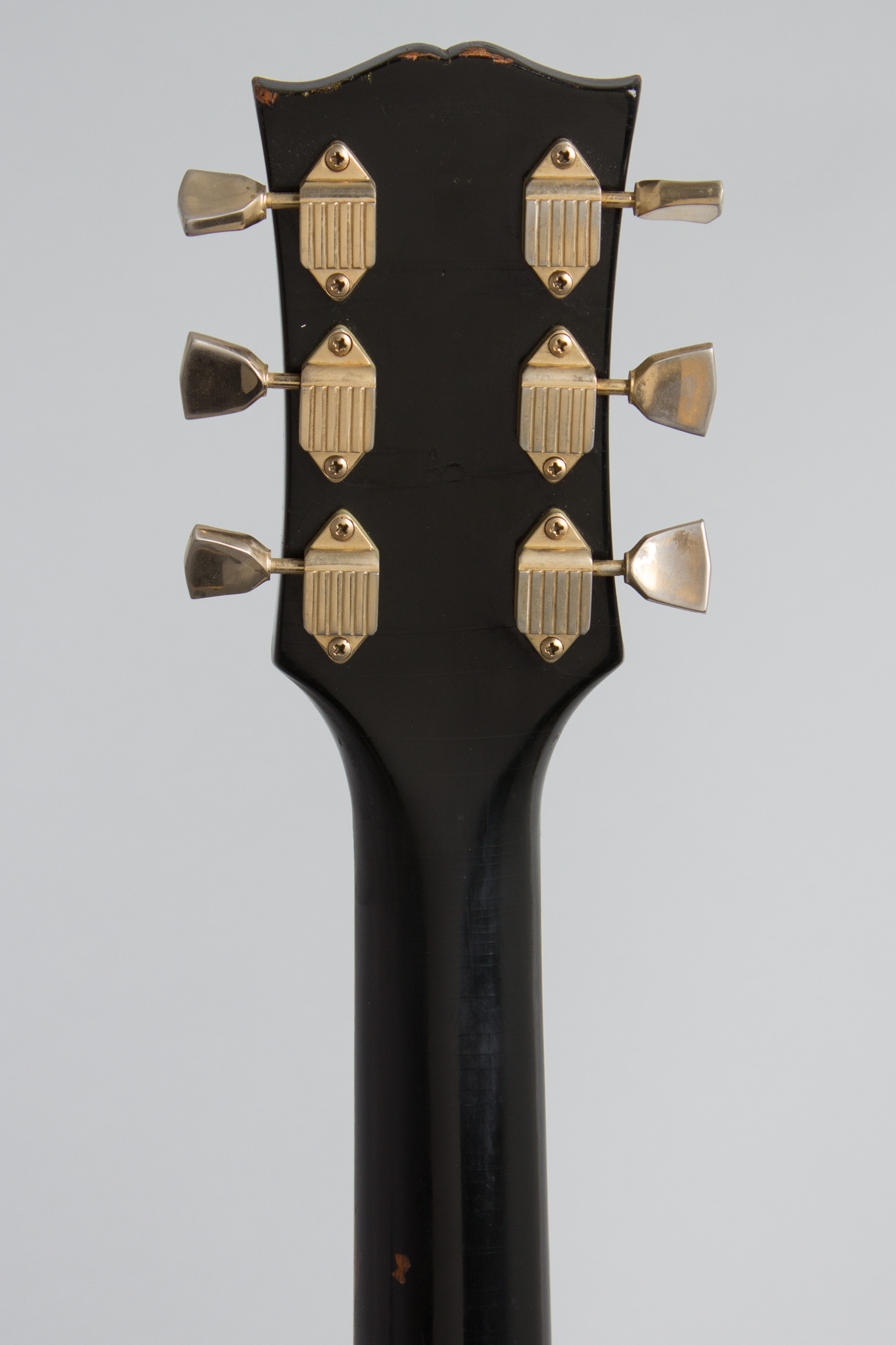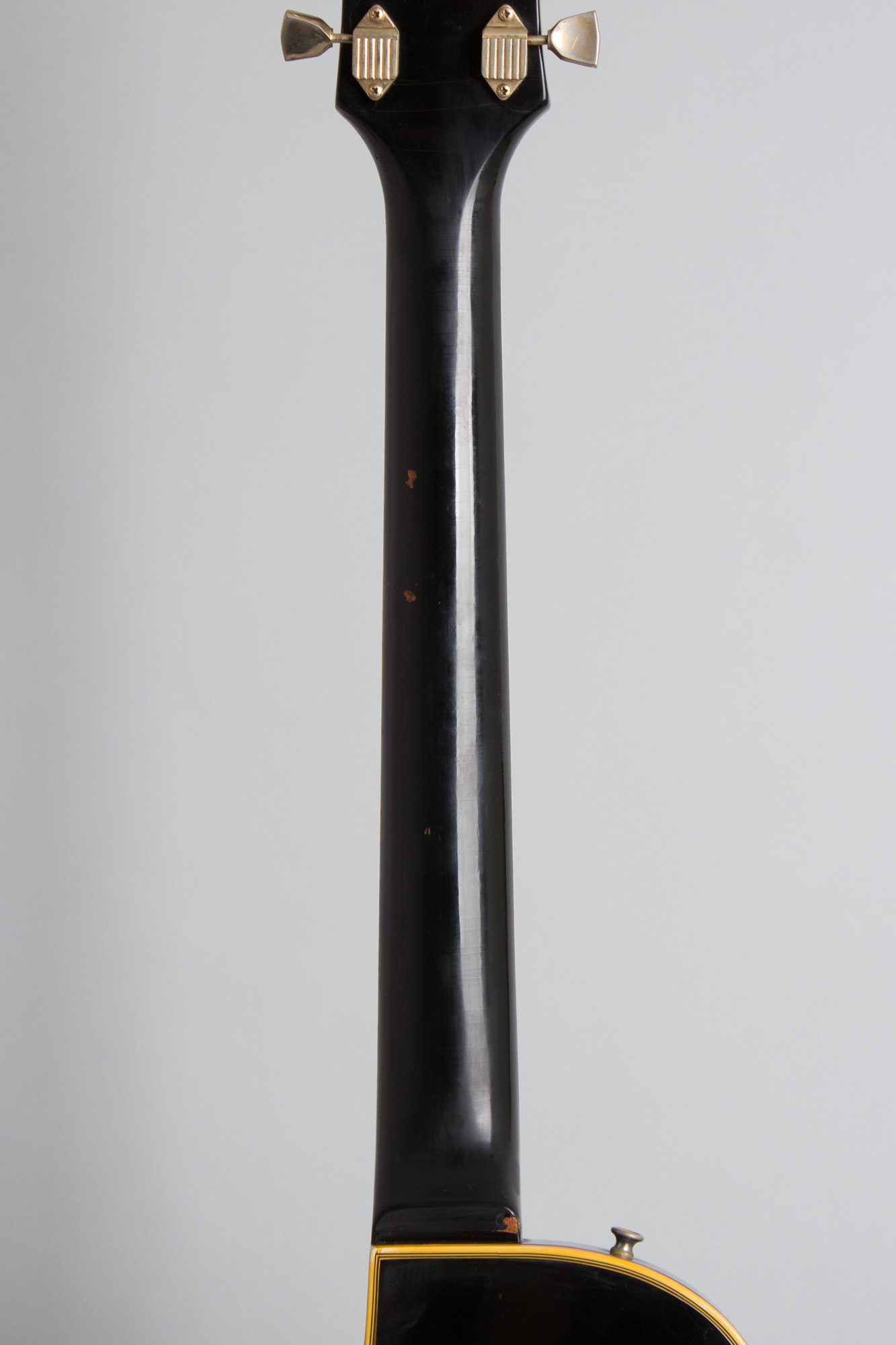 Overall this is a nicely preserved original guitar; played but well-cared for and never abused. The all-original black lacquer finish has a beautiful look and still gleams in ebony splendor, with some small dings and dents but no large areas of loss. There are a couple of deeper dings on the side down by the jack, with what appears to be the original plastic jackplate still intact. There are scratches and buckle marks on the back into but not through the finish, with one chip to the wood off the back of the heel. The top is mostly relatively clean overall but does have some small pick marks above the strings. The back of the neck has some edgewear on the treble side and a pair of feelable dings in the 3-4th fret area.