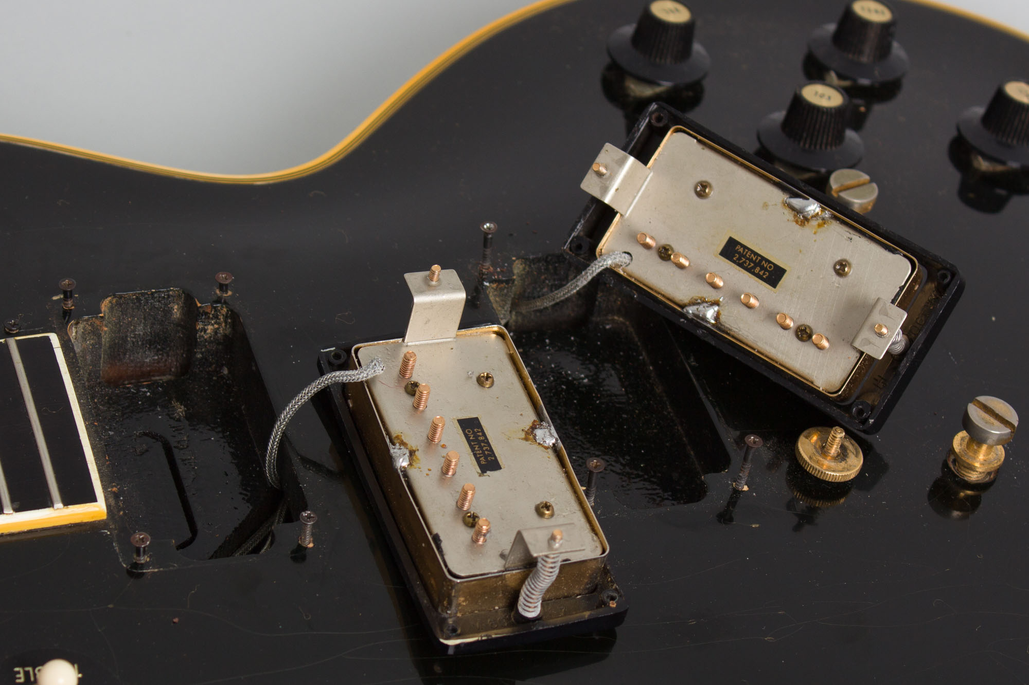 The gold plating on the hardware is somewhat worn overall; most heavily from the pickup covers and the bridge ends. The original "Patent number" pickups and wiring remain original including the 1968 dated pots and Sprague "black beauty" caps. Two stop tailpieces are included; both appear correct '60-70s period pieces and the cleaner of the two is currently mounted. The white plastic switch tip has a small crack at the base. The pickguard looks to have been removed long ago; a replacement could be installed if desired but this guitar appears to have gone "guardless" practically from the beginning.