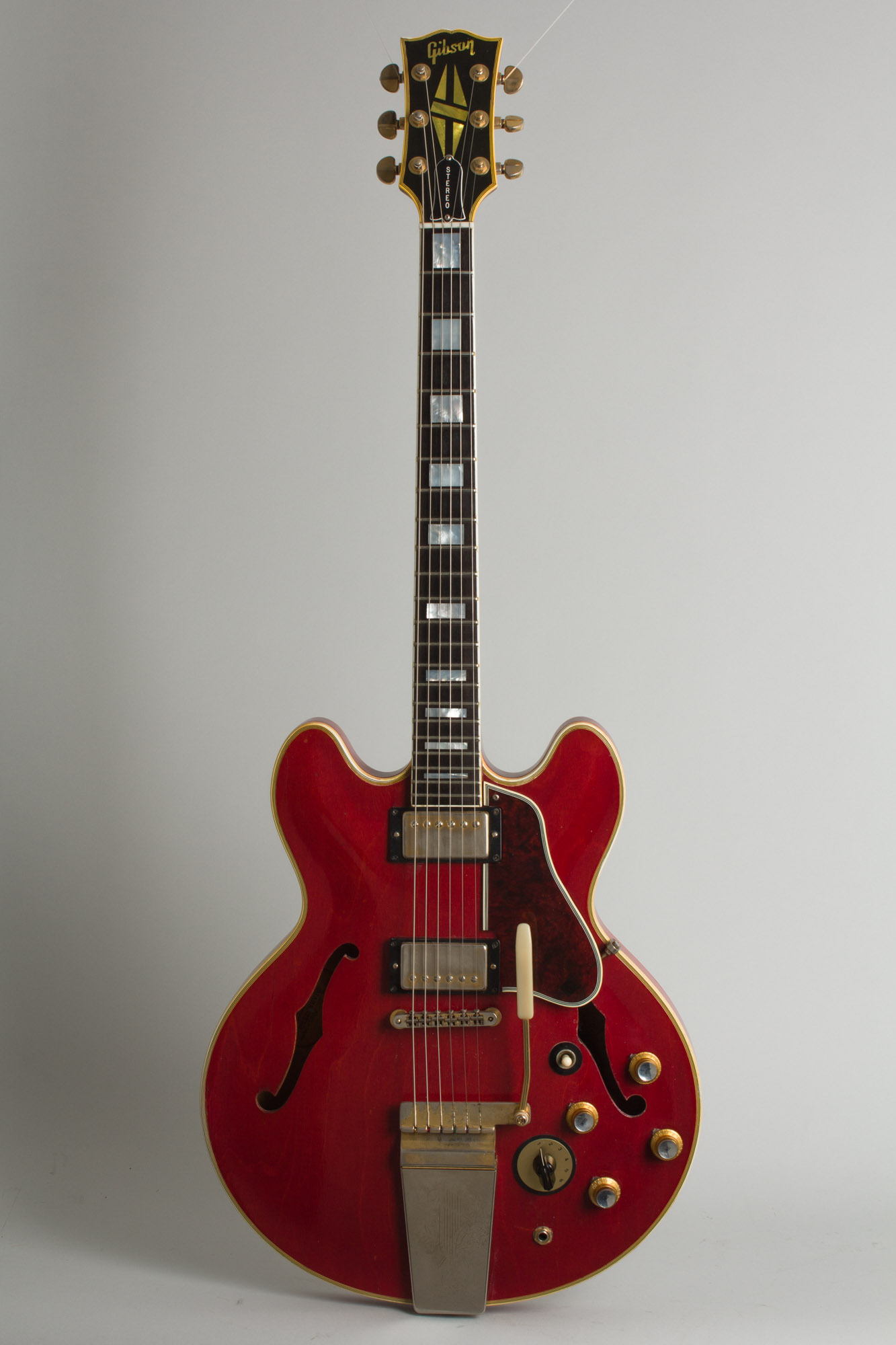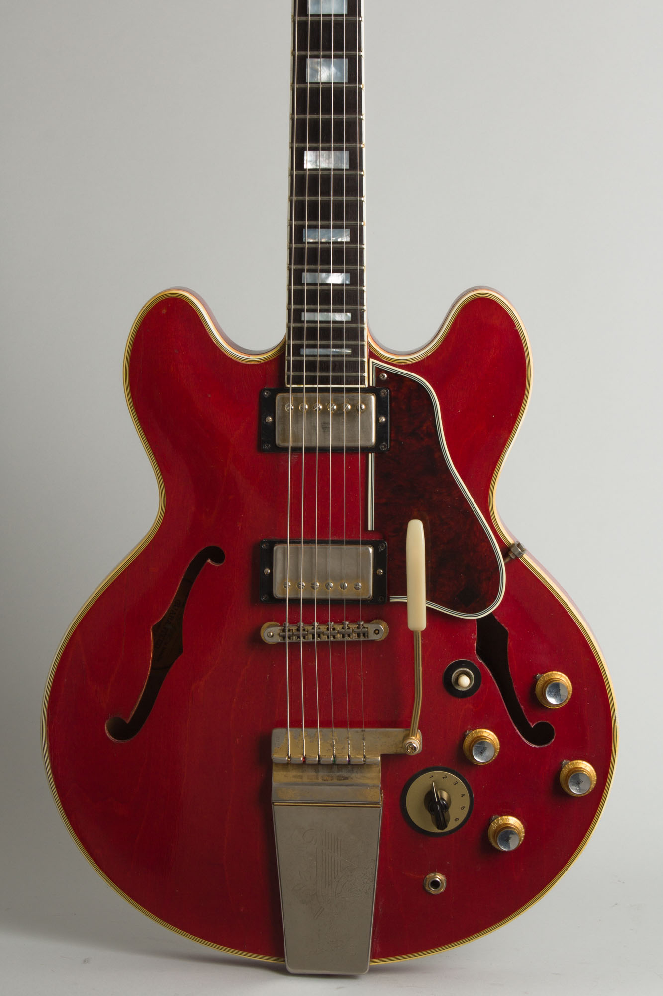 Only 137 cherry "SV" 355s shipped out of Kalamazoo in 1966 at a whopping list price of $775, plus $66 for the case. At the time Gibson claimed this model "Offers the accomplished artist an amazing range of sound" and it has always been known as a very classy and versatile instrument. While designed primarily with jazz and country players in mind, the ES-355 has long been considered one of the classic electric blues guitars, and virtually from its introduction was standard equipment for many of the seminal players in that genre, especially Chuck Berry and B.B. King. This one has paid its dues along the way and is ready to play "Everyday I Have The Blues" everyday, or pretty much anything else for that matter!